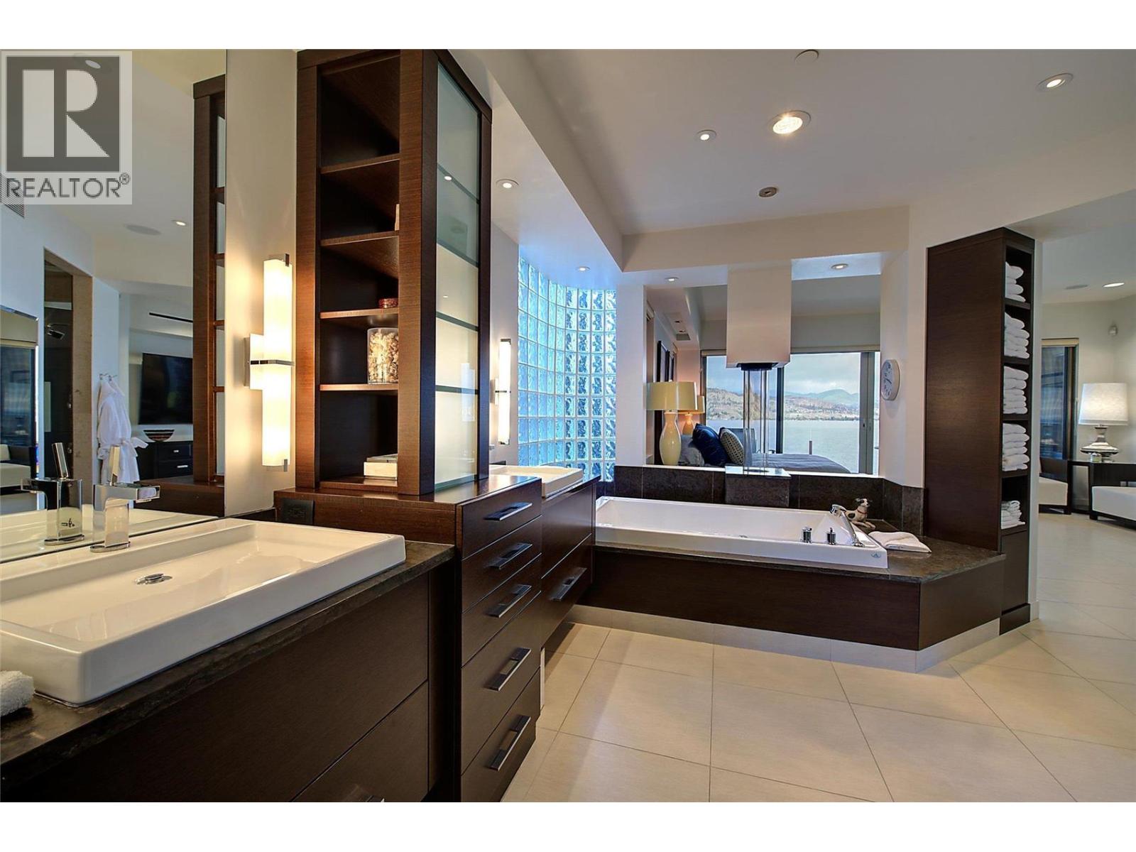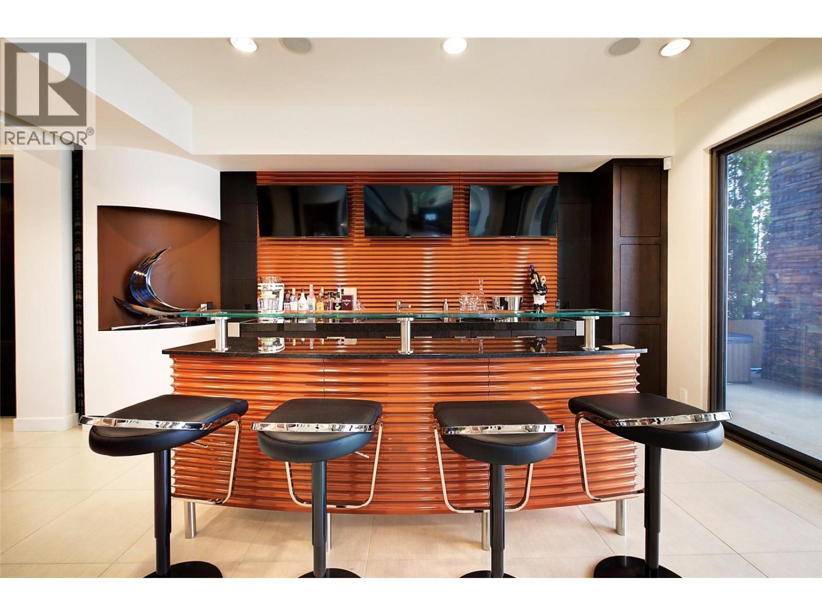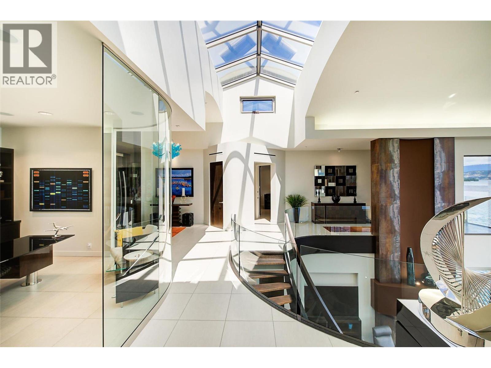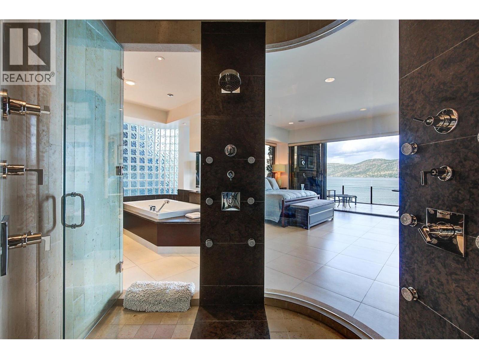 Nestled in the exclusive gated community of Sailview Bay, just 10 minutes from downtown Kelowna, this stunning 8,007 sq. ft. 4-bedroom, 8-bathroom estate is a true architectural gem. Designed with elegance and precision, it seamlessly blends luxury and comfort. From the moment you step through the grand glass entrance, the home’s quality and craftsmanship are undeniable. Spanning four levels with an elevator for easy access, it offers an exceptional layout. The upper level features three guest suites, each with their own private washroom, a laundry room, and a custom office. A tandem garage completes this level. The main floor is the heart of the home, boasting a spectacular primary suite with a spa-like ensuite and walk-in closet. A soaring great room with dramatic lake views flows into the dining area and gourmet kitchen. A secondary laundry and pantry ensure effortless functionality, while a second double garage provides easy access. Designed for entertaining, the lower level features a stylish bar, theatre room, and spa-inspired bath with a steam shower. Expansive patio doors open to an infinity pool, hot tub, and stunning outdoor lounge. Below, a private wine cave and poker room, carved into the cliffside, create a one-of-a-kind retreat. Waterfront amenities include a deep-water dock with two boat lifts, two Sea-Doo lifts, and a beachfront cabana with a private washroom. Offering luxury, privacy, and convenience, this is one of Okanagan Lake’s finest estates. (id:6770)