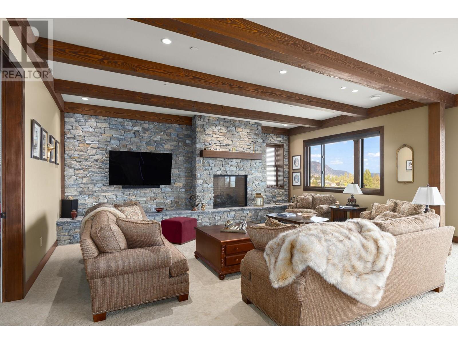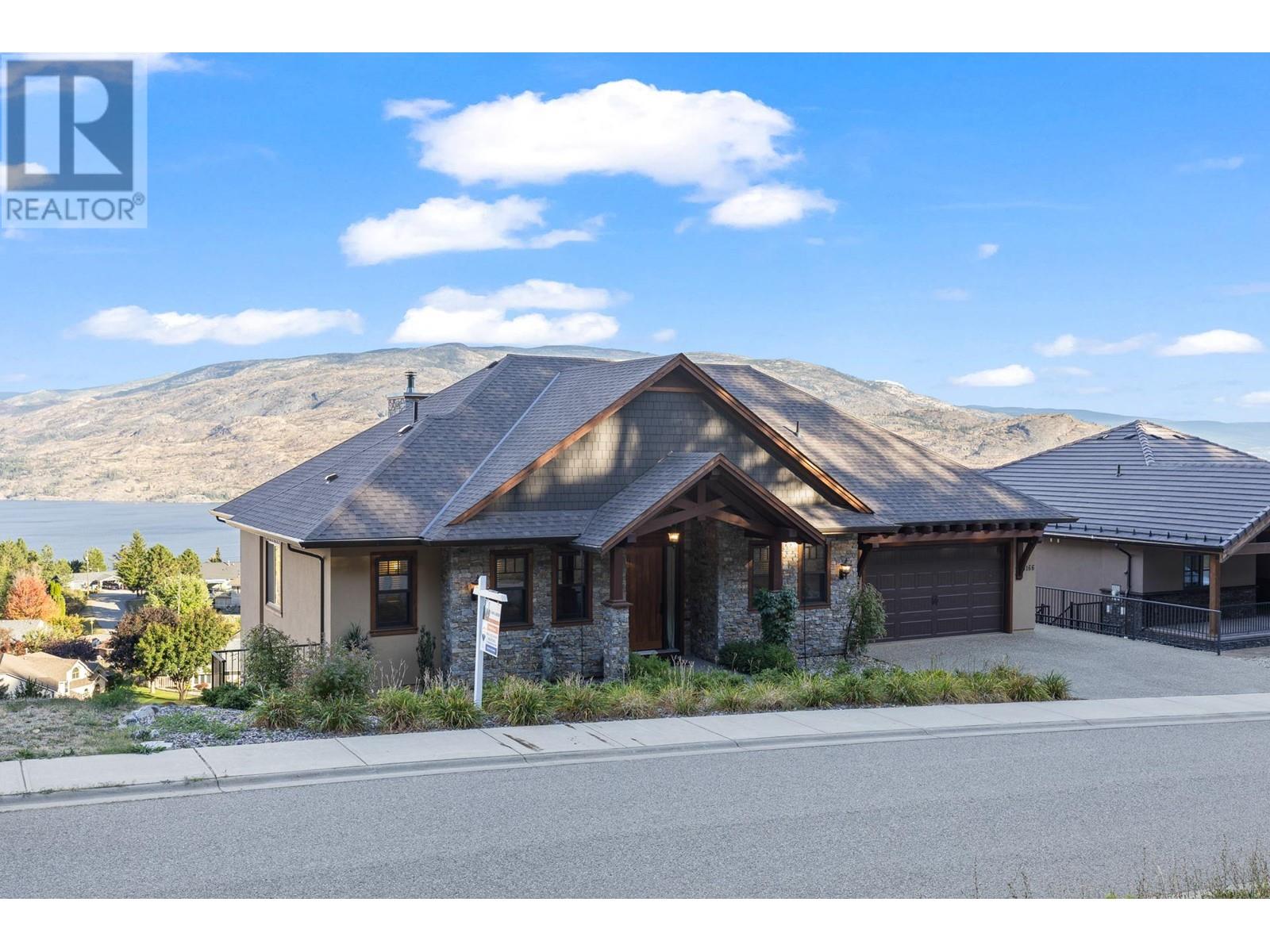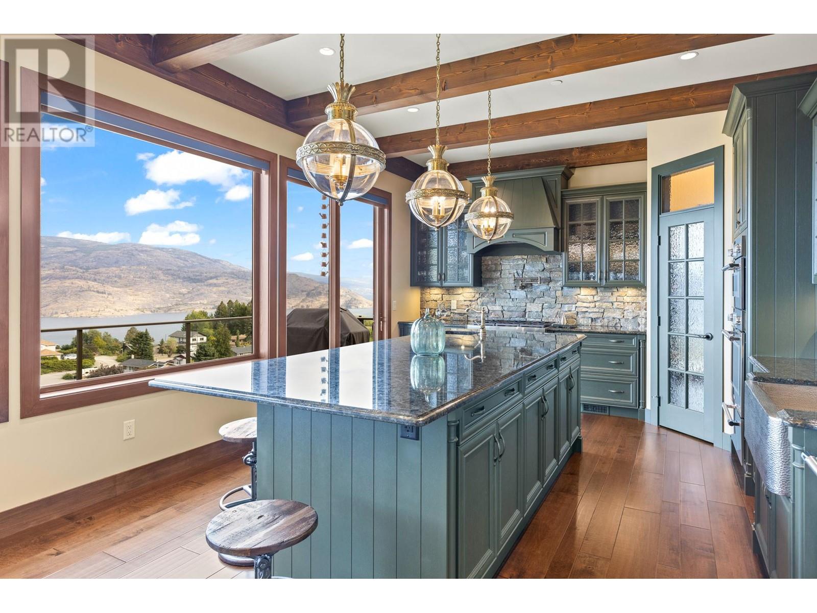 Over the top build quality with class, rich decor, soaring cedar beam ceilings and lavish finishings and elevator! Extremely rare and unobstructed views from Summerland to Kelowna on a peaceful cul de sac street. At over 4000 sq. ft. this home shows skilled craftsmanship and quality design. Maple hardwood floors, Kettle Valley Granite feature walls up and down and luxuriously decorated throughout. Enter into the main floor through an impressive 8 ft. solid hardwood door and be welcomed by the stunning lake views from the wall of wood windows in every room. Soaring 15 ft. vaulted ceilings, Gourmet custom kitchen off the dining room is complete with never used and WIFI controlled S/S Thermador appliance package including gas range with pot filler, granite counters, corner pantry, soft close cabinets and numerous windows for picturesque mountain and lake views. Ease of access from the living room & kitchen to the massive concrete stamped deck with natural gas BBQ hookups. Primary suite and second bedroom/office on main floor, 5-piece ensuite and spacious walk-in closet. Take the elevator downstairs to be greeted with unobstructed views, massive deck, another primary bedroom suite, full kitchen/wet bar (minus range), 2nd laundry set, high ceilings, spacious recreation room with stone wall huge gas fireplace. Canada's best waterfront strip and shops/dining is minutes away and with suite, there's room for the whole family. Suspended slab, 24"" concrete build quality...What a home! (id:6770)