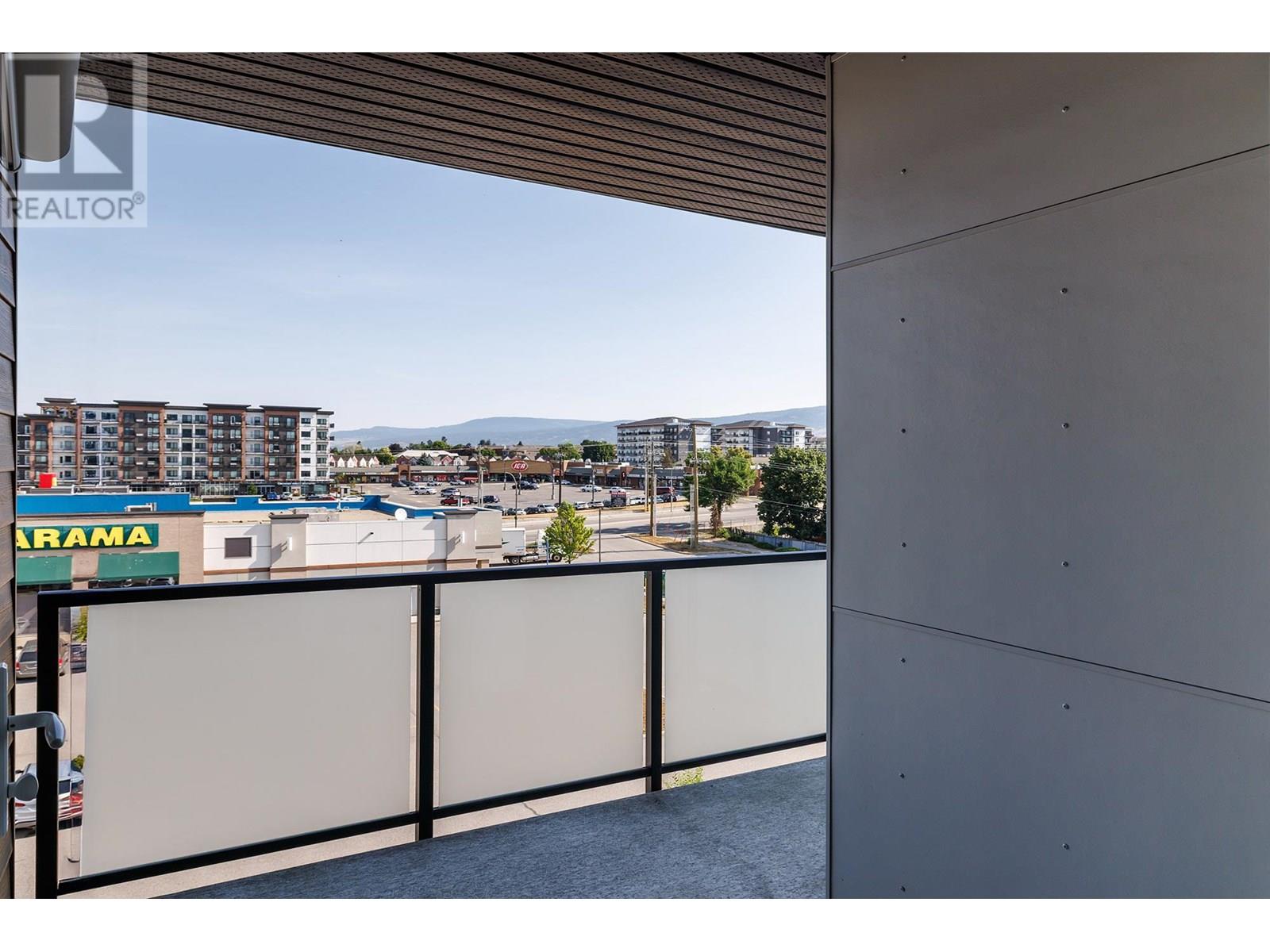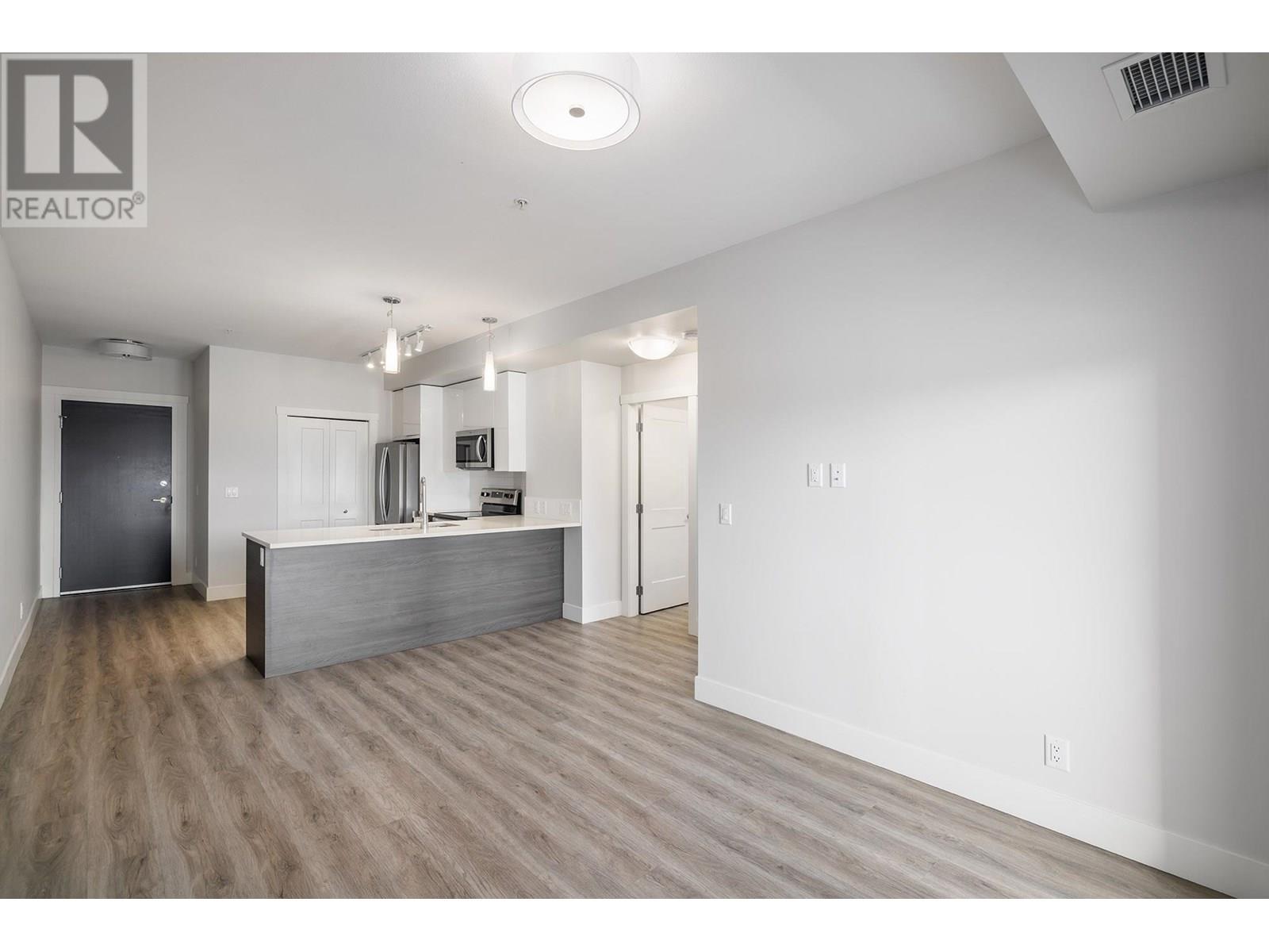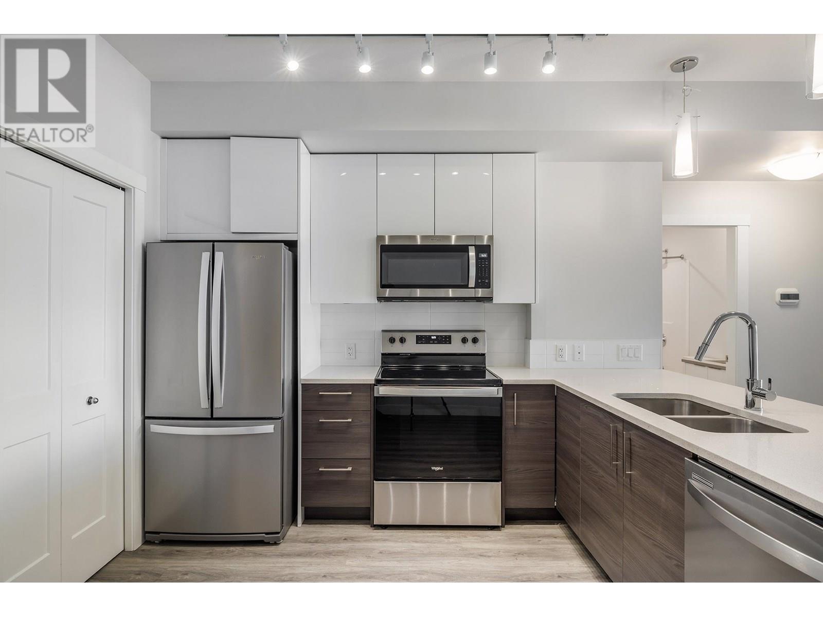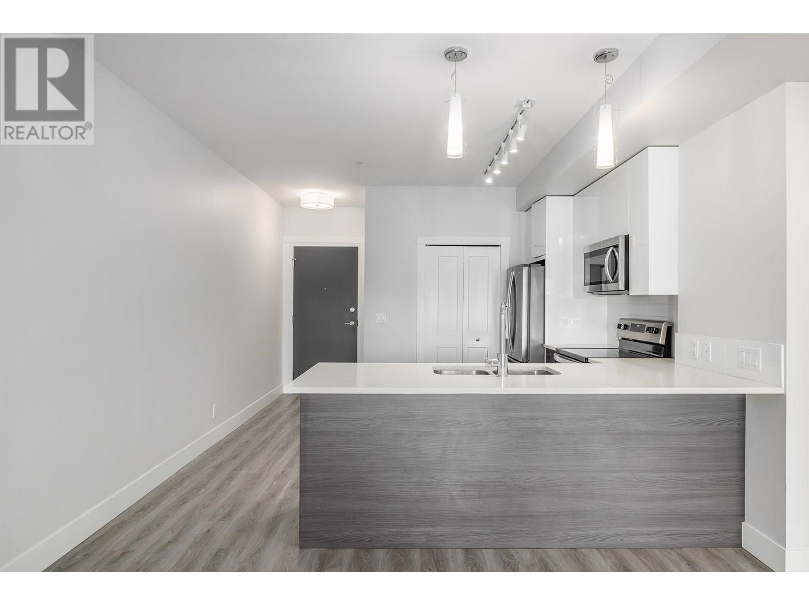 Welcome to SOHO, where modern design meets everyday convenience. This spacious 1 bedroom, 1 bathroom home offers the perfect blend of style and functionality, ideal for first-time buyers, students, or investors alike. Thoughtfully designed with an open-concept layout, 9-ft. ceilings, and large north-facing windows that fill the space with natural light. The sleek designer kitchen is a standout feature, with white shaker cabinets, rich wood-tone lowers, quartz countertops, and a Whirlpool stainless steel appliance package. Enjoy casual dining or entertaining at the oversized peninsula. The bright and airy living area flows seamlessly to a covered deck with serene mountain views, a perfect extension of your living space. Retreat to the generous primary bedroom complete with a large walk-in closet and built-in shelving. The 4-piece bathroom includes a modern vanity with quartz counters and a tub/shower combo. Additional highlights include in-suite laundry, a secure underground parking stall, storage locker, and access to amenities including a fitness centre and party room. Just minutes to UBCO, shopping, the airport, and downtown. Exceptional value in a central location. Vacant and ""like new"" . Well priced and ready for a quick sale! (id:6770)