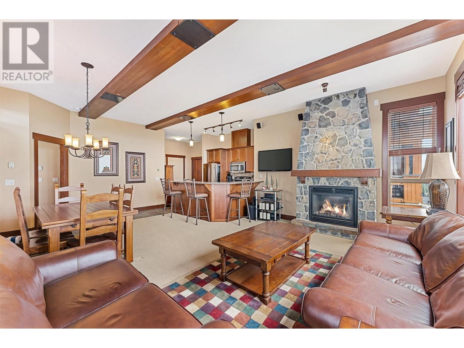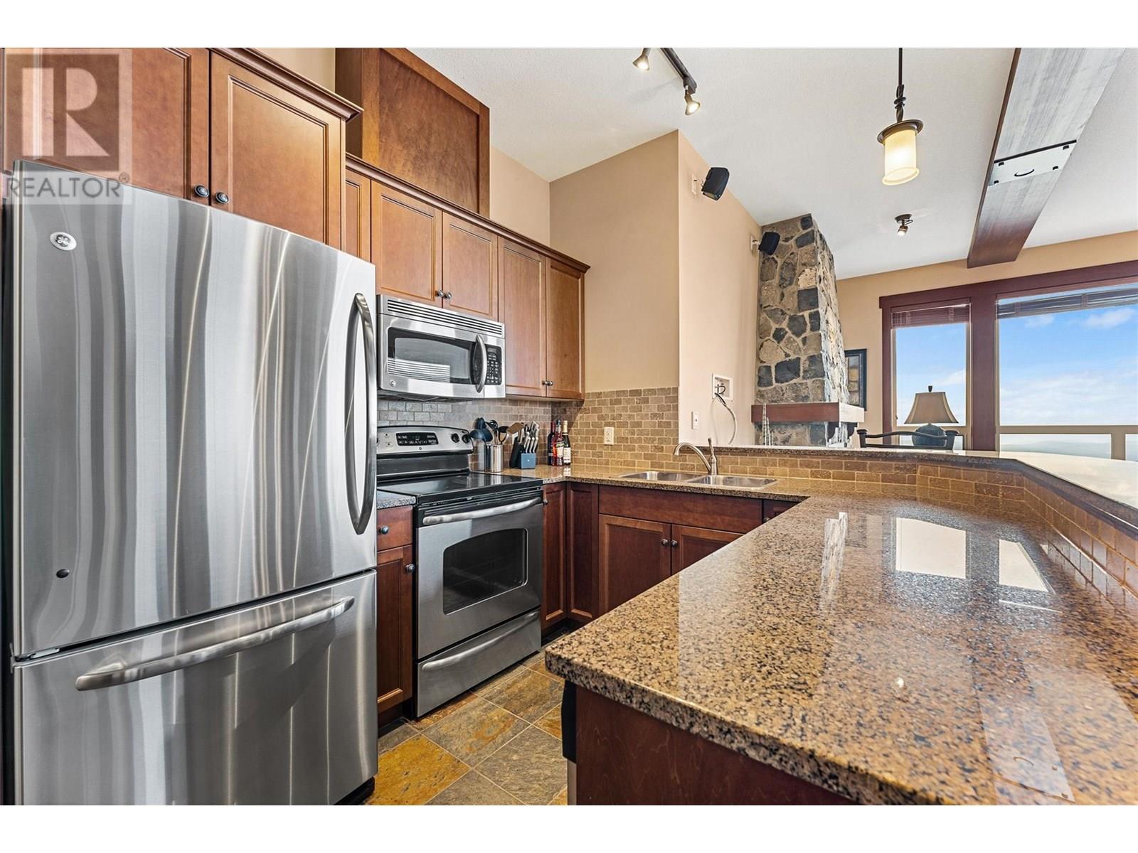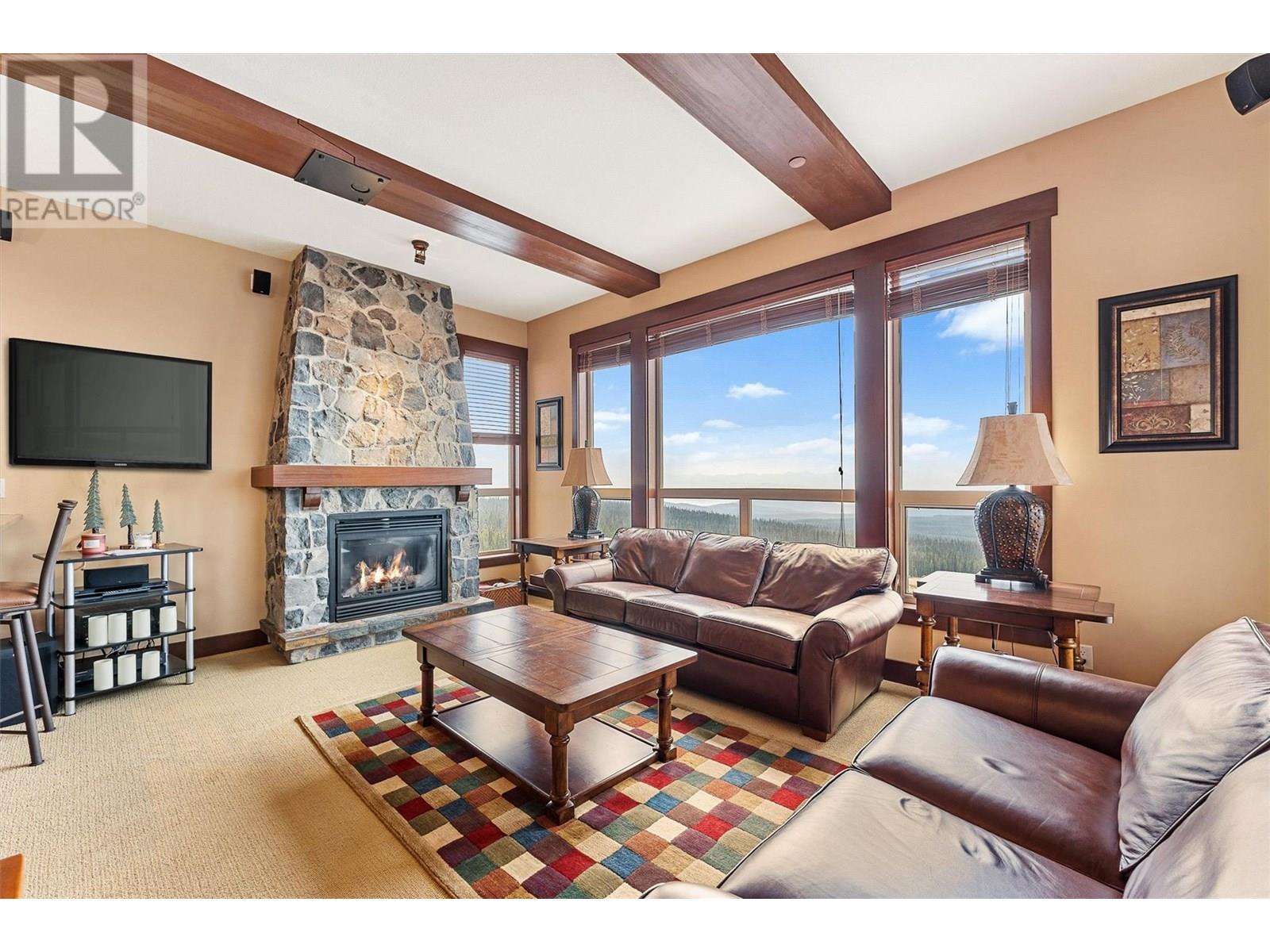 Welcome to this beautiful Three Bedroom, Two Bathroom PENTHOUSE, at Stonegate, with incredible ski in, ski out access and very close walking distance to the village. This Luxury corner unit has phenomenal unobstructed views of the Monashee Mountains as well as rich-cabin stye finishes including a striking stone fireplace and high beamed ceilings making it feel incredibly cozy. With direct access to your private hot tub from the master bedroom or the main living area, enjoy after a long day of playing in the snow. This dreamy condo features huge windows, a steam shower, granite countertops, a spacious living area, there is even room to entertain. This well cared for unit has never been in the rental pool, so in immaculate condition. There is In-suite laundry and a large storage/den room. And that's not all, enjoy the best amenities that Big White has to offer, Stonegate's incredible resort style amenities include a heated indoor/outdoor pool, theatre room, games room, pool table and poker lounge area, and a fully equipped gym. Whether you're seeking a family retreat or a year round mountain getaway, this condo delivers luxury, comfort, and lifestyle in one perfect package. (id:6770)