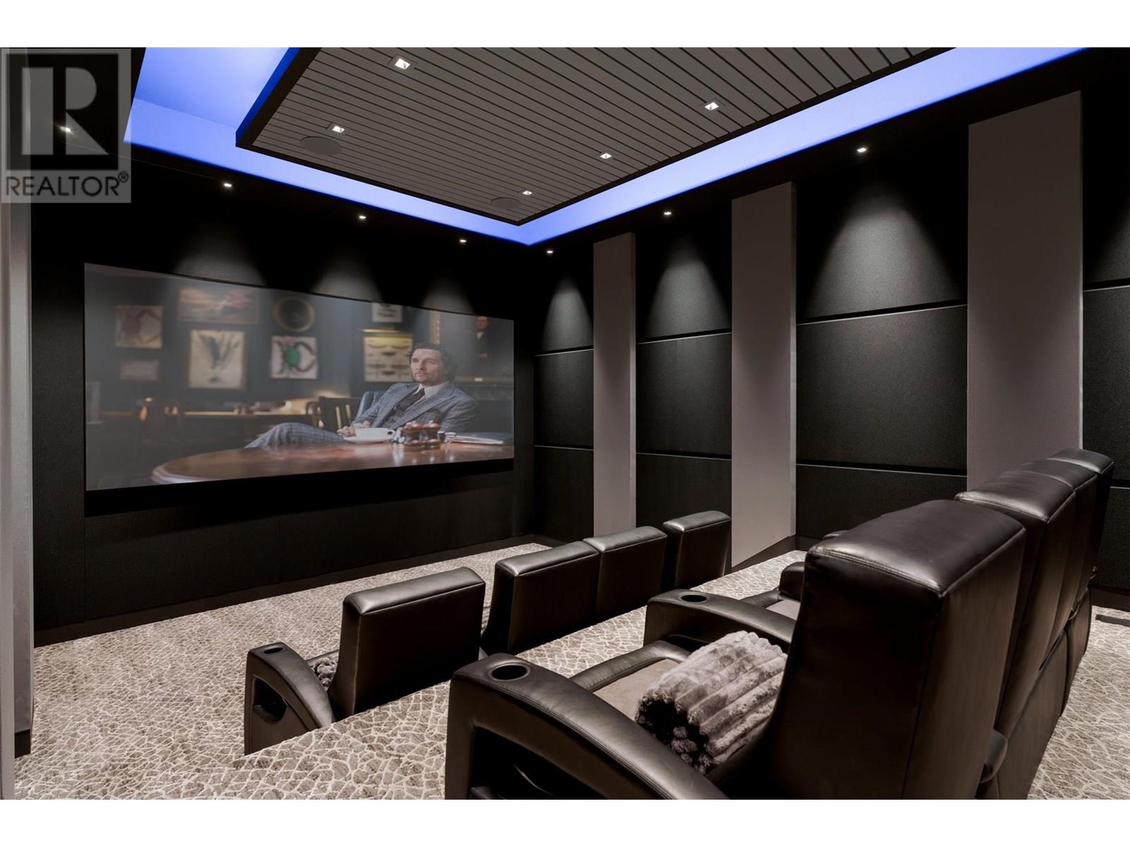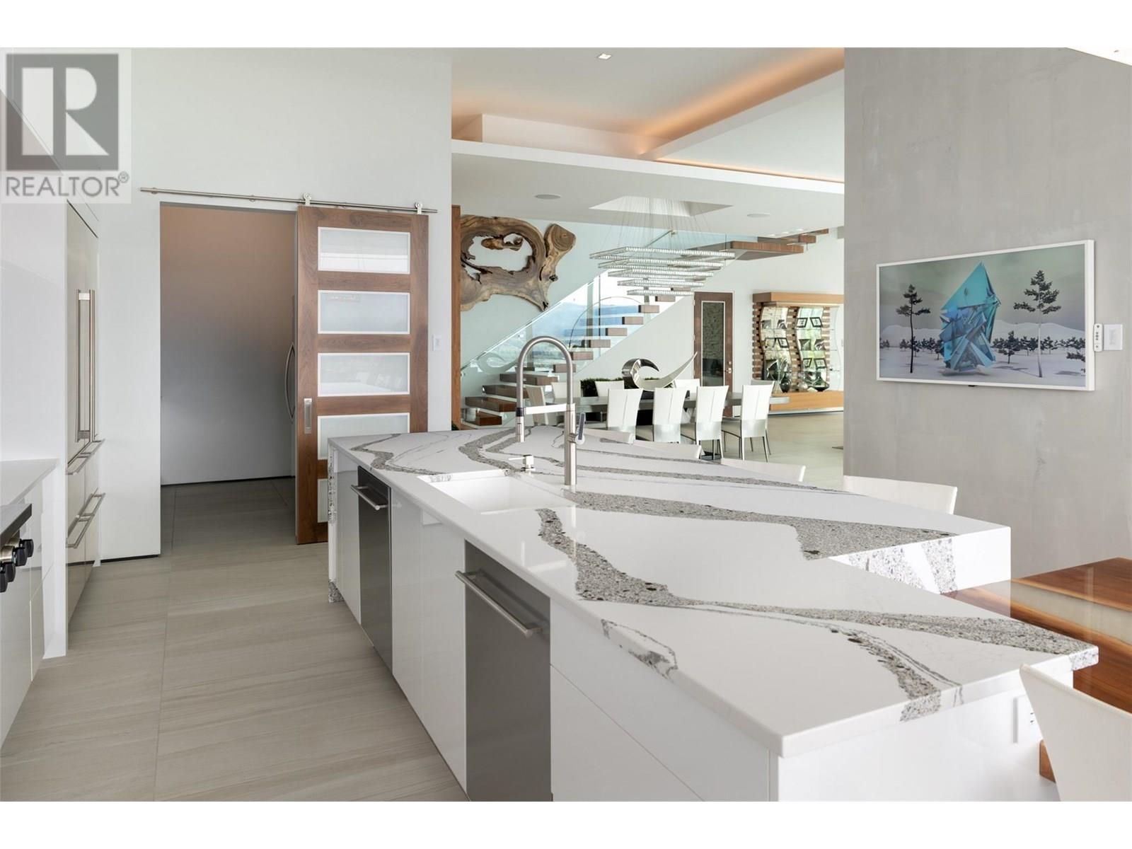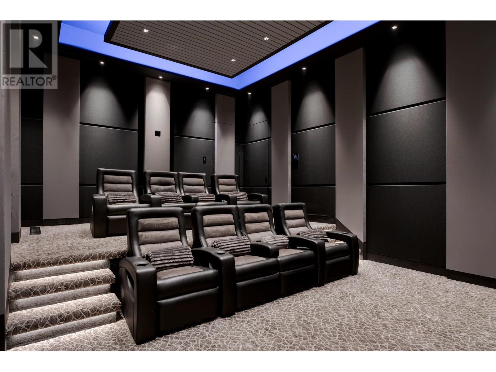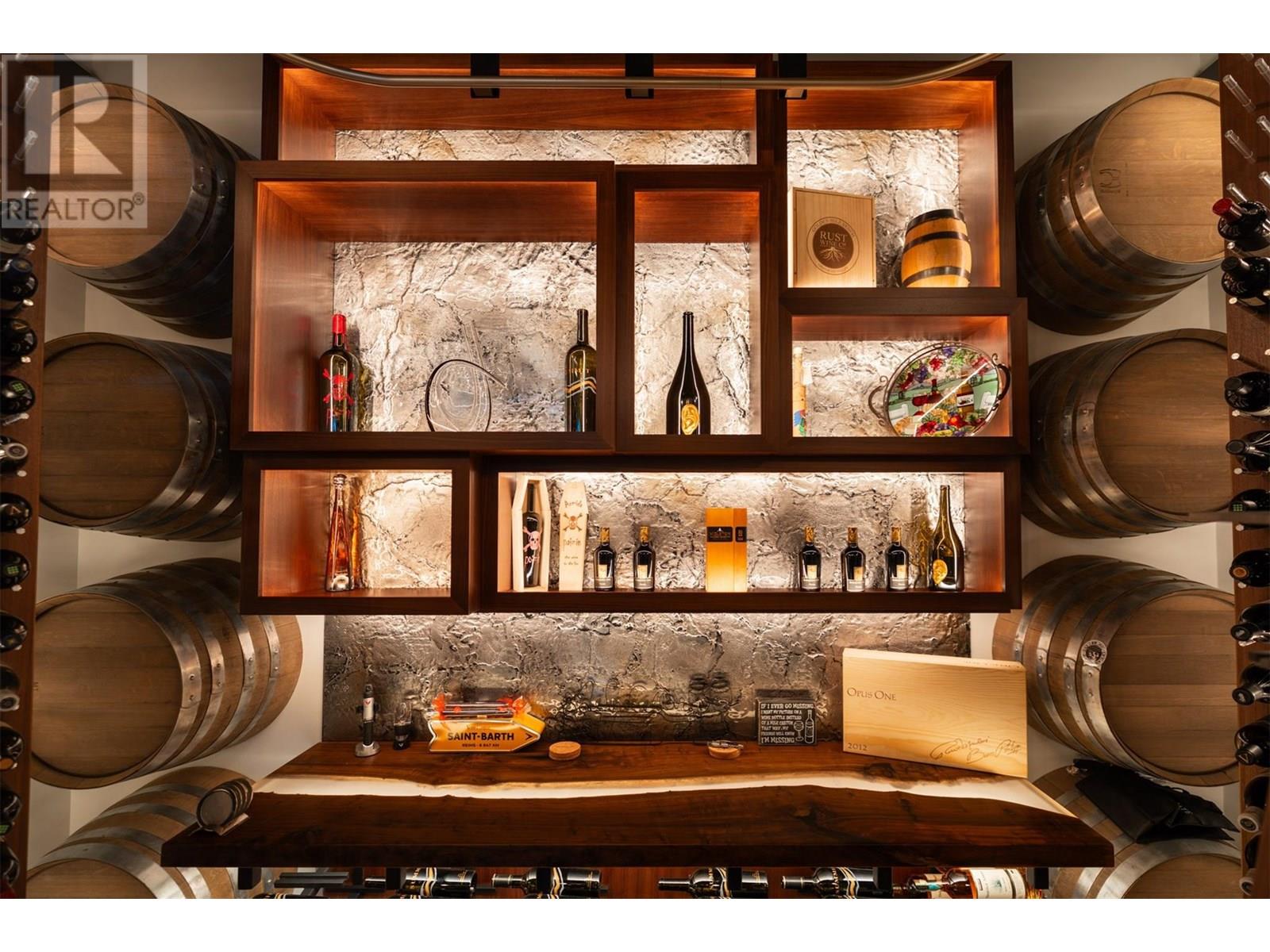 Discover unparalleled luxury at this magnificent custom Okanagan home. As you pass through the gate, you'll immediately be captivated by its design. The modern aesthetic seamlessly integrates the home with its landscaping, creating a harmonious experience. The entry features a mesmerizing floating roof design inspired by a museum in Spain, and light filled courtyard to display custom artwork Inside, entertain at the custom bar, enjoy a cinematic experience in the state-of-the-art home theatre, and store your prized vintages in the 1,500-bottle wine room. For seamless indoor to outdoor living all the sliding doors open to a completely private backyard offering a sensational living experience: prepare a culinary feast in the outdoor kitchen, lounge by the expansive saltwater vanishing edge pool, or soak in the hot tub, all while enjoying the relaxing ambiance of the waterfall and 180-degree views of Okanagan Lake. Take the floating walnut staircase or the elevator upstairs. The primary bedroom is a retreat like no other, with a private patio, luxurious lake view en suite, and a stunning custom closet. Three additional bedrooms each have their own en suite. For the car enthusiast, this home boasts 2 levels of garages with parking for 7+ vehicles. Exquisite finishes include porcelain tile floors, Cambria quartz, &unmatched glass and walnut woodwork by Shawn Truit. This custom home stands as a masterpiece of design and engineering. (id:6770)