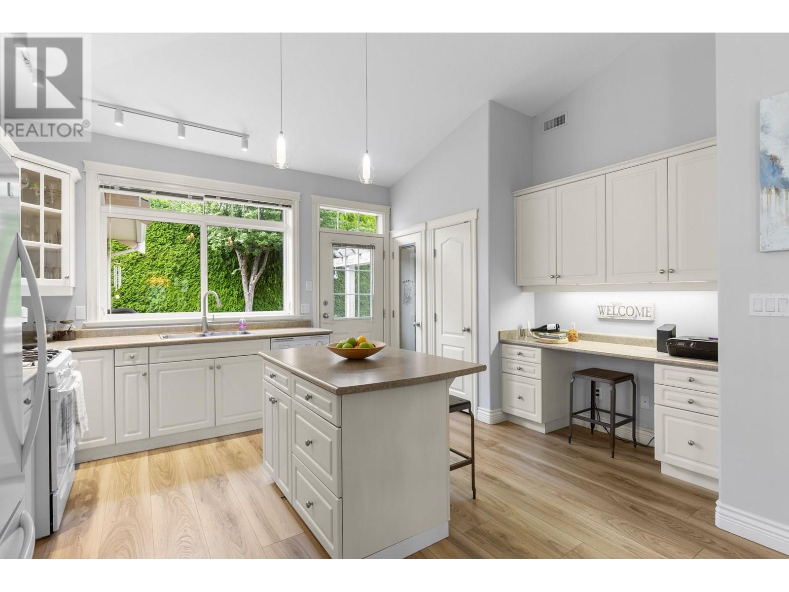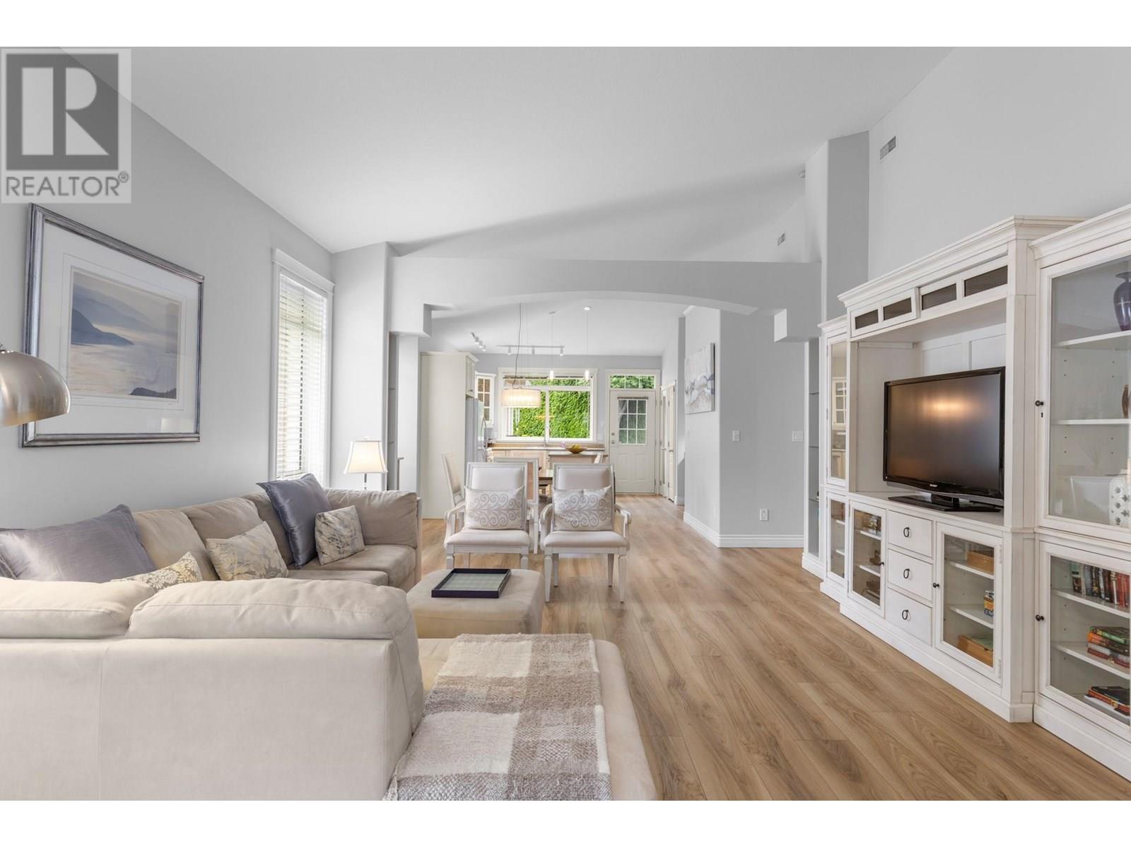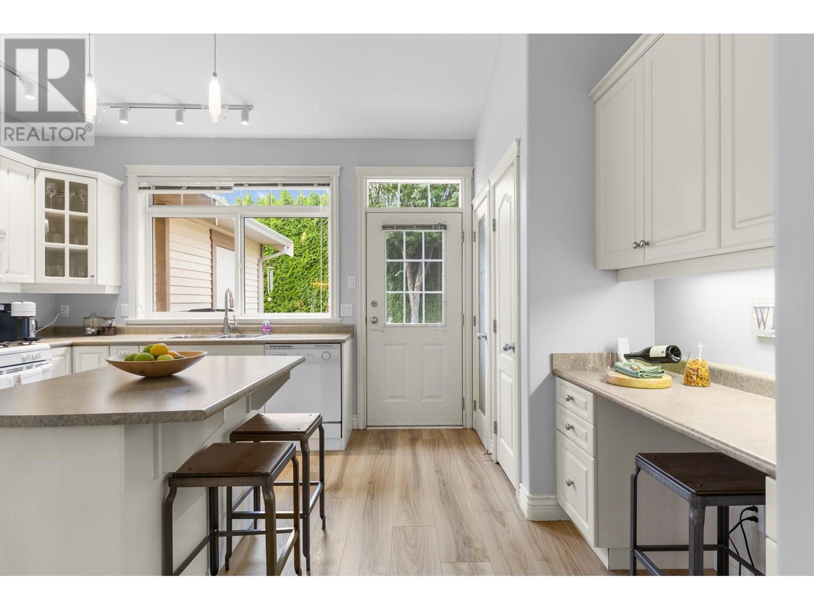 Welcome to this pristine end-unit townhome located just one block from endless beach and lake enjoyment! This one level rancher home offers it all, from multiple outdoor living areas, tons of parking, and thoughtful updates throughout. Upon entry you are greeted by the open concept living room, with high ceilings and extensive windows for natural light. The living room features a gas fireplace, opening onto the dining area. The kitchen features large island, gas range, tons of built-ins, and a generous pantry. Exit the back door into your tranquil oasis, with lush landscaping, excellent privacy, and a large storage shed. The primary wing has a generous bedroom, large ensuite with tub and shower, and dual closets, and direct access to the backyard. There is another bedroom, full bathroom, and laundry finishing this wonderful floorplan. Out front there is another beautiful sitting area, which in combination in the backyard allow full sun or shade at any time of day. The single garage has a small work area, and there is space for four cars on the large, flat driveway. Located just minutes from Peachland’s shopping and amenities, and just one block to the lake. Book your showing today! (id:6770)