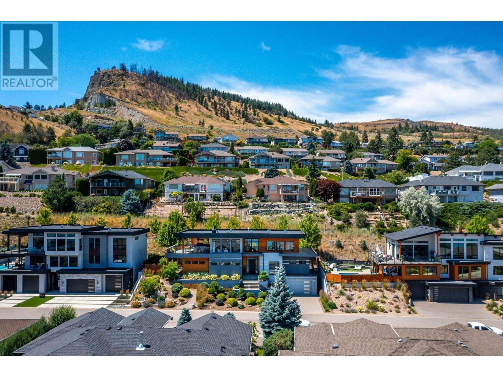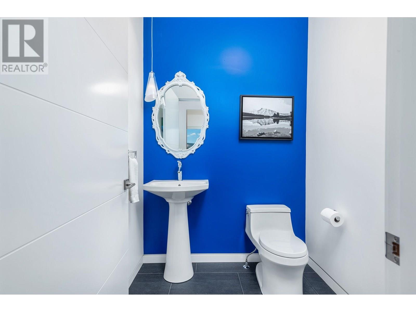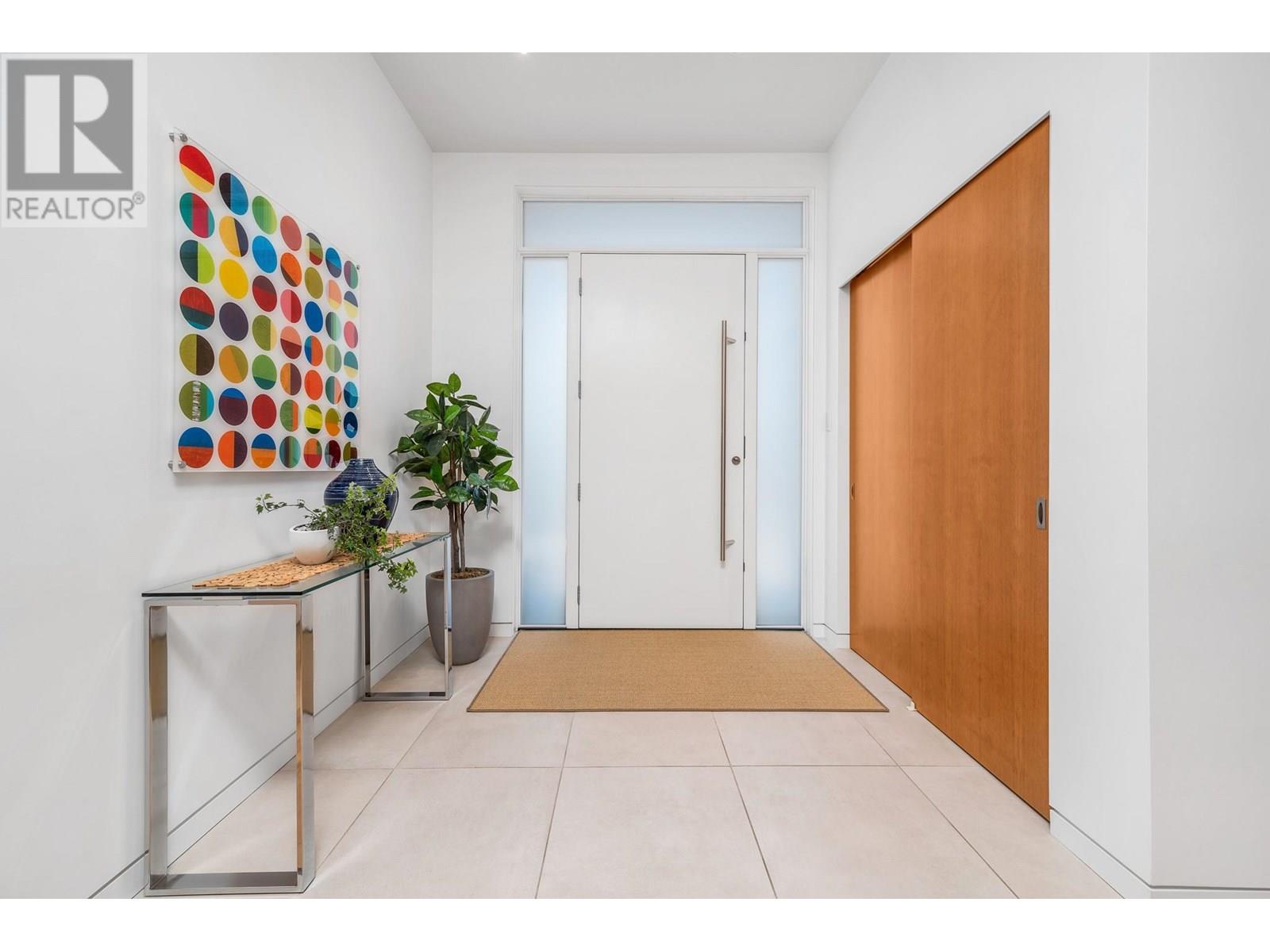 Drawing inspiration from Frank Lloyd Wright, this architecturally stunning home blends modern elegance with intelligent design. The exterior features custom metal privacy screens, cedar soffits with pot lighting, concrete planters, and exposed aggregate pathways with integrated stair lighting. A large, covered deck with glass railings captures breathtaking views of the Kalamalka Lake, Coldstream Valley, and Monashee Mountains. Inside, 2x8 double-staggered stud construction, 9 zone radiant in-floor heating and home automation for lighting, vertical blinds, water sensors, sound systems, TV, Security cameras, climate and home monitoring for comfort and efficiency. A private elevator connects all floors, including garage-to-kitchen access. Beech plank and tile flooring flow throughout, with rubberized tile in the gym. The top-floor kitchen features Miele appliances including a combi oven and steam oven, black quartz countertops, and a spacious island with a chef’s sink. The open living/dining area is surrounded by windows and features 3 panel sliding door making an 8’ opening to a 24x24’ partially covered deck with BBQ hookup and ceiling heater. The primary suite includes patio access, steam shower, dual vanity, and built-in cabinetry. 2 additional bedrooms, a full bathroom, den, large office, and gym round out the space. Thoughtfully integrated storage, an epoxy-finished garage, ductless AC, HRV and humidifier systems, and a hot water boiler complete this exceptional smart home. (id:6770)