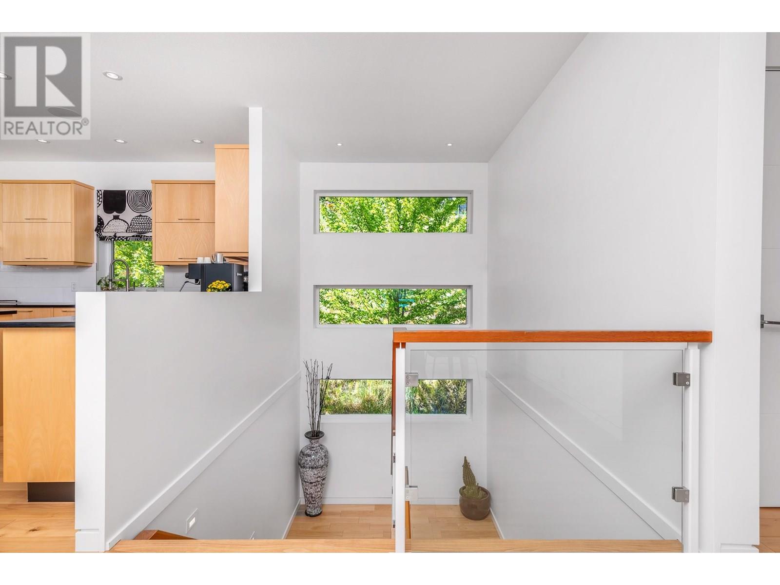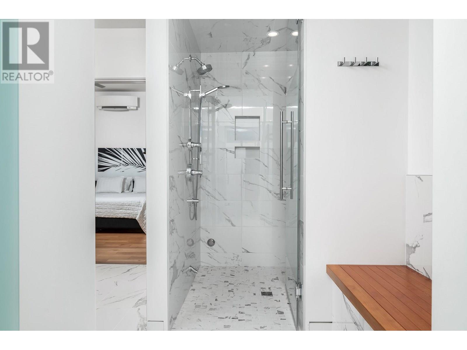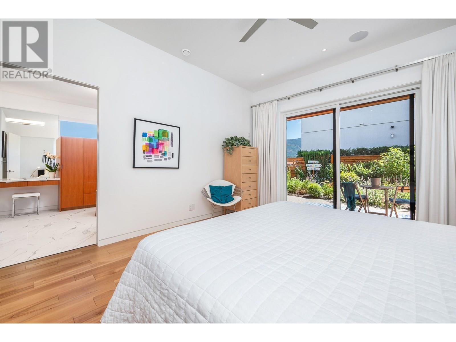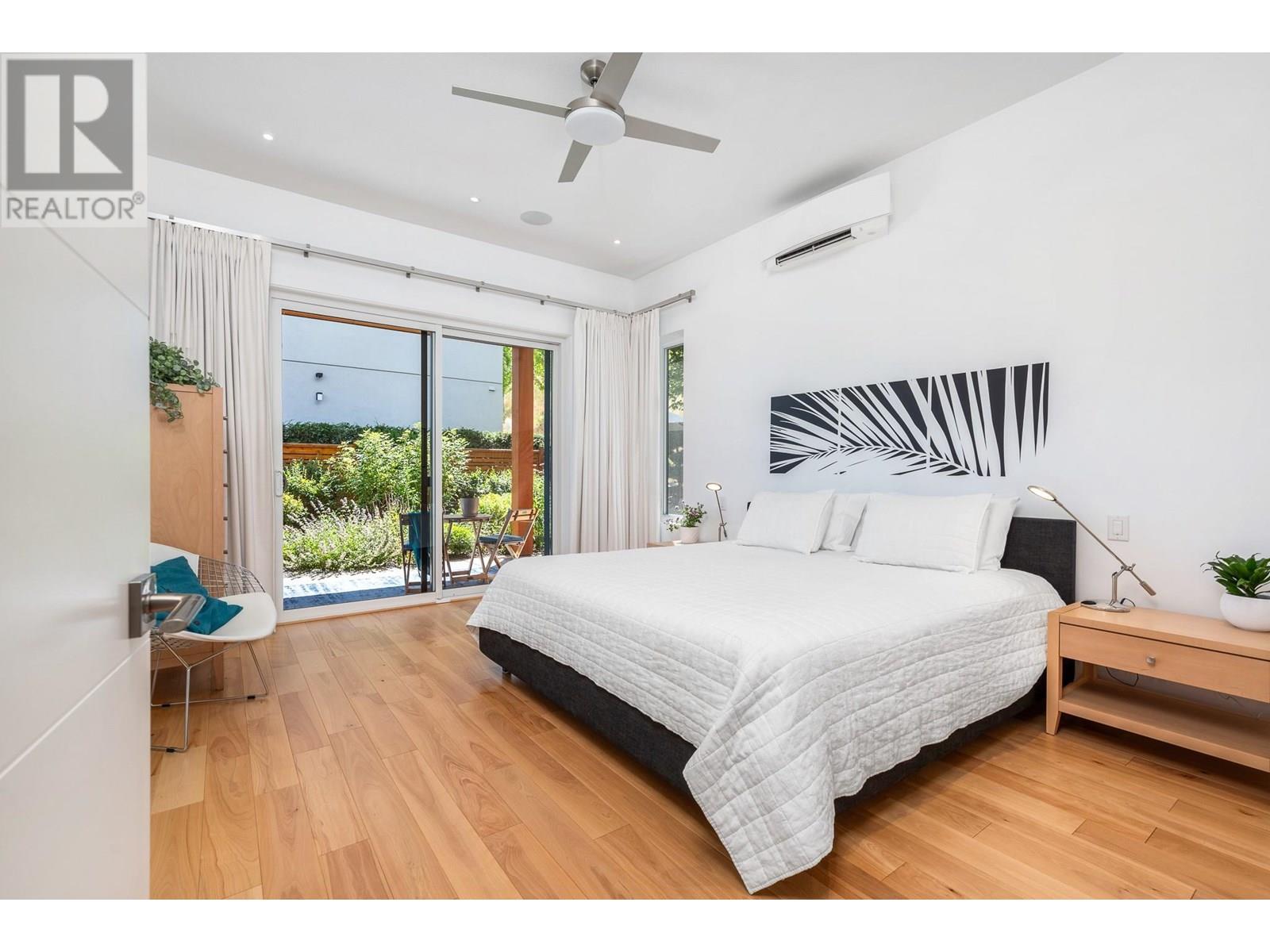 Drawing inspiration from Frank Lloyd Wright, this architecturally stunning home blends modern elegance with intelligent design. The exterior features custom metal privacy screens, cedar soffits with pot lighting, concrete planters, and exposed aggregate pathways with integrated stair lighting. A large, covered deck with glass railings captures breathtaking views of the Kalamalka Lake, Coldstream Valley, and Monashee Mountains. Inside, 2x8 double-staggered stud construction, 9 zone radiant in-floor heating and home automation for lighting, vertical blinds, water sensors, sound systems, TV, Security cameras, climate and home monitoring for comfort and efficiency. A private elevator connects all floors, including garage-to-kitchen access. Beech plank and tile flooring flow throughout, with rubberized tile in the gym. The top-floor kitchen features Miele appliances including a combi oven and steam oven, black quartz countertops, and a spacious island with a chef’s sink. The open living/dining area is surrounded by windows and features 3 panel sliding door making an 8’ opening to a 24x24’ partially covered deck with BBQ hookup and ceiling heater. The primary suite includes patio access, steam shower, dual vanity, and built-in cabinetry. 2 additional bedrooms, a full bathroom, den, large office, and gym round out the space. Thoughtfully integrated storage, an epoxy-finished garage, ductless AC, HRV and humidifier systems, and a hot water boiler complete this exceptional smart home. (id:6770)