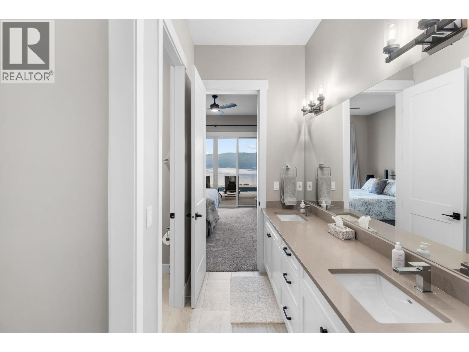 Welcome to this exquisite 2.7-acre estate nestled above Okanagan Lake in one of Vernon’s most sought-after communities. Set behind a solar-powered gate, this private, multi-family–zoned lot blends luxury, comfort, lifestyle, and versatility. Inside, the bright and airy home offers vaulted ceilings, a soaring fireplace, and floor-to-ceiling windows framing 270 degree lake views. The main floor features a gourmet kitchen with Miele appliances, a built-in espresso station, plus a prep kitchen, all flowing seamlessly to the living and dining areas. Step onto the 800+ square foot covered terrace, boasting topless glass railings and power shades for seamless indoor-outdoor living. The main level includes a powder room, office, and a primary suite with a double shower, soaker tub, and laundry. Downstairs, the daylight walkout basement hosts two more lakeview bedrooms with ensuites, a theater with 4K Dolby Atmos, a wet bar, wine cellar, and a games room. All enjoyed with in-floor heating throughout this level. Step outside to the private oasis with a saltwater pool (deck jets, auto cover, LED lighting), Michael Phelps spa, outdoor kitchen, TV, shower, and bathroom. This low maintenance estate with city utilities offers a three bay heated garage (polyaspartic floors), rough-ins for solar, EV charging, and an elevator. Room for a second residence, carriage house, shop, and/or pickleball court. Owners enjoy exclusive access to a private dock, beach, and sports courts—Adventure Bay living at its finest (id:6770)
