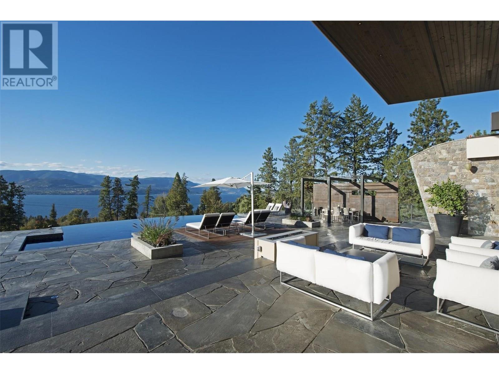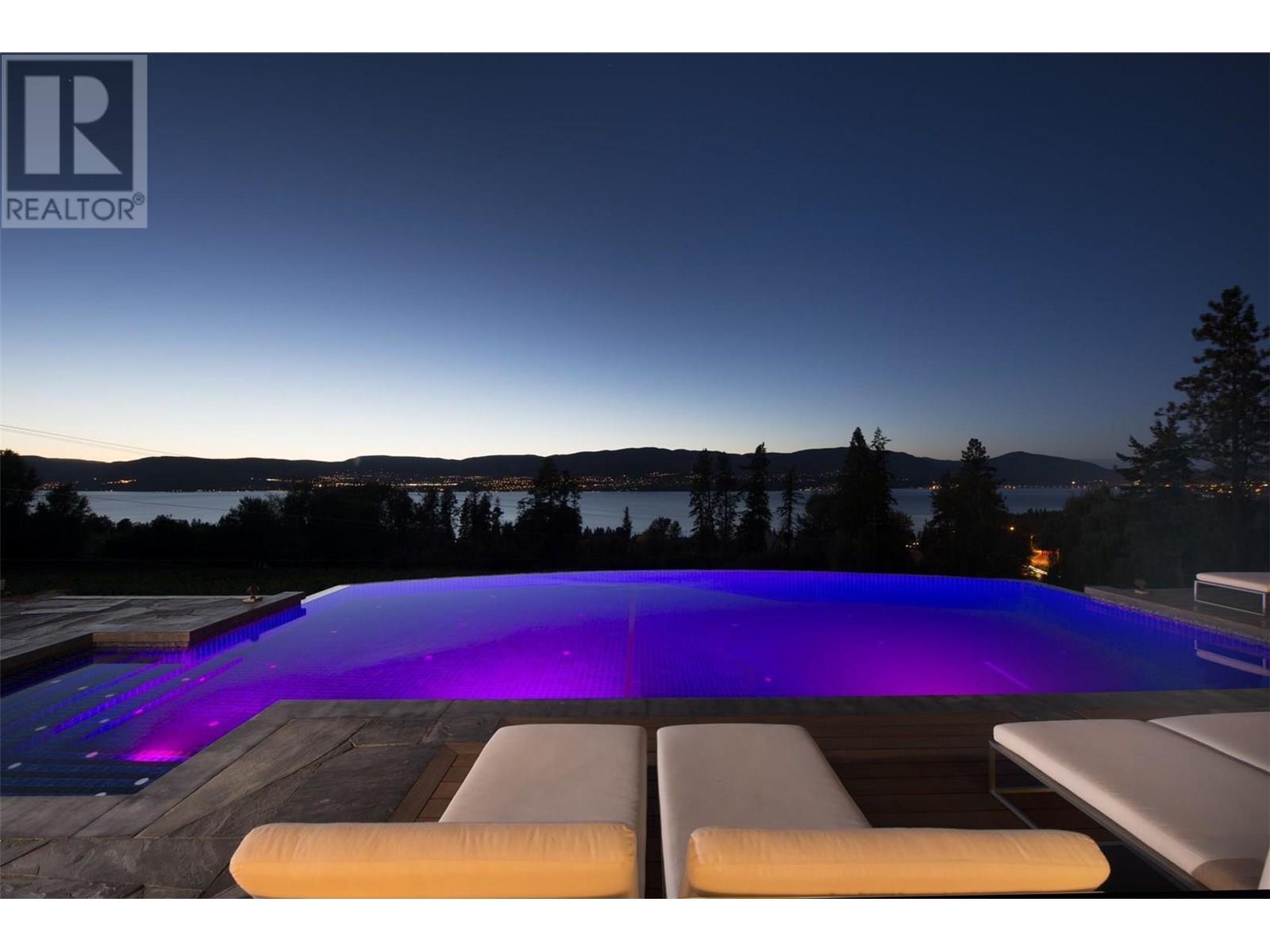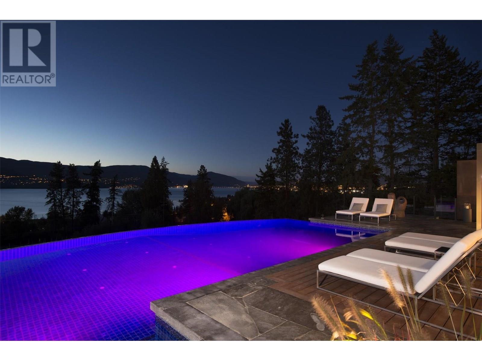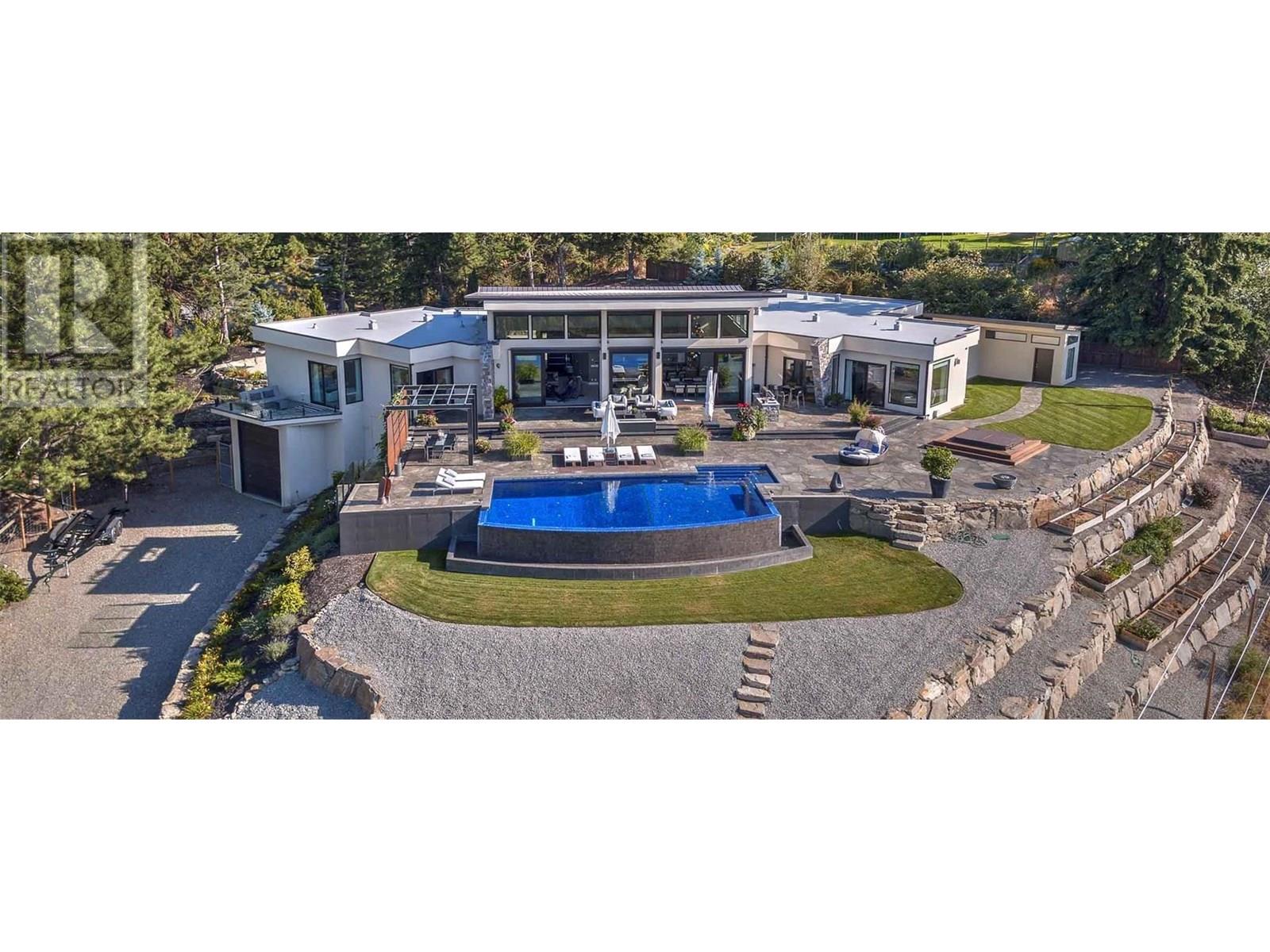 Private estate home set on 2.05 acres and perfectly positioned to capture the stunning lake, city and vineyard views. Enjoy an expansive flagstone patio with a spectacular negative edge saltwater infinity pool that creates a resort-like setting with room to lounge, entertain and take in the breathtaking views. Gated entry leads to heated triple garage & single garage plus RV garage. Upon entering the home you’ll notice walls of glass showcase views of the pool, lake and beyond. Soaring ceiling height w/floor to ceiling windows & sliding wall system create a seamless extension to the outdoors with the open concept great room, dining & kitchen. Kitchen features oversized granite island, professional appliances, custom fixtures & cabinetry. Generous sized lake view primary bedroom framed in windows w/ linear gas fireplace & full ensuite with frameless glass shower, his/her sinks and soaker tub. Contemporary style home is over 5500 square feet with 4 bedrooms & 6 baths. Lower level boasts wine room, media room and games room. New pool, patio, pergola & outdoor living space completed in the summer 2015. The home blends exterior with interior living superbly. Located a short stroll to adjacent Summerhill Winery and minutes to the lake, hiking, dining, boutiques and schools. (id:6770)
