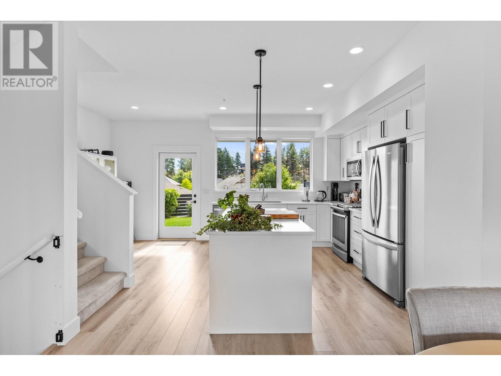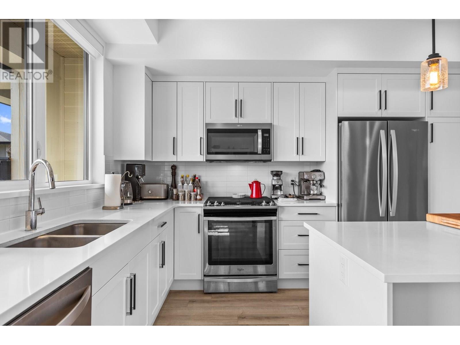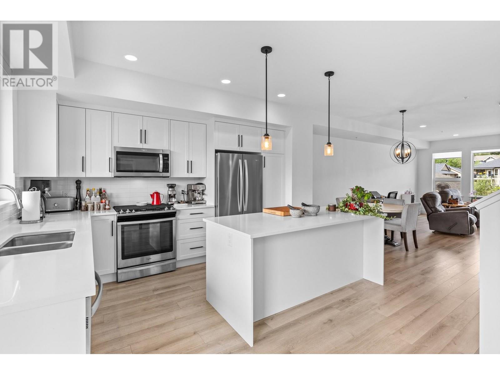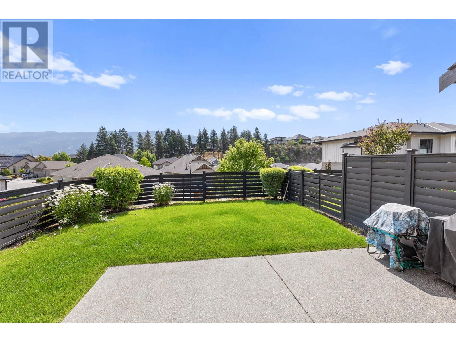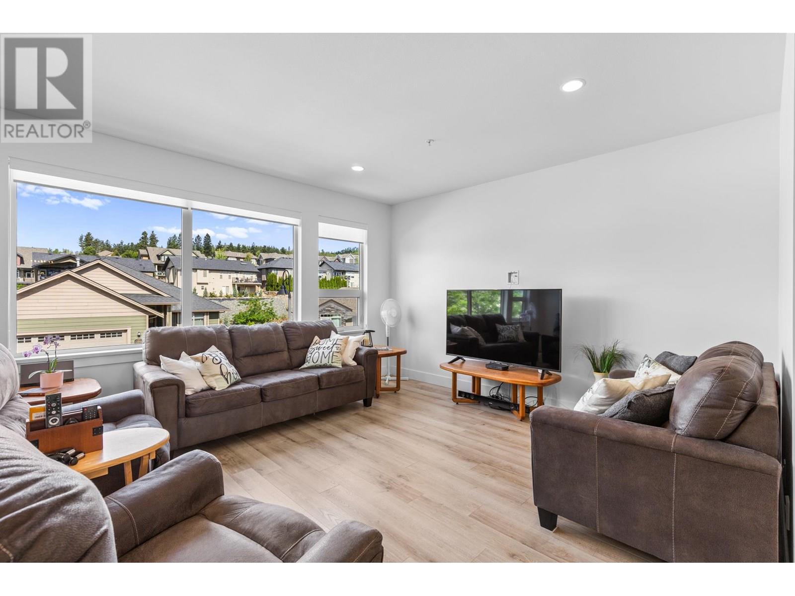 Bright & Modern End Unit in Rockridge at The Lakes. A vibrant and family/pet friendly townhome community in the heart of Lake Country. This stylish 3-bedroom + den/flex, 3-bathroom end unit offers the perfect blend of space, functionality, and comfort. Flooded with natural light, the main floor showcases a modern open-concept design with large windows throughout. The kitchen is a true highlight, featuring quartz countertops, a gas range, sit-up island, and cozy eating nook. The layout flows seamlessly into a spacious dining area and bright living room—perfect for everyday living and entertaining. Step out from the kitchen to your private, elevated backyard oasis with panoramic Eastern Mountain views. With no units directly behind, you’ll enjoy added privacy along with a gas hookup, power, and water connection. Upstairs you’ll find three well-appointed bedrooms, including a generous primary suite with a 4-piece ensuite. The laundry is conveniently located on this level as well. The lower level adds valuable flexibility with a den/flex room – perfect for a home office, gym, or guest space. Additional features include a double car garage, a full-length 26 ft driveway that easily accommodates most vehicles, and close proximity to visitor parking—making hosting friends and family a breeze. This home truly has it all—modern comfort, unbeatable functionality, and a fantastic location. (id:6770)
