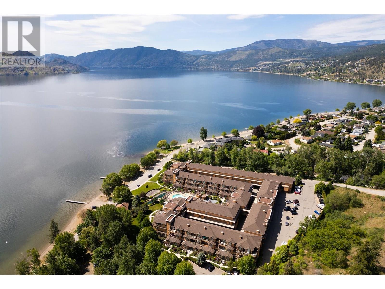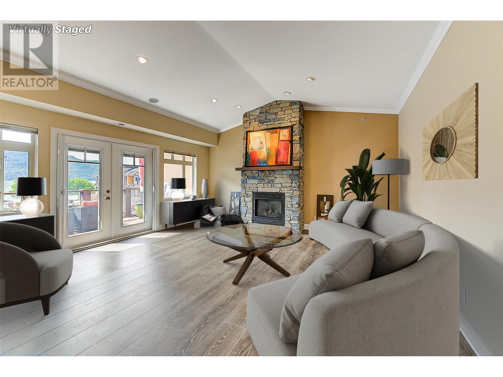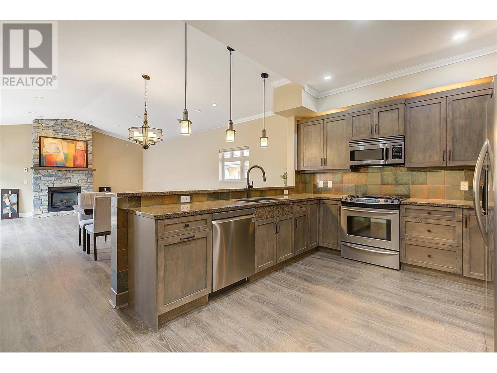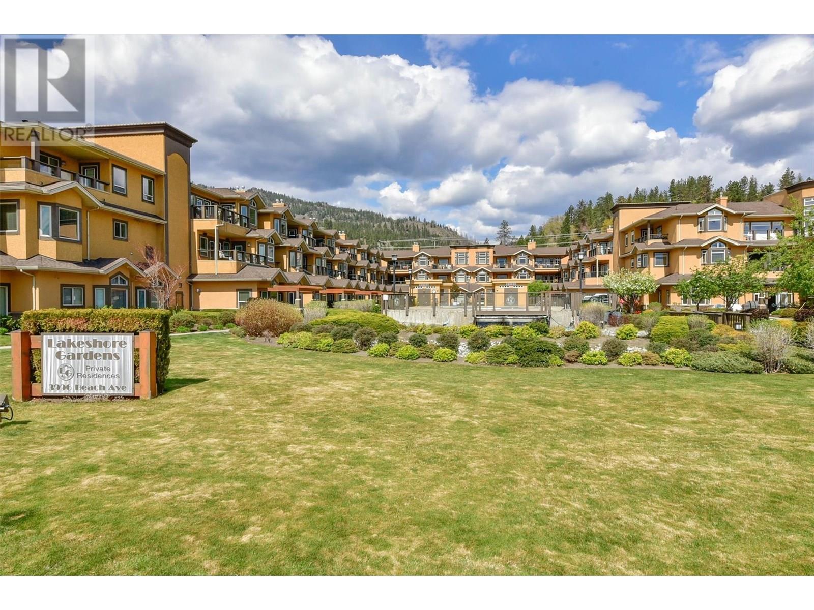 Experience the pinnacle of lakeside luxury in this fully renovated top-floor penthouse at Lakeshore Gardens. Spanning 1,748 square feet, this 3-bedroom, 2-bath retreat offers sweeping views of the lake, pool, and gardens from an oversized double-deck balcony. Inside, vaulted ceilings and high-end finishes create an ambiance of elegance and comfort. The gourmet kitchen is a chef’s dream, outfitted with granite countertops, custom soft-close cabinetry, pull-out drawers, and a premium gas range. In the living room, a striking floor-to-ceiling gas fireplace serves as the centrepiece, while stylish vinyl-coated laminate flooring, luxe tile in the bathrooms, and plush carpeting in the bedrooms add warmth throughout. The primary suite is a private haven with a walk-in closet and spa-like ensuite featuring quartz countertops, a deep soaker tub, and a rainfall shower. A brand-new heat pump, installed in December 2024, ensures optimal climate control year-round. Residents enjoy resort-style amenities including a heated pool, year-round hot tub, full-service gym, secure kayak and bike storage, boat launch, social hall, private storage unit, and two guest suites. Just steps from the shores of Okanagan Lake, this move-in-ready penthouse blends tranquil views with upscale living—an opportunity not to be missed. Schedule your private viewing today and step into your new lakeside lifestyle. (id:6770)