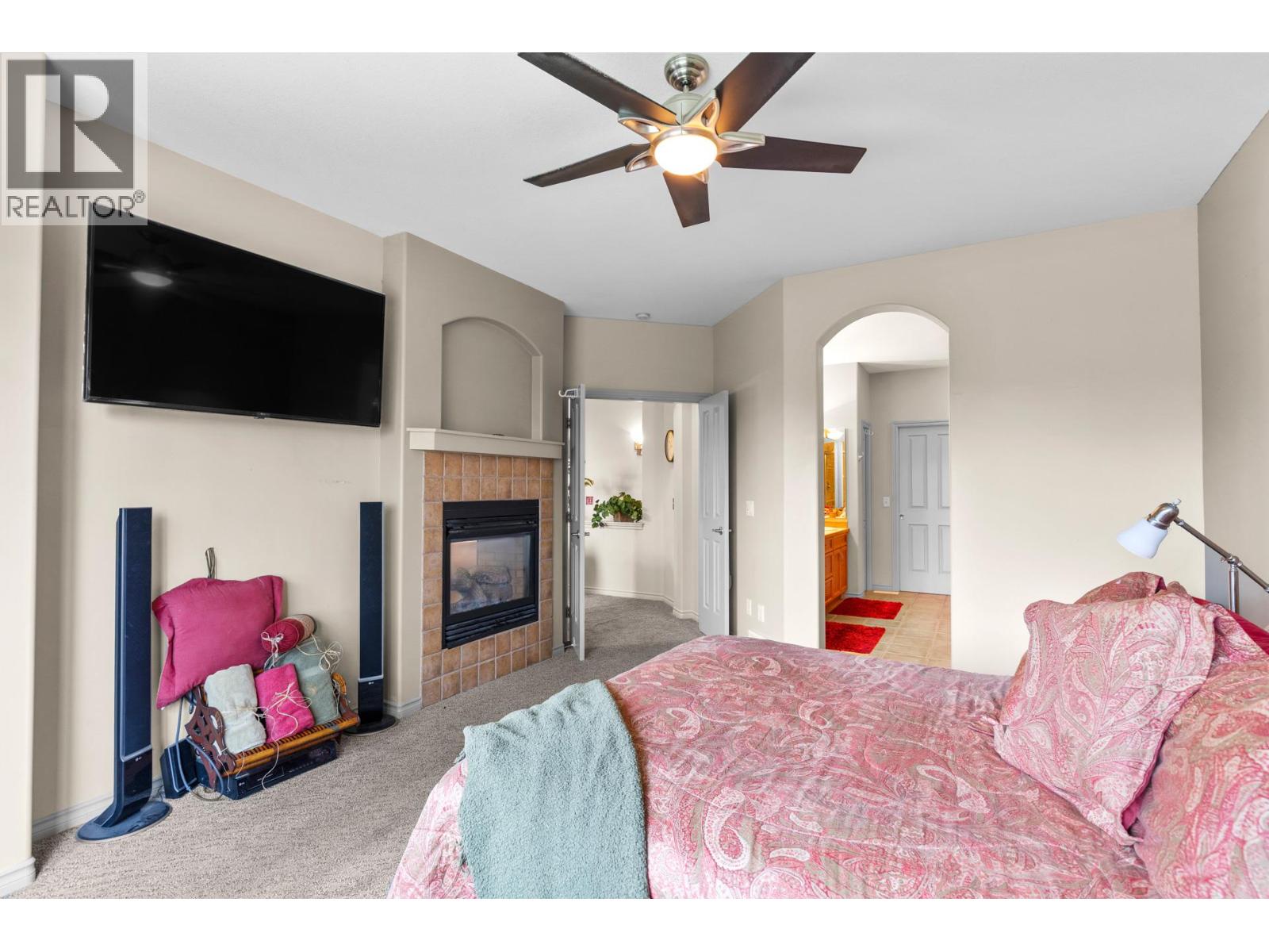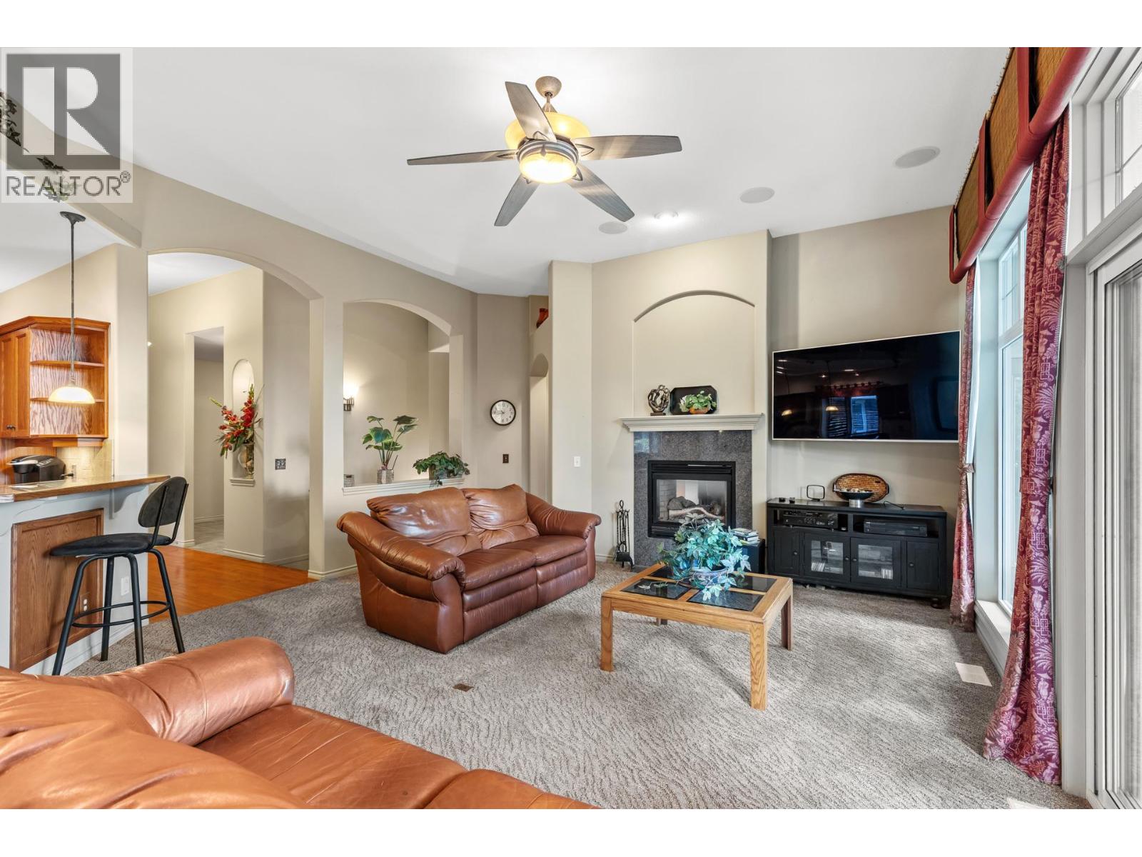Welcome to Gallagher's Lookout! This semi-attached rancher is a true hidden gem, offering private, serene, and peaceful views. You'll love the convenience of main floor living, which features a courtyard off the kitchen and a spacious covered deck overlooking Layer Cake Mountain. This home offers three bedrooms and 2.5 bathrooms, a large living room, and a dining area. The living room includes a gas see-through fireplace that extends into the primary bedroom, which also opens onto the covered deck. The extended kitchen provides additional cabinets for a built-in oven and features antibacterial (antimicrobial) grout, with direct access to the courtyard. The dining room also includes a movable bar. The en-suite bathroom boasts a large soaker tub, a separate shower, and a generous walk-in closet. The downstairs area includes two additional bedrooms, a den, and another large room perfect for an exercise area, along with ample storage. A large recreation room with glass sliding doors opens onto a private patio, ideal for entertaining. This quality-built townhome offers carefree living with high ceilings and expansive windows, tucked behind a private gated courtyard that opens onto green space. It also comes with a double car garage and an extra spot for your golf car. This unit is perfectly located, just a short walk from Gallagher's Canyon Village Centre, where you can enjoy amenities such as a state-of-the-art gym, indoor swimming pool and hot tub, games rooms, tennis courts, an art studio, and woodworking and ceramics shops. (id:6770)