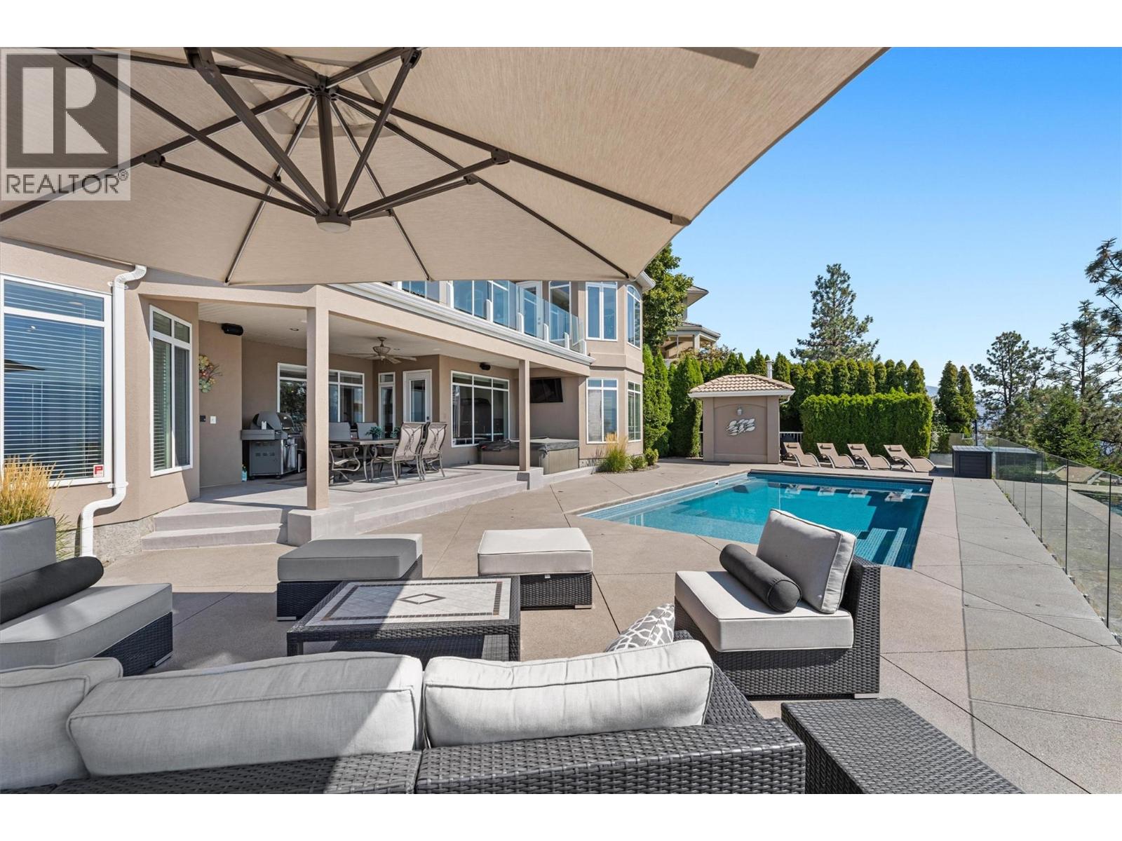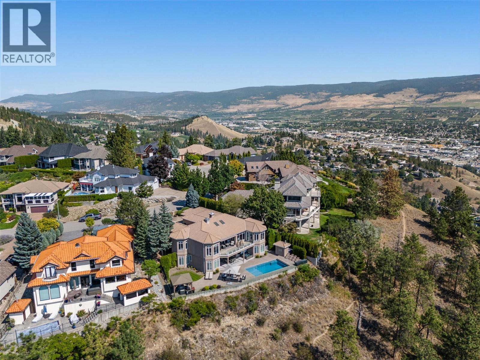 Elevated above the city on one of Kelowna’s most desirable streets, this renovated Dilworth Mountain residence sits on a large, private lot and offers front-row views of Okanagan Lake, the valley, and downtown. Walls of windows, skylights, and soaring ceilings fill the home with natural light, while thoughtful updates blend timeless elegance with modern luxury. The main level is designed for entertaining with an expansive open concept plan. A statement living room with gas linear fireplace connects to the dining area and chef’s kitchen. The kitchen features quartz counters, a striking L-shaped island, professional-grade Thermador appliances, and a hidden servery with wine storage and built-in desk. The primary suite is a retreat of its own—complete with fireplace, walk-in closet, and spa-like ensuite where the freestanding soaker tub captures unobstructed valley views. The lower level is ideal for hosting family and guests with a large rec room and wet bar, media room, gym, den, and four additional bedrooms. Glass doors lead to the backyard oasis where a stunning tiled pool, hot tub, gazebo, and multiple lounging areas create resort-style living at home. The large level driveway offers ample parking which leads to an oversized 3-bay epoxy-finished floor garage, complete with extensive storage space. This property represents a rare opportunity to the best of Kelowna living – panoramic views, exceptional design , and professionally landscaped private grounds , set in an enviable location! (id:6770)