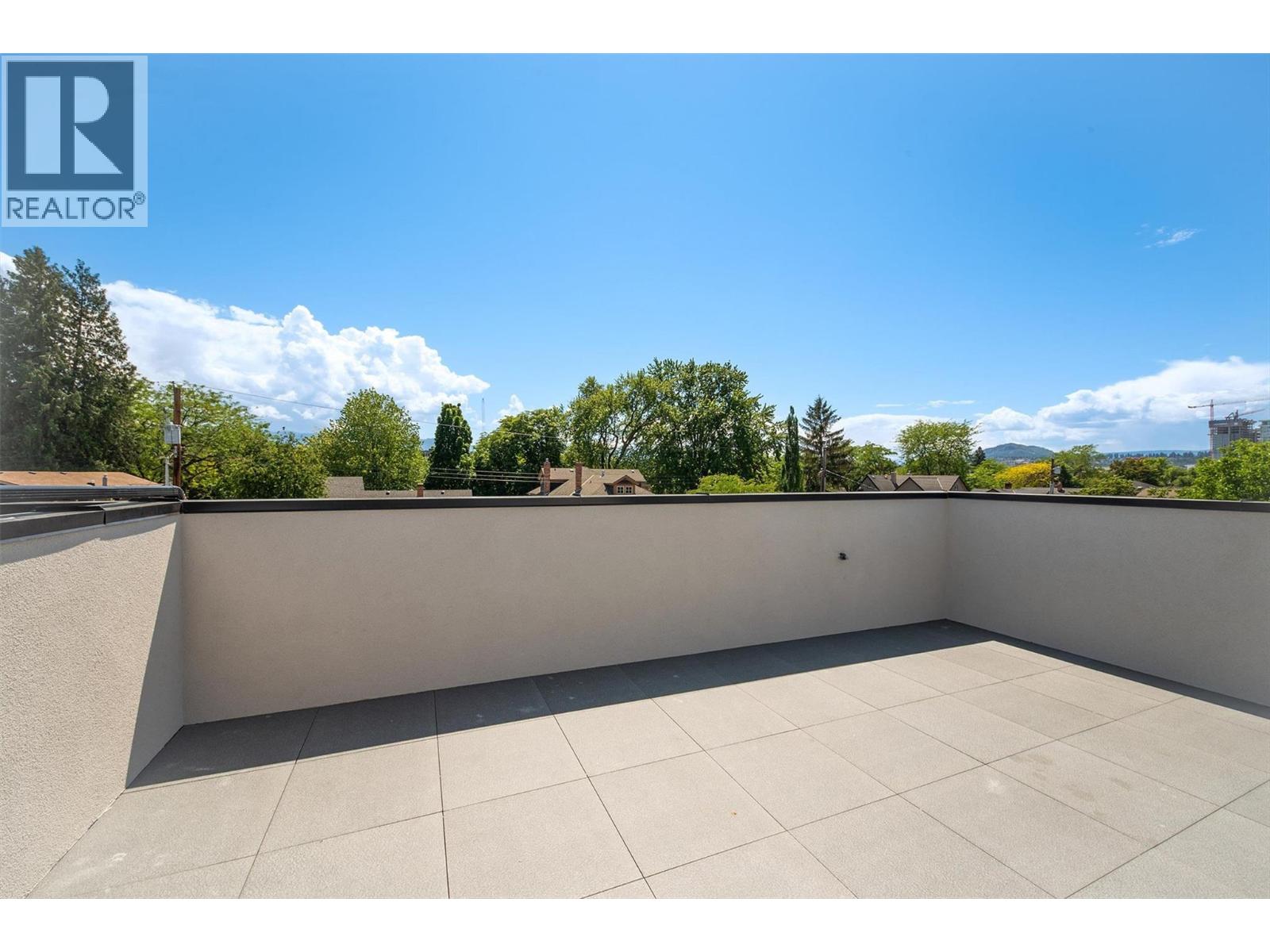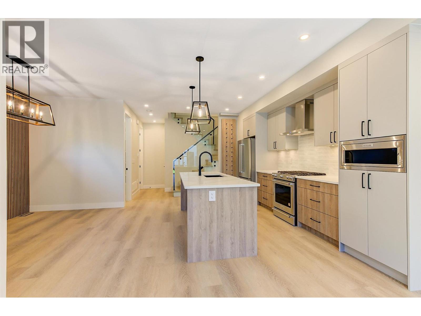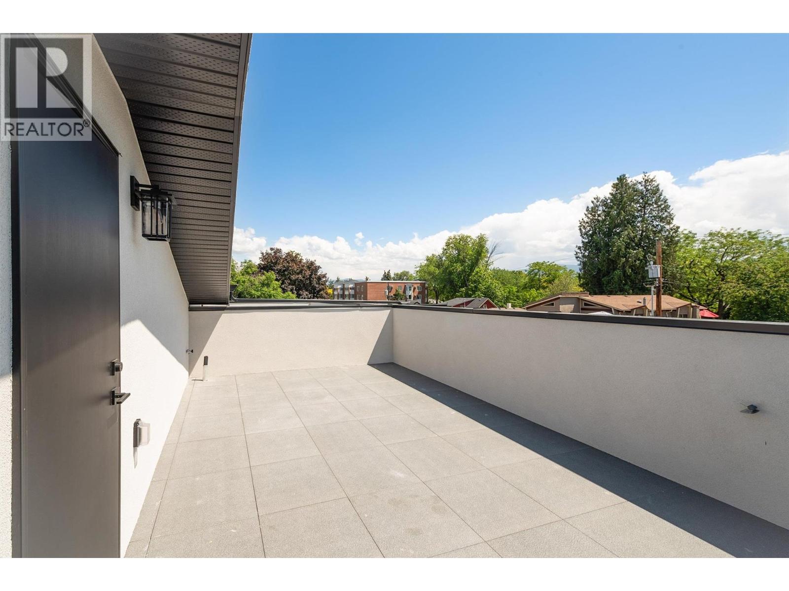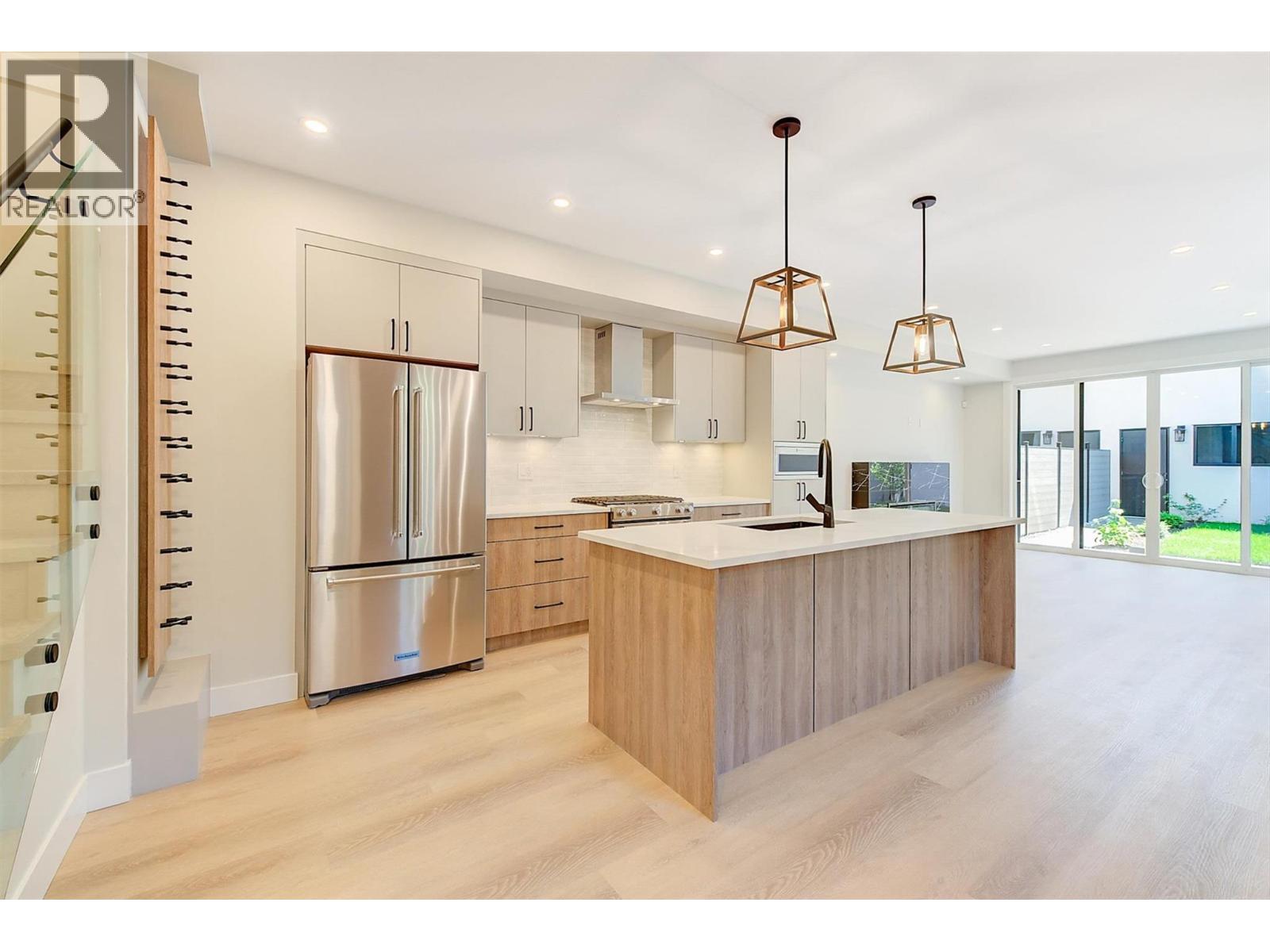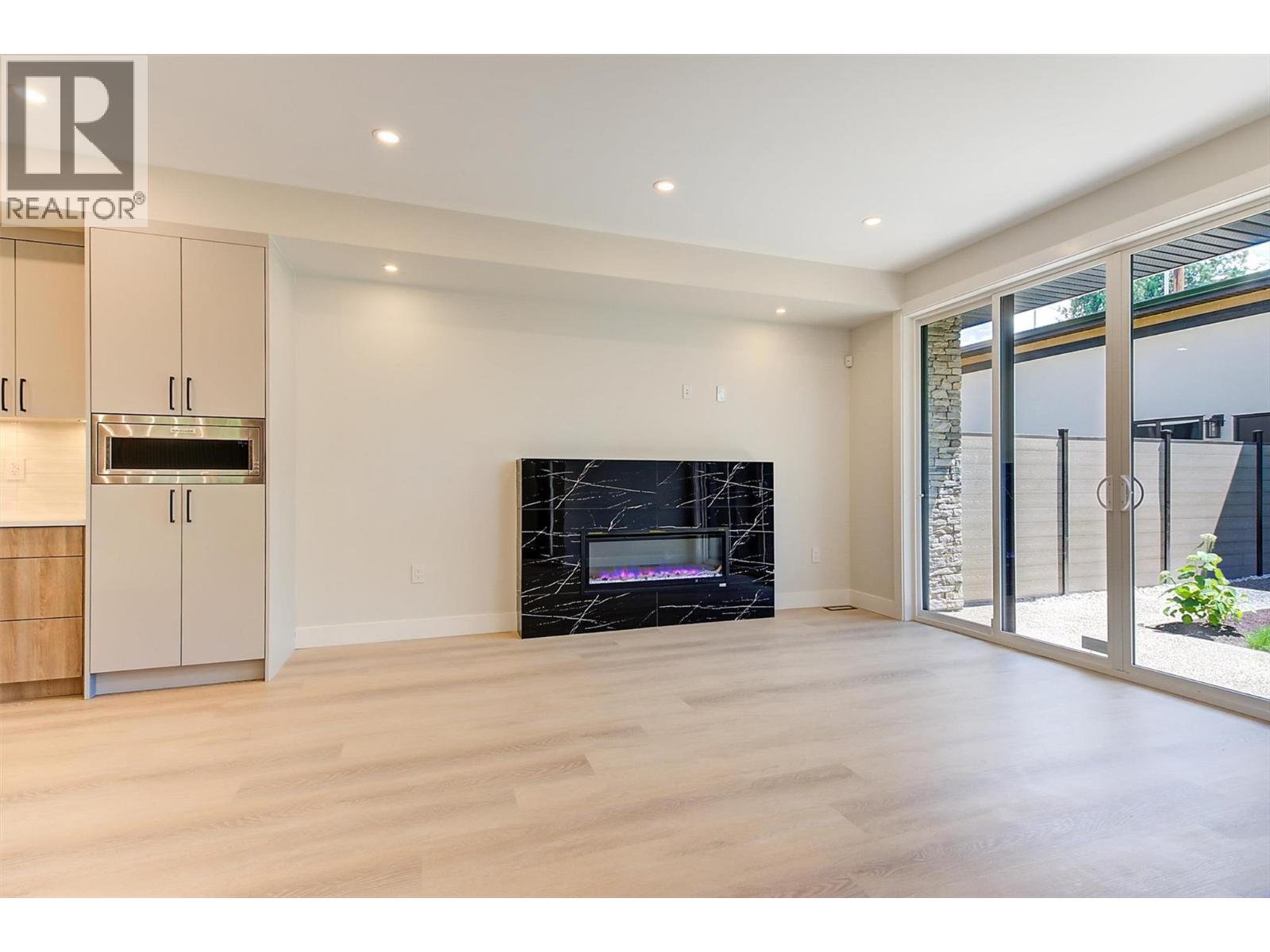 **Discover Luxury Downtown Living** Step into this custom-built, North-facing townhome, offering 3 bedrooms, 2.5 bathrooms, and two stories of exquisite design. Topped with a rooftop patio prepped for a hot tub, this home invites you to embrace the Okanagan’s signature outdoor lifestyle. Every detail has been carefully curated to exude sophistication. Expansive windows fill the space with natural light, complementing the modern exterior of concrete and wood finishes. Inside, the chef-inspired kitchen stands out with a large island, stainless steel appliances, quartz countertops, and a custom backsplash framing the gas stove and 28-inch hood range fan. Throughout the home, premium flooring, a built-in fireplace, and contemporary light fixtures enhance the luxurious ambiance. The primary suite features a spa-like ensuite with a double vanity and a sleek walk-in shower. A large crawl space on the main floor offers ample storage, while the private yard with a covered patio creates your personal oasis. Completing the home is a covered single-car garage with rough-in for an EV charging station, blending convenience with modern living. This townhome isn’t just a residence—it’s a statement of style, comfort, and urban sophistication. Make it yours and elevate your lifestyle today. (id:6770)