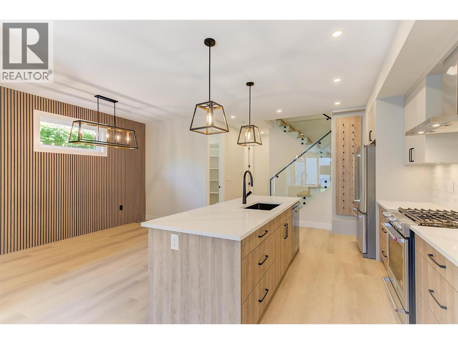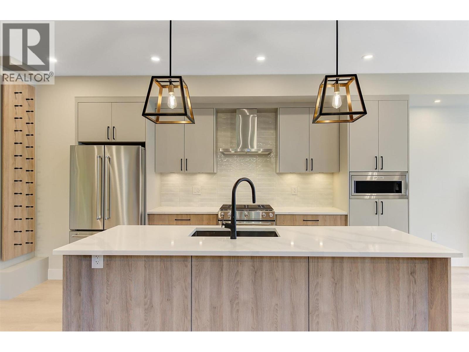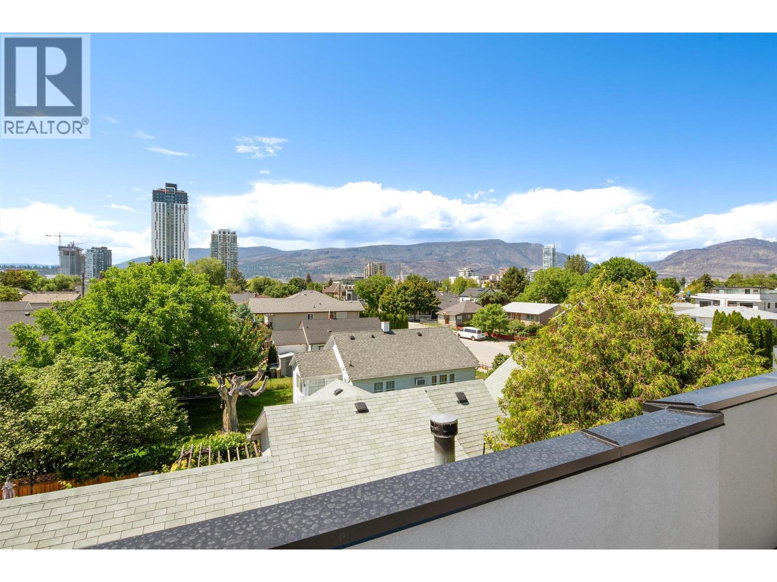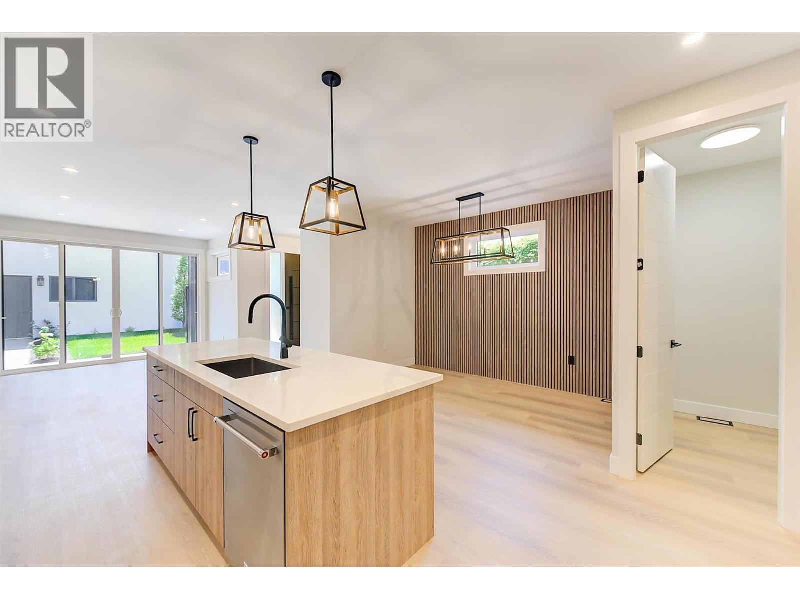 **Discover Luxury Downtown Living** Step into this custom-built, North-facing townhome, offering 3 bedrooms, 2.5 bathrooms, and two stories of exquisite design. Topped with a rooftop patio prepped for a hot tub, this home invites you to embrace the Okanagan’s signature outdoor lifestyle. Every detail has been carefully curated to exude sophistication. Expansive windows fill the space with natural light, complementing the modern exterior of concrete and wood finishes. Inside, the chef-inspired kitchen stands out with a large island, stainless steel appliances, quartz countertops, and a custom backsplash framing the gas stove and 28-inch hood range fan. Throughout the home, premium flooring, a built-in fireplace, and contemporary light fixtures enhance the luxurious ambiance. The primary suite features a spa-like ensuite with a double vanity and a sleek walk-in shower. A large crawl space on the main floor offers ample storage, while the private yard with a covered patio creates your personal oasis. Completing the home is a covered single-car garage with rough-in for an EV charging station, blending convenience with modern living. This townhome isn’t just a residence—it’s a statement of style, comfort, and urban sophistication. Make it yours and elevate your lifestyle today. (id:6770)