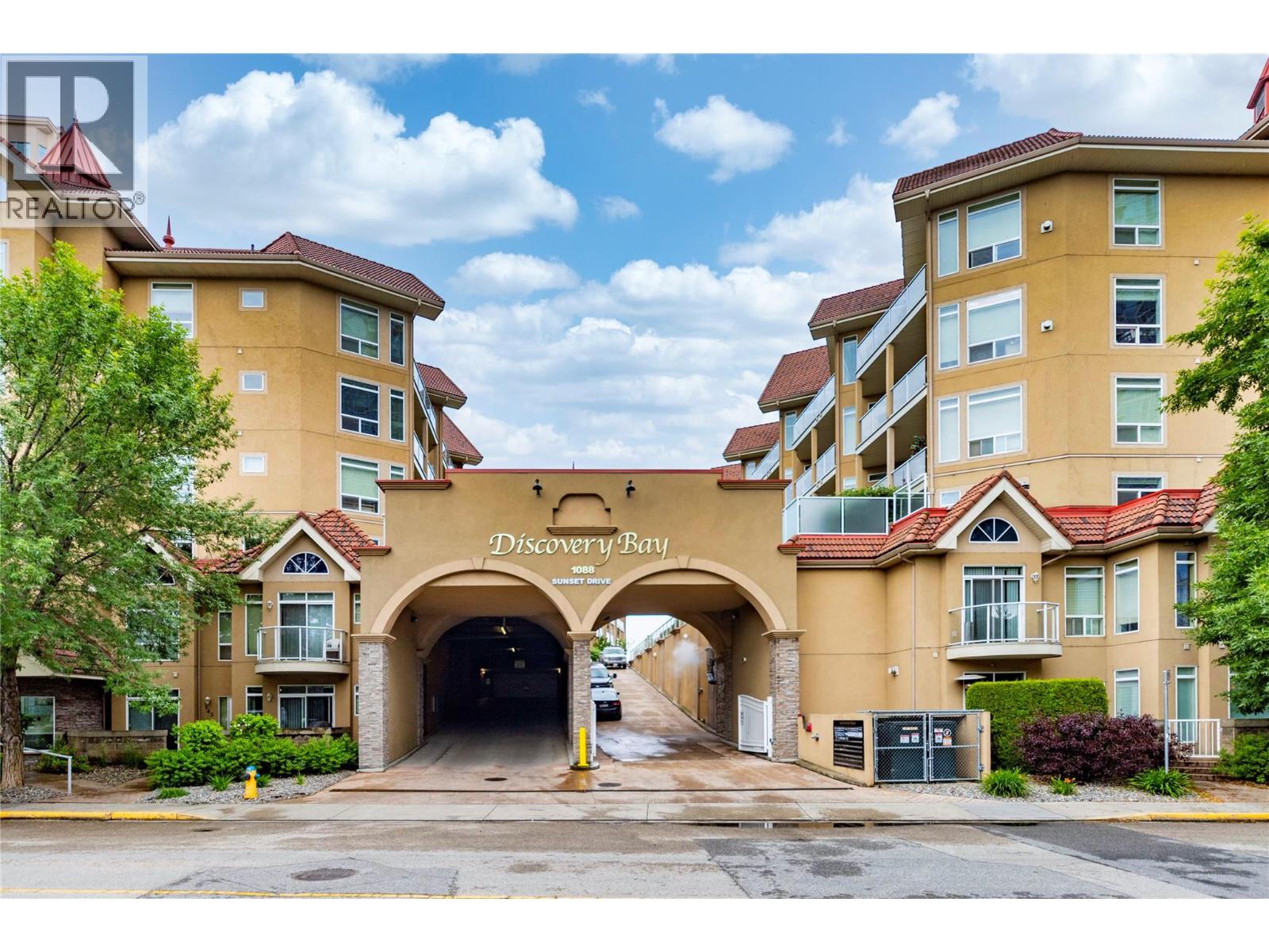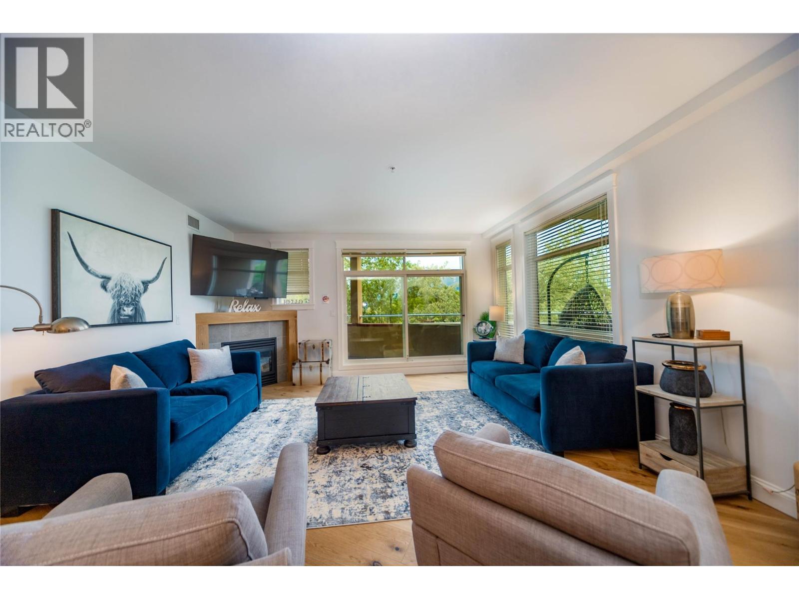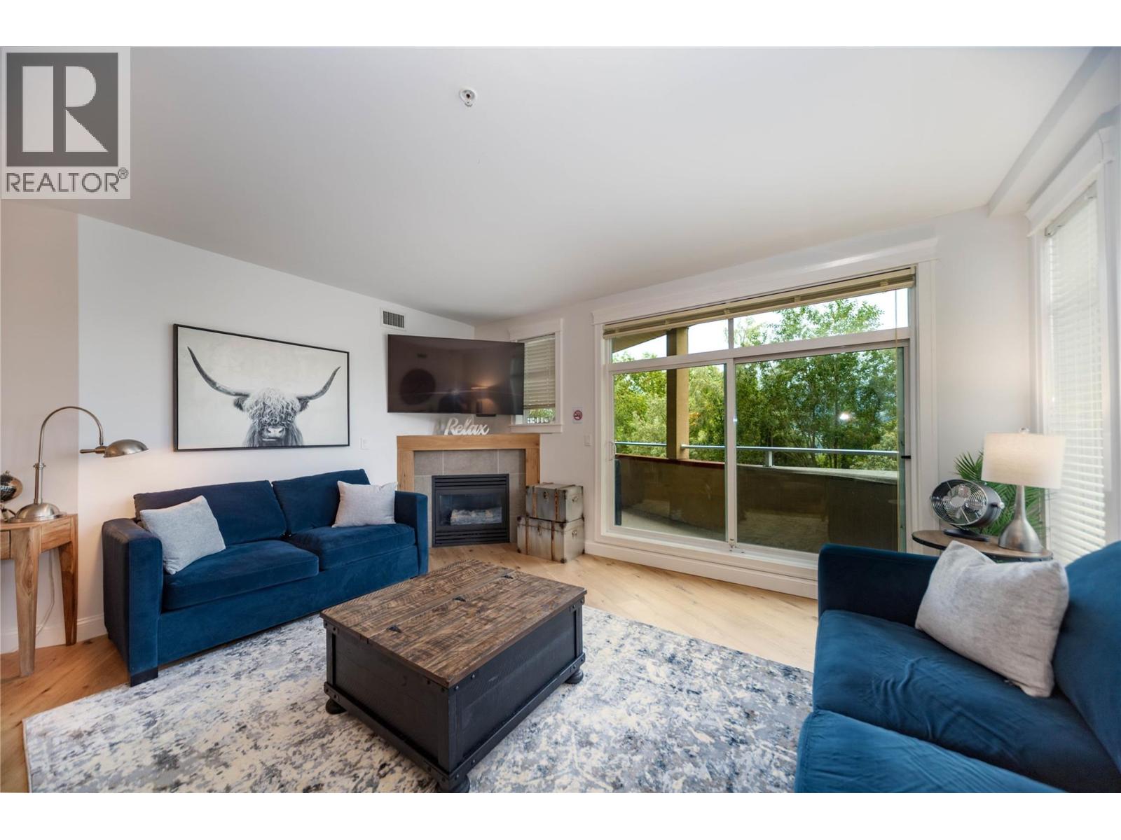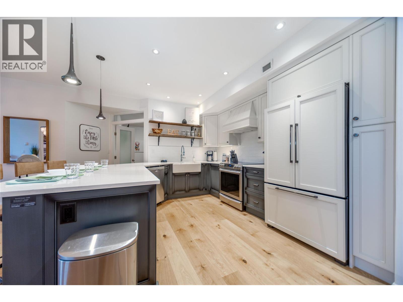 Renovated 3-bed 2-bath suite on the peaceful side of Discovery Bay, right on the shores of Lake Okanagan. With nearly 1,500 sq. ft. of thoughtfully designed living space, this home offers a rare combination of privacy, style, and location. Step inside to white oak engineered hardwood floors, a designer kitchen with custom two-tone cabinetry, quartz countertops, a Bosch whisper-quiet dishwasher, induction/convection oven, and updated lighting throughout. The open layout flows from the kitchen and dining area into the living room, where a tiled gas fireplace creates a warm focal point. Two private decks overlook the bird sanctuary and lush landscaping. Both bathrooms feature heated floors, with the primary ensuite showcasing a spacious walk-in shower. Residents enjoy premium amenities including two pools (one open year-round), two hot tubs, a sauna, fitness centre, and games room—all within walking distance to shops, restaurants, and the beach within the Cultural District. Secure underground parking is included. Pets allowed, 1 small dog or cat. (id:6770)