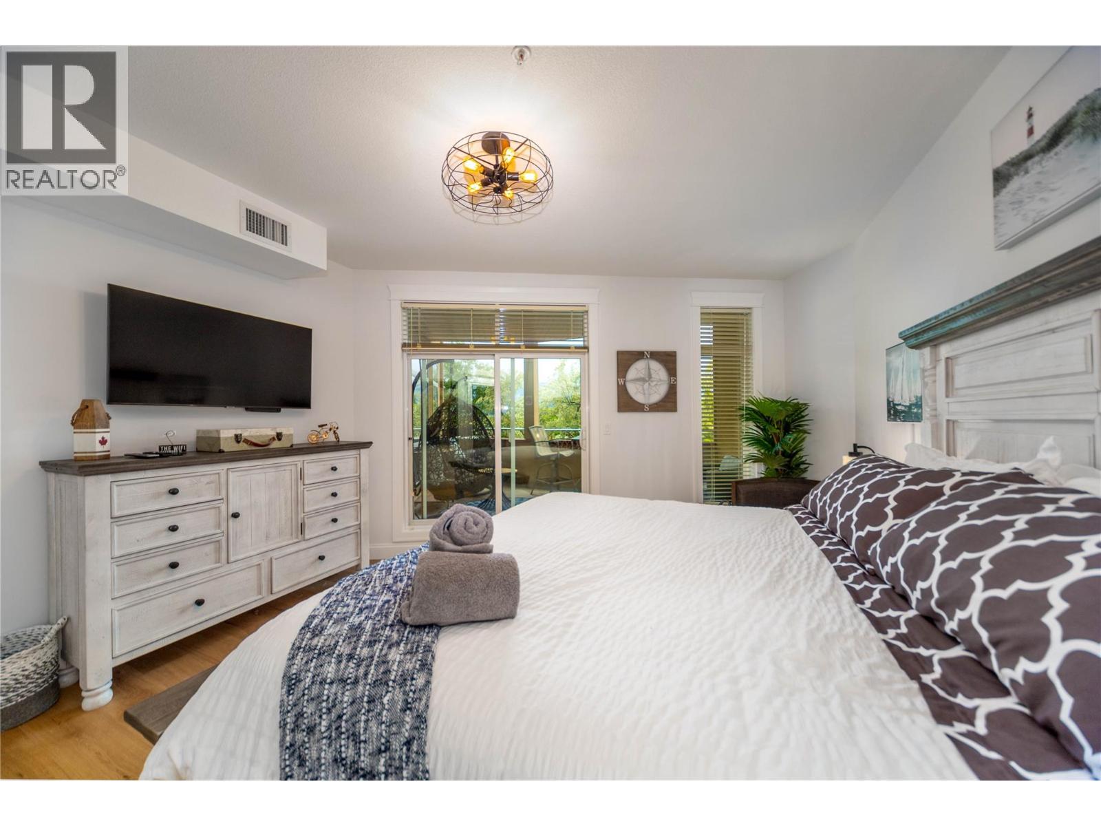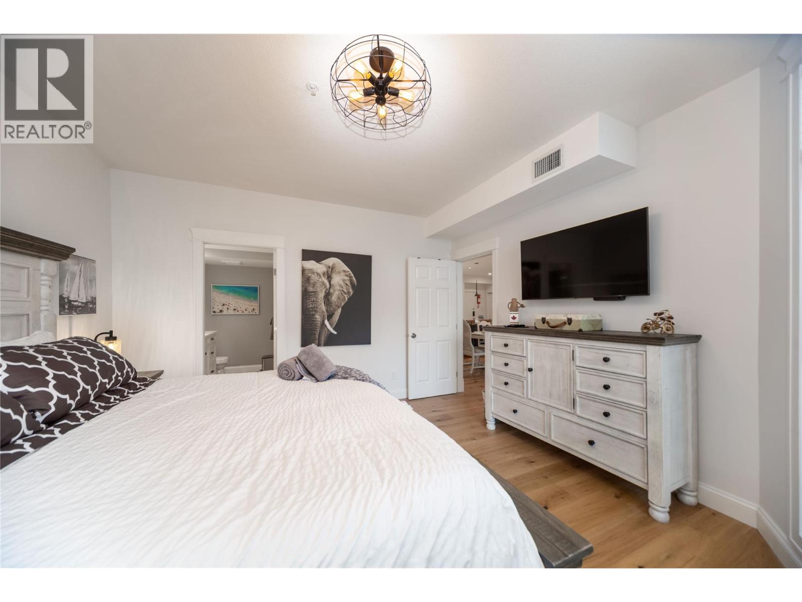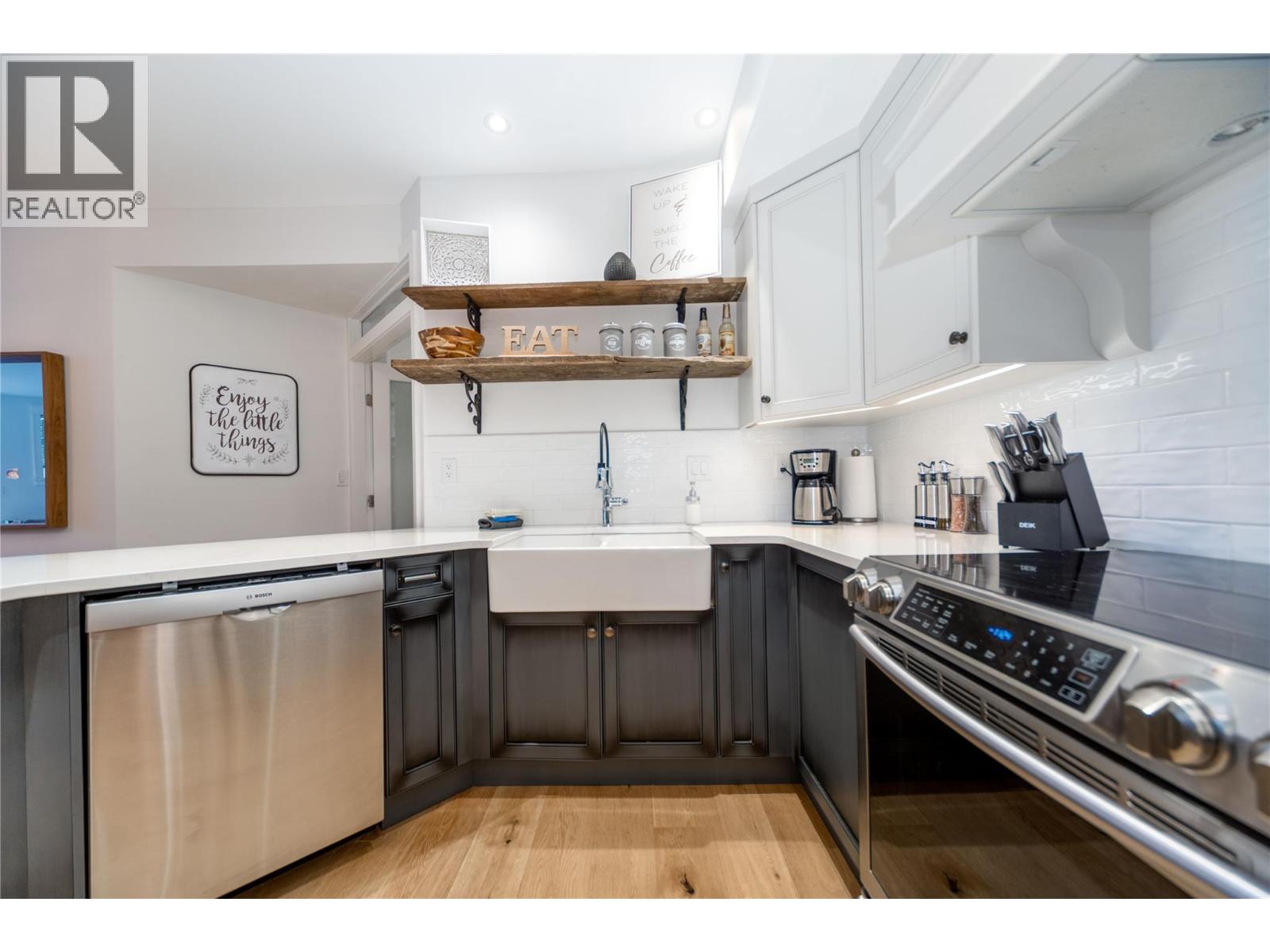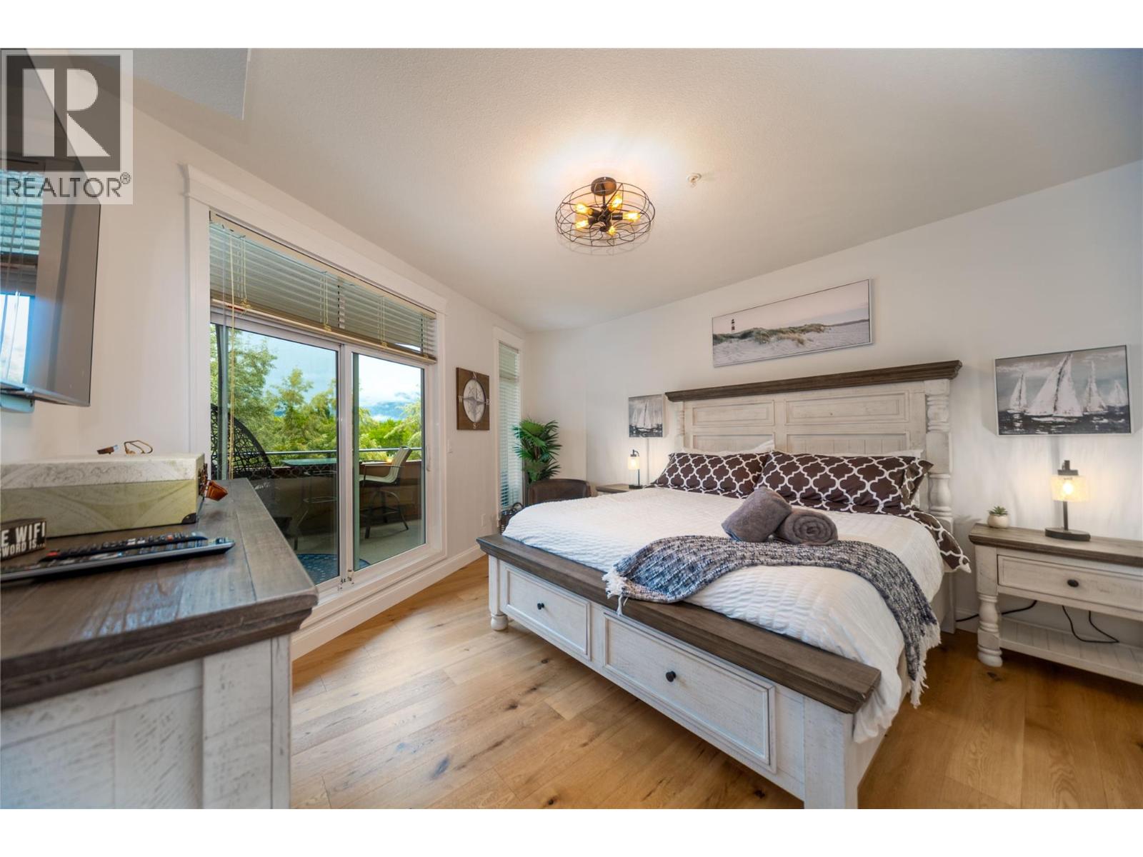 Renovated 3-bed 2-bath suite on the peaceful side of Discovery Bay, right on the shores of Lake Okanagan. With nearly 1,500 sq. ft. of thoughtfully designed living space, this home offers a rare combination of privacy, style, and location. Step inside to white oak engineered hardwood floors, a designer kitchen with custom two-tone cabinetry, quartz countertops, a Bosch whisper-quiet dishwasher, induction/convection oven, and updated lighting throughout. The open layout flows from the kitchen and dining area into the living room, where a tiled gas fireplace creates a warm focal point. Two private decks overlook the bird sanctuary and lush landscaping. Both bathrooms feature heated floors, with the primary ensuite showcasing a spacious walk-in shower. Residents enjoy premium amenities including two pools (one open year-round), two hot tubs, a sauna, fitness centre, and games room—all within walking distance to shops, restaurants, and the beach within the Cultural District. Secure underground parking is included. Pets allowed, 1 small dog or cat. (id:6770)