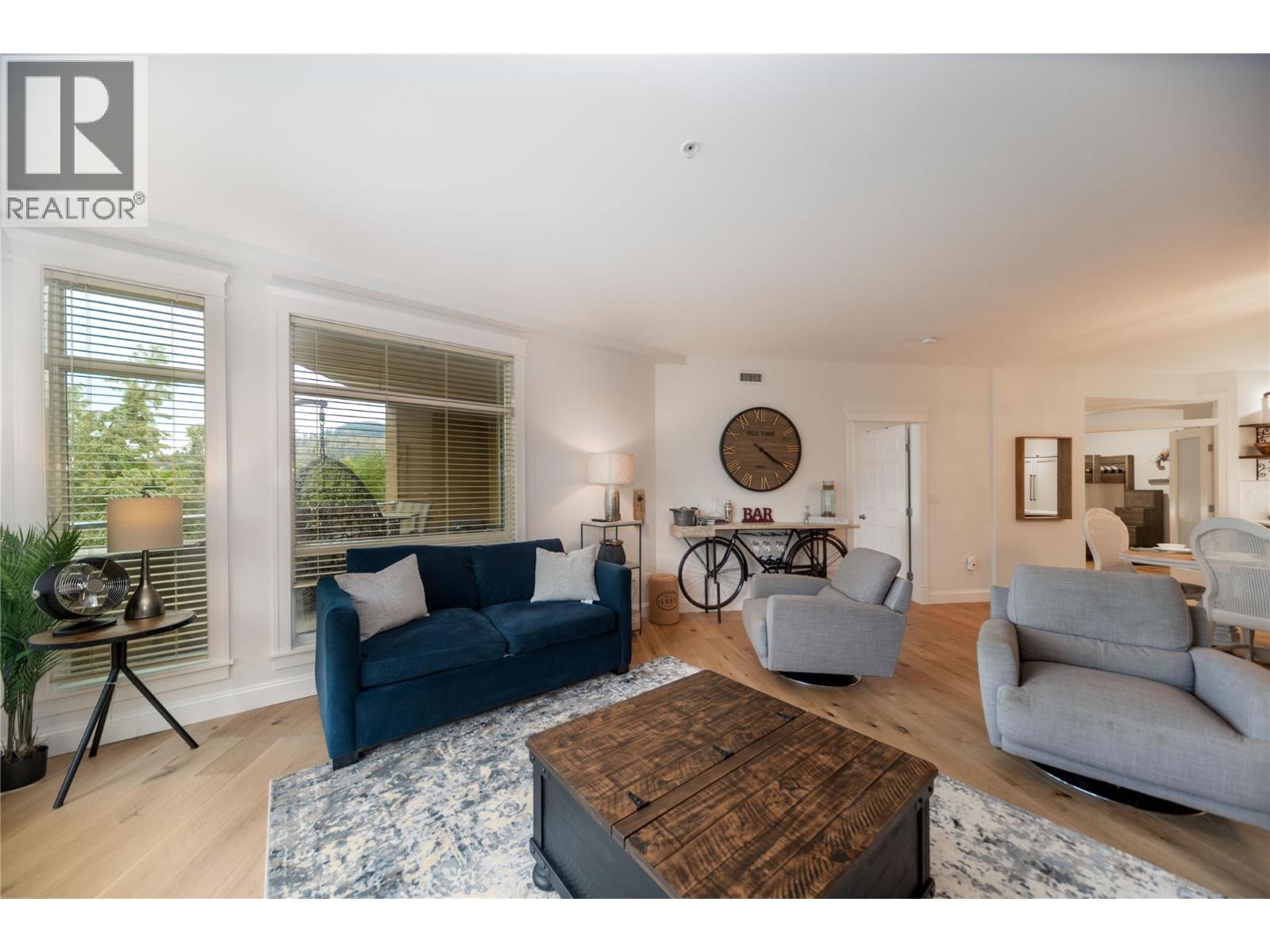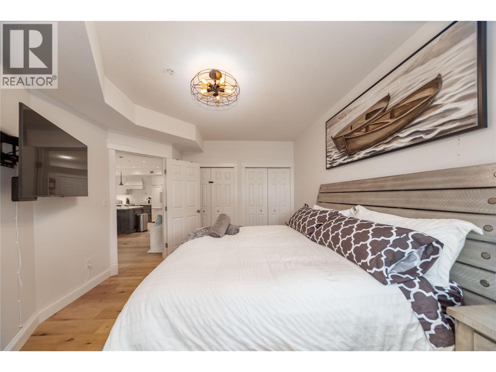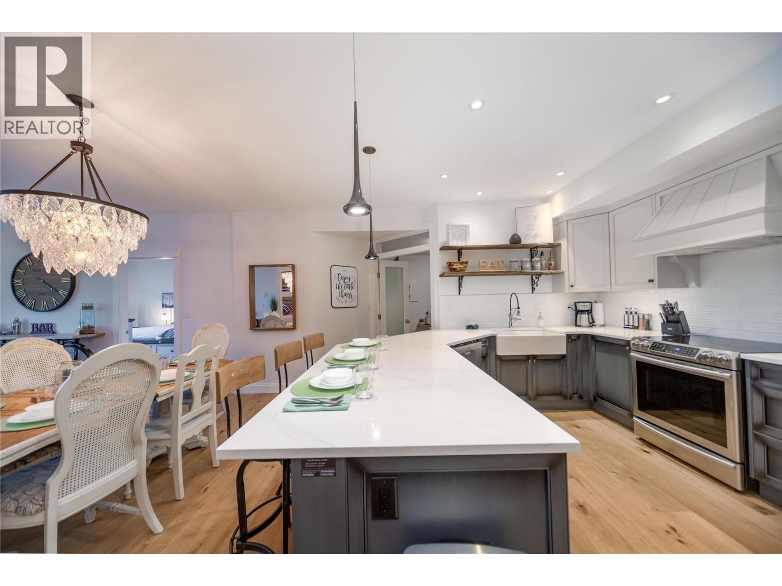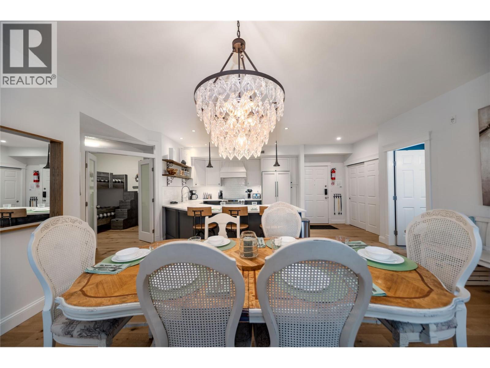 Renovated 3-bed 2-bath suite on the peaceful side of Discovery Bay, right on the shores of Lake Okanagan. With nearly 1,500 sq. ft. of thoughtfully designed living space, this home offers a rare combination of privacy, style, and location. Step inside to white oak engineered hardwood floors, a designer kitchen with custom two-tone cabinetry, quartz countertops, a Bosch whisper-quiet dishwasher, induction/convection oven, and updated lighting throughout. The open layout flows from the kitchen and dining area into the living room, where a tiled gas fireplace creates a warm focal point. Two private decks overlook the bird sanctuary and lush landscaping. Both bathrooms feature heated floors, with the primary ensuite showcasing a spacious walk-in shower. Residents enjoy premium amenities including two pools (one open year-round), two hot tubs, a sauna, fitness centre, and games room—all within walking distance to shops, restaurants, and the beach within the Cultural District. Secure underground parking is included. Pets allowed, 1 small dog or cat. (id:6770)