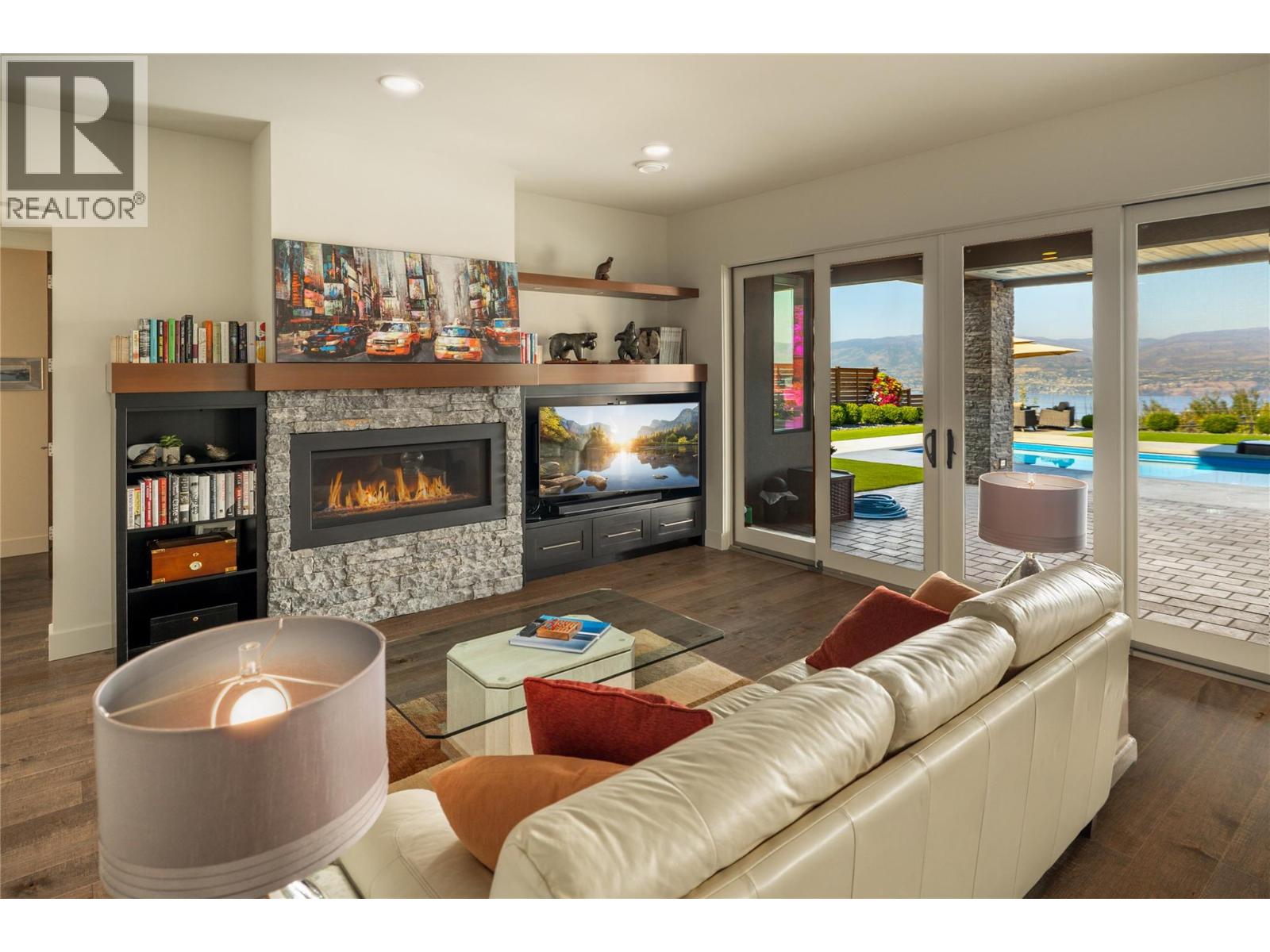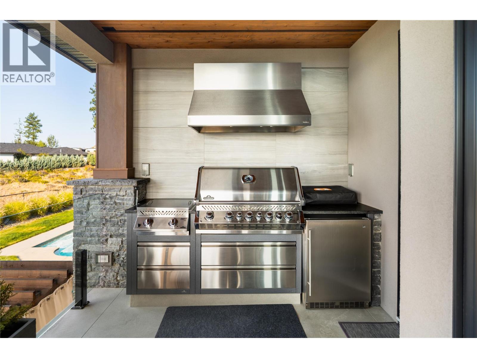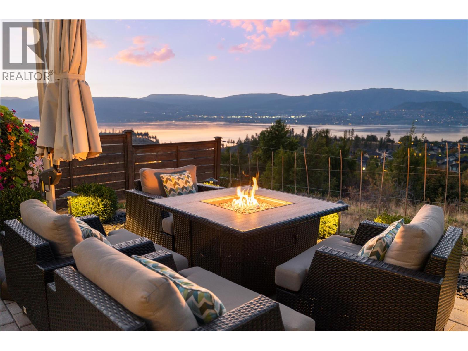 Stunning panoramic views of the lake down to Vernon, vineyards, the bridge and the city lights. Enjoy the natural green space behind the home that further enhances the views. Built by Bill Frame, this home showcases exceptional craftsmanship throughout with wide-plank wood floors, soaring ceilings, and walls of glass with the Okanagan landscape as the backdrop. The main level is a chef’s delight with Thermador appliances, functional oversized island, and butler’s pantry. Open-concept living and dining areas flow seamlessly to the covered deck, complete with full outdoor kitchen, ceiling fan, built-in heaters, and automated blinds—perfect for year-round entertaining. Enjoy the main floor primary with serene lake views, spa-like ensuite with dual vanities, soaker tub, oversized shower, skylights, heated floors, and custom walk-in closet. An office and convenient laundry complete the main level. The lower floor is perfect for entertaining all your guests with a wet bar, temperature-controlled wine room, fitness space, and large rec and family rooms. Walls of glass open to the backyard oasis featuring a heated saltwater pool, pergola-covered hot tub, lounging areas, and fire pit. Additional highlights include Bolivian walnut doors, upgraded security, Culligan water softener, reverse-osmosis purifier, and a garage with epoxy floors, workshop, EV charger, and mezzanine. Landscaped grounds with a dining patio and water feature complete this Kettle Valley masterpiece with zero maintenance yard to enjoy the full Okanagan lifestyle (id:6770)