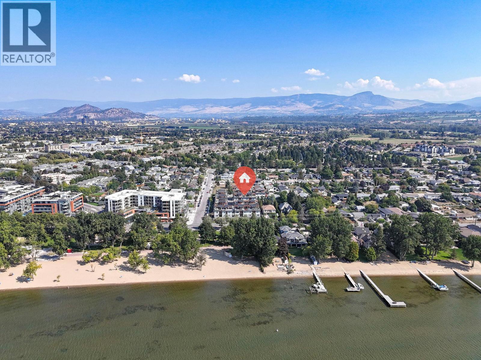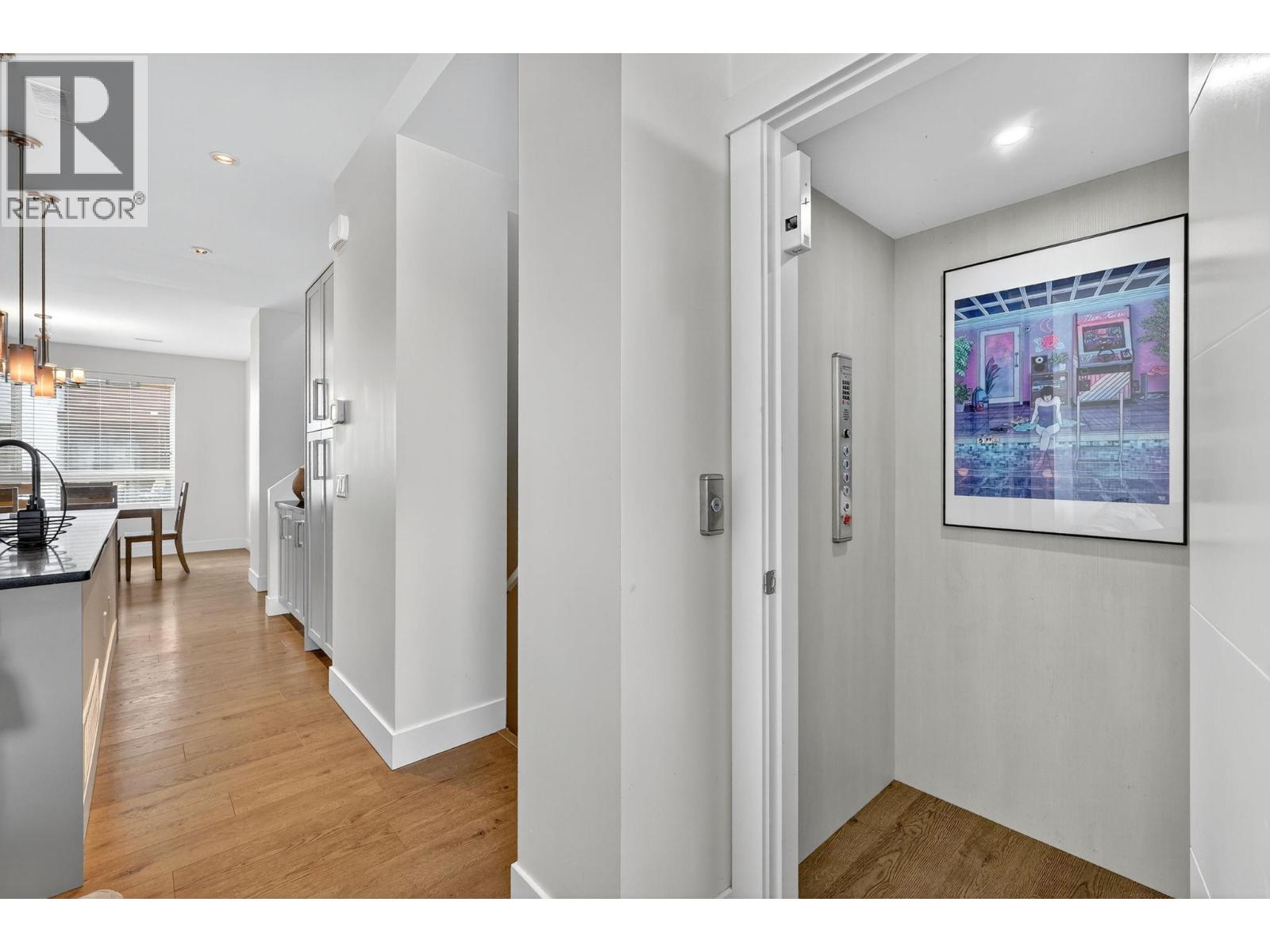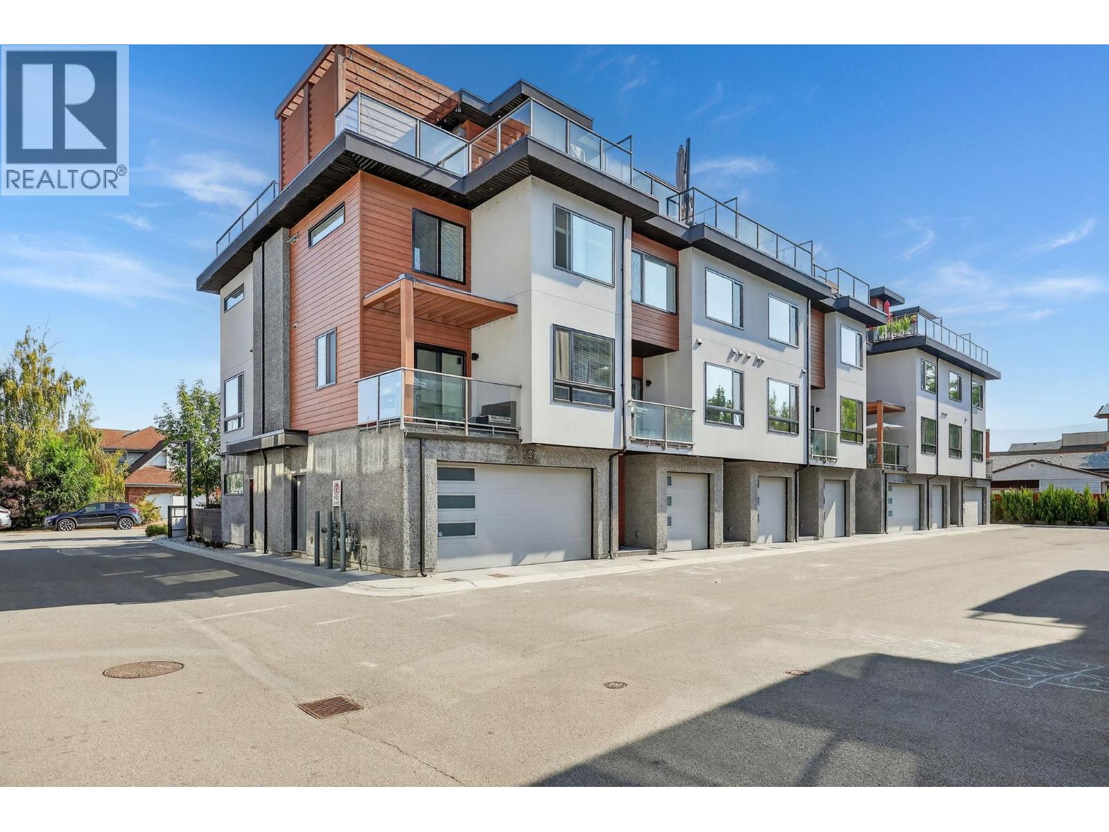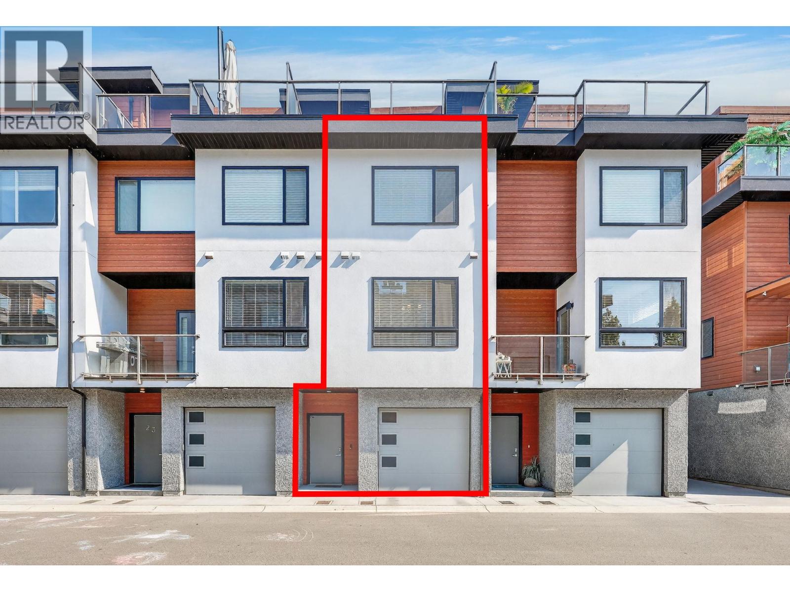 Welcome to luxury living in one of the most walkable neighbourhoods, just steps from Gyro Beach, Okanagan Lake, shopping, and dining. This stunning 2-bedroom, 2-bath townhouse offers nearly 1,500 sq. ft. of intelligently designed space, complete with a private in-unit elevator. The highlight is a rare 600 sq. ft. rooftop patio—perfect for entertaining or unwinding with unbeatable views. Inside, you’ll find an open-concept kitchen with a large island with built-in sink, quartz counters, soft-close cabinetry, stainless steel appliances, and a gas range. The bright living space is located on the quiet side of the building, offering both privacy and comfort. The second bedroom includes a convenient Murphy bed, maximizing versatility. The attached double garage provides secure parking and excellent storage with a ceiling/wall storage system, while additional street parking is right outside your door. Extras include a built-in vacuum, heated ensuite floors, forced air heat, central air conditioning and modern finishes throughout. Rooftop patios like this rarely come to market—especially this close to the water. Bring you pets as you can have one dog or one cat and there is no size restriction on dogs! Don’t miss your chance to own a true gem in the heart of the Okanagan. (id:6770)