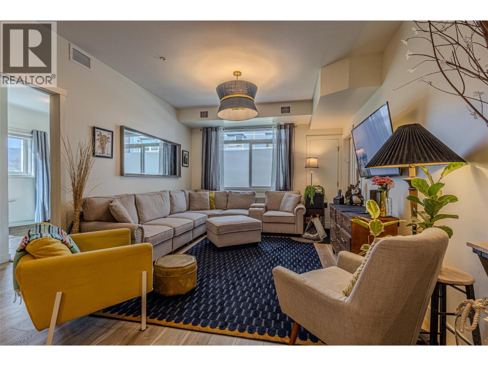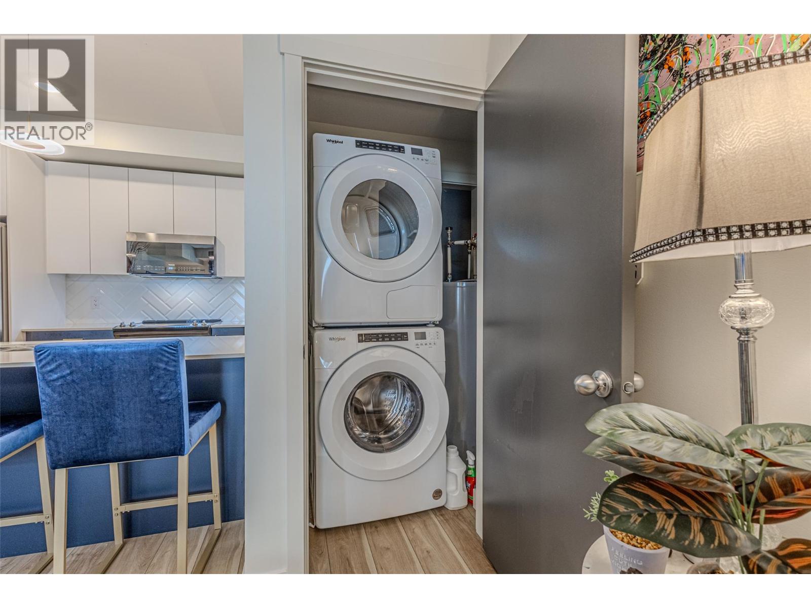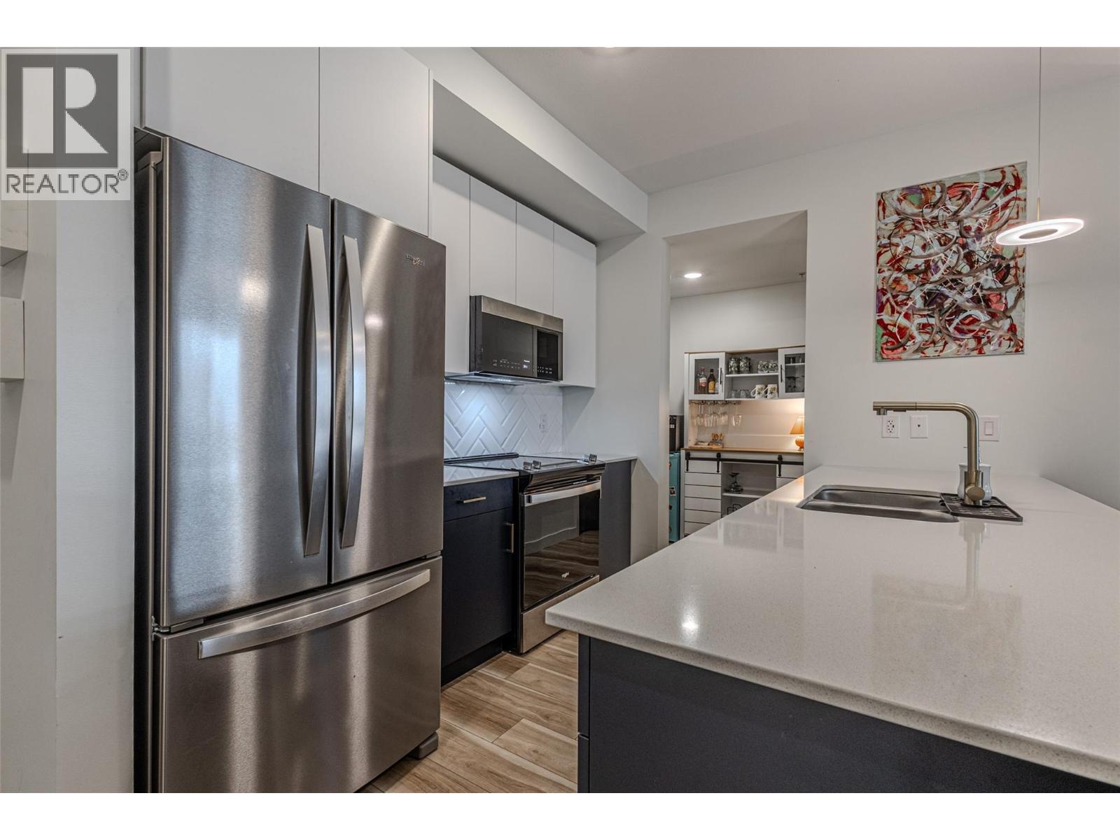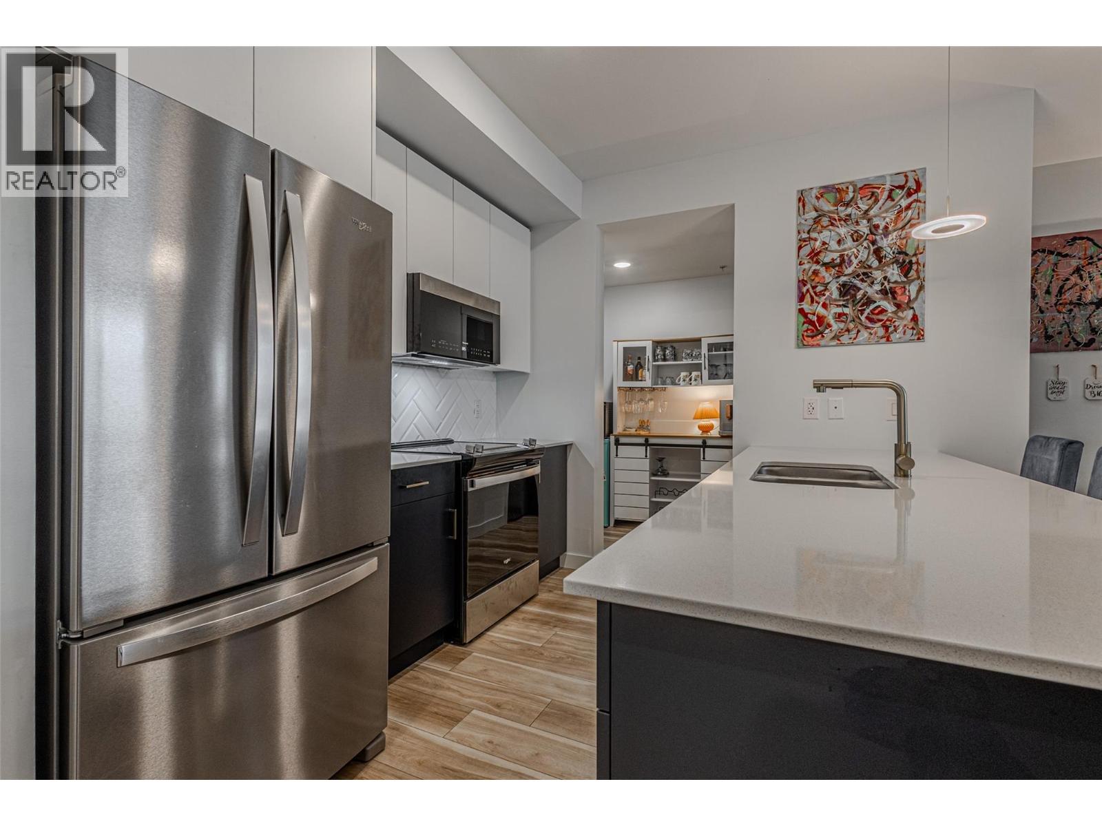 A welcoming, fully renovated, 2-bedroom, 2-bath+den in a fantastic location within the modern NEO residence! Walking distance to new park space and a paved creek feature walkway that travels through Majoros park up to shopping and amenities. Also easily walkable to the Gellatly Bay - providing an aquatic park, dog park, dock, marina, beaches and a 2km lakeside walking trail. 302 is a corner unit with views of Majoros park greenery, more privacy and an additional window with no parking lot view! Upgraded soundproof flooring and ceilings with 18cm gypcrete for comfort. Functional split bedroom, high ceilings making the space feel bright and large. Kitchen contains custom 2 tone cabinets with chevron tiling backsplash and oversized island - great for hosting! Entire unit has new vinyl flooring, lighting upgrades, shower upgrades and a walk-in-closet. Unit comes with an underground parking stall and brand new appliances. NEO residence was constructed in 2018 and certified green with solar panels reducing strata fees and the unit has a green brand-new HRV system providing heat and air conditioning reducing hydro bills. The building provides a communal large rooftop patio with panoramic views and a gas BBQ for socializing. Several community garden boxes are available. NEO is located just off the wine trail with 17 wineries and 9 dining options. Rentals allowed and pet-friendly allowing 2 dogs or 2 cats or 1 of each. Book your viewing today! (id:6770)