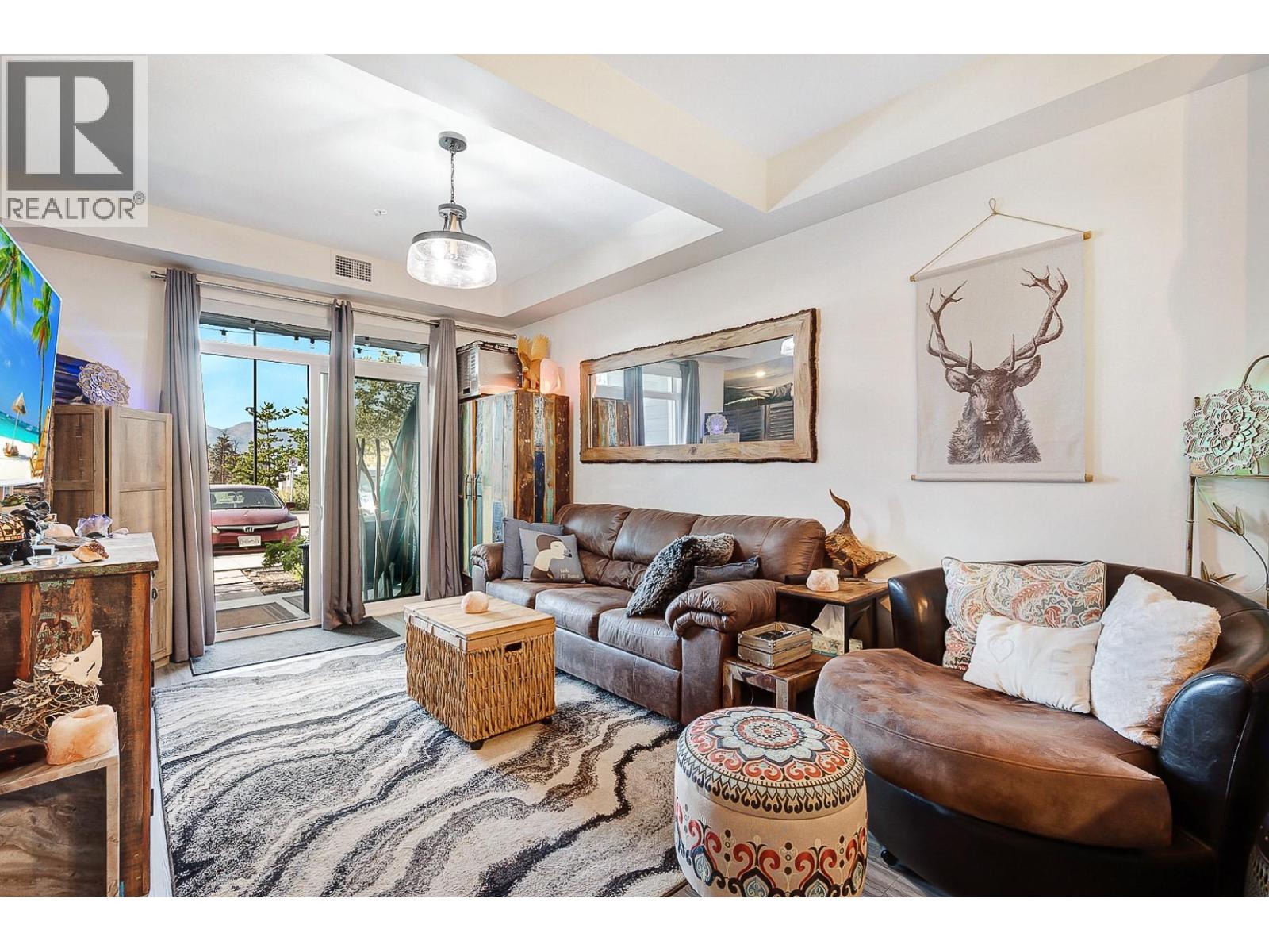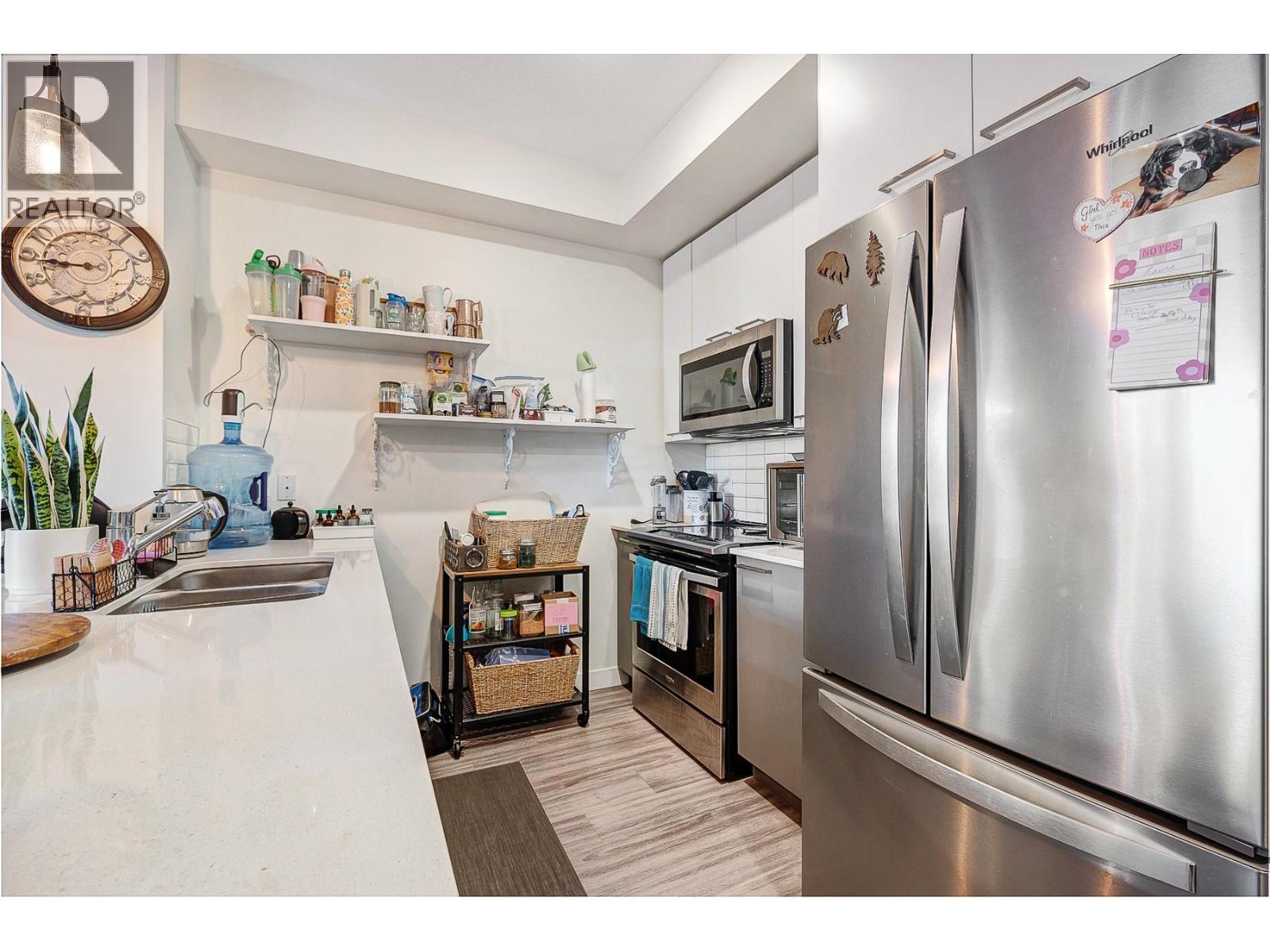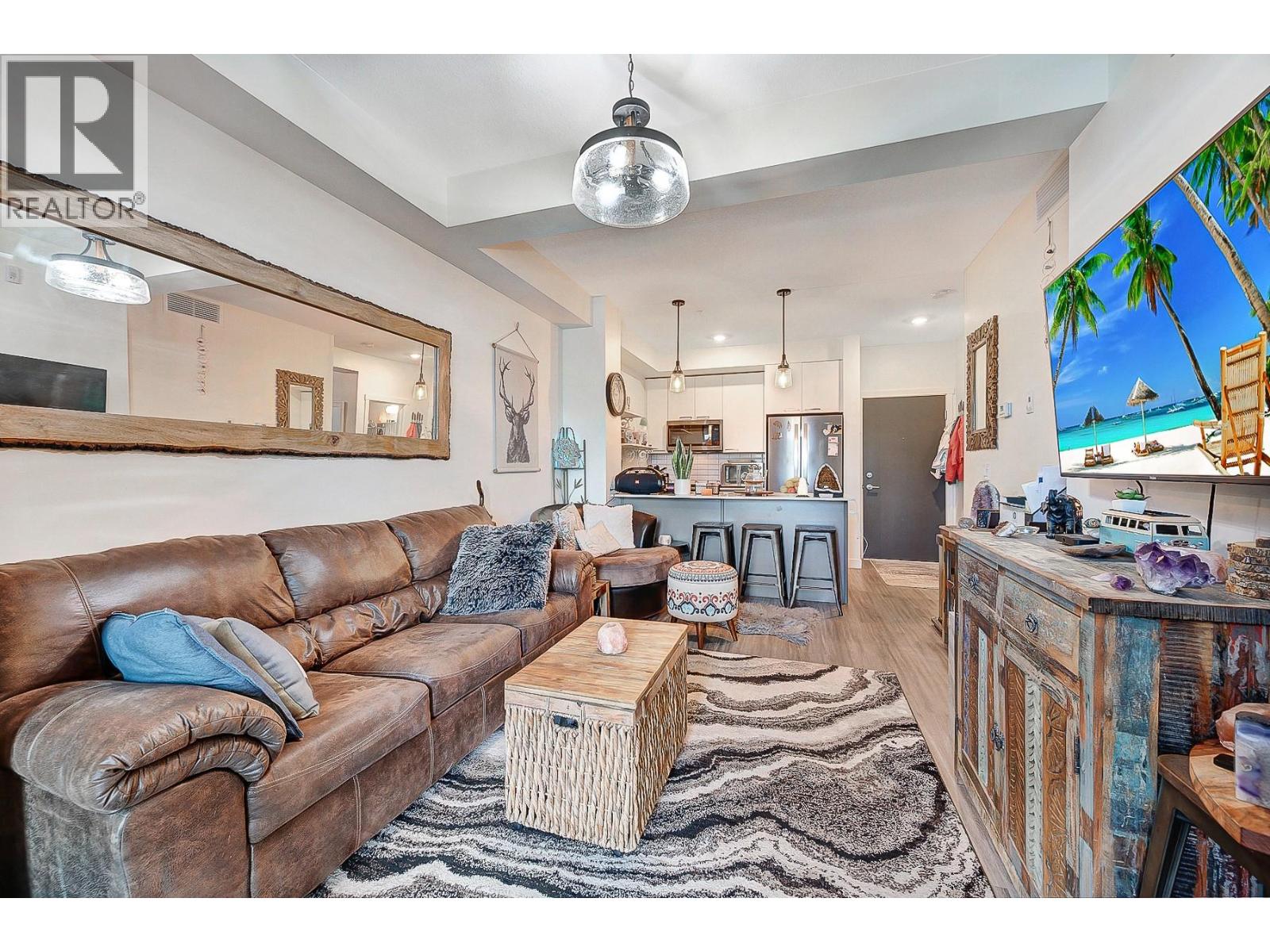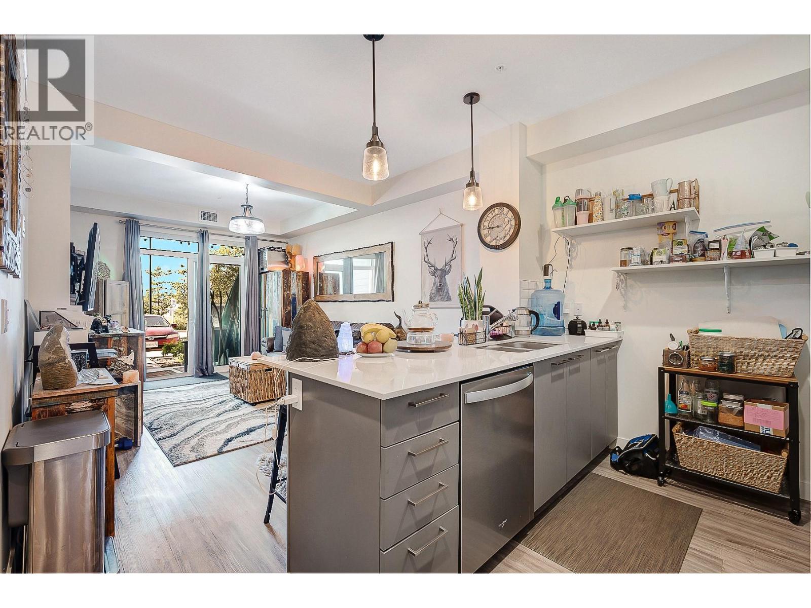Ground Floor 1-Bedroom at NEO – Lake Views, Low Strata, Pet Friendly! Where lifestyle meets location, this ground floor 1-bedroom suite offers direct exterior access, beautiful lake and mountain views, low strata fees, and a pet-friendly policy with no size restrictions—making it ideal for pet owners, first-time buyers, or investors. Step into a sleek, modern interior featuring a white-on-white kitchen with full-height cabinetry, subway tile backsplash, quartz countertops, stainless steel appliances, and bar seating. The open-concept living area is elevated with a stylish beam and chandelier, while glass patio doors flood the space with natural light and connect to your outdoor space. The spacious bedroom & 4-piece bathroom with vanity storage provide comfort and function. Durable laminate flooring runs throughout. The complex also borders a peaceful creekside walking path, perfect for morning strolls or dog walks. Enjoy incredible shared amenities, including a rooftop patio with BBQ and panoramic views, community gardens, and efficient building systems such as LED common lighting and recirculation lines for nearly instant hot water. Located just an 8-minute walk from Gellatly Bay Aquatic Park, with beaches, dog park, zipline, pier, and waterfront paths—plus shopping, restaurants, and West Kelowna’s famous Wine Trail all nearby. This stylish, low-maintenance home is the perfect blend of lifestyle, location, and value! (id:6770)
