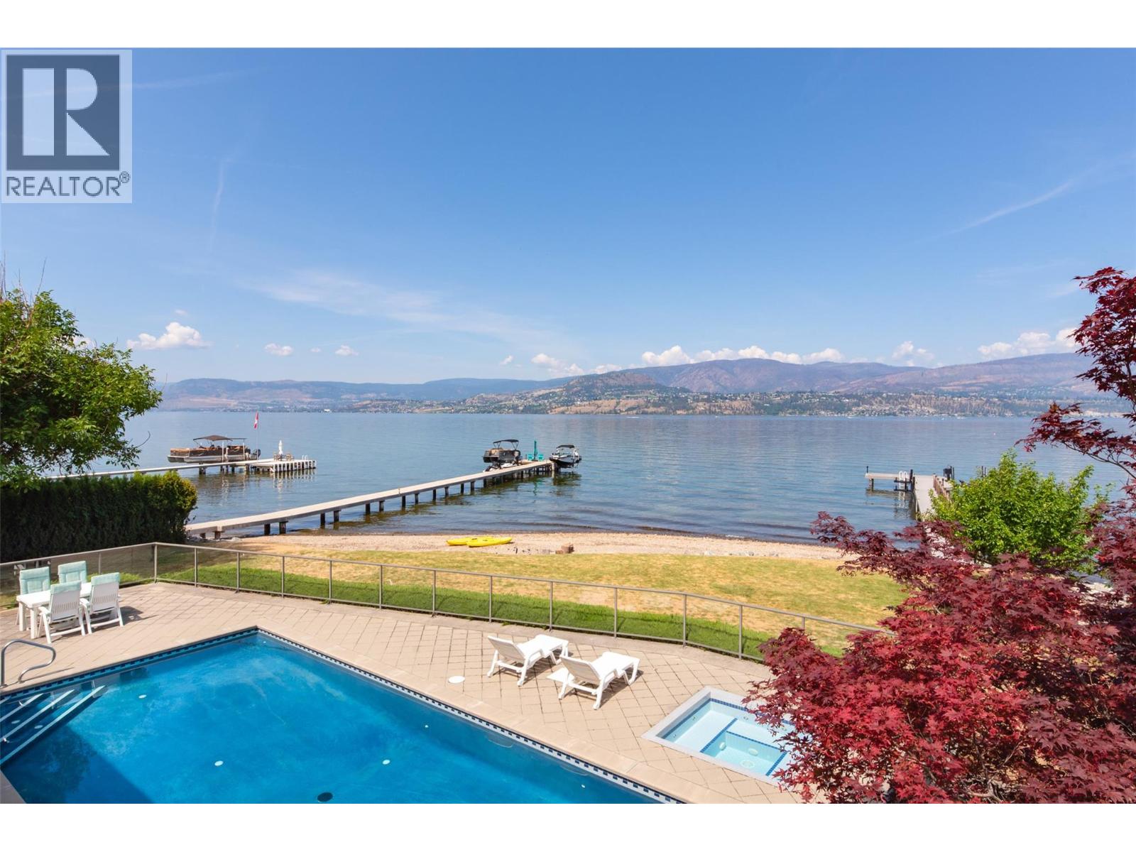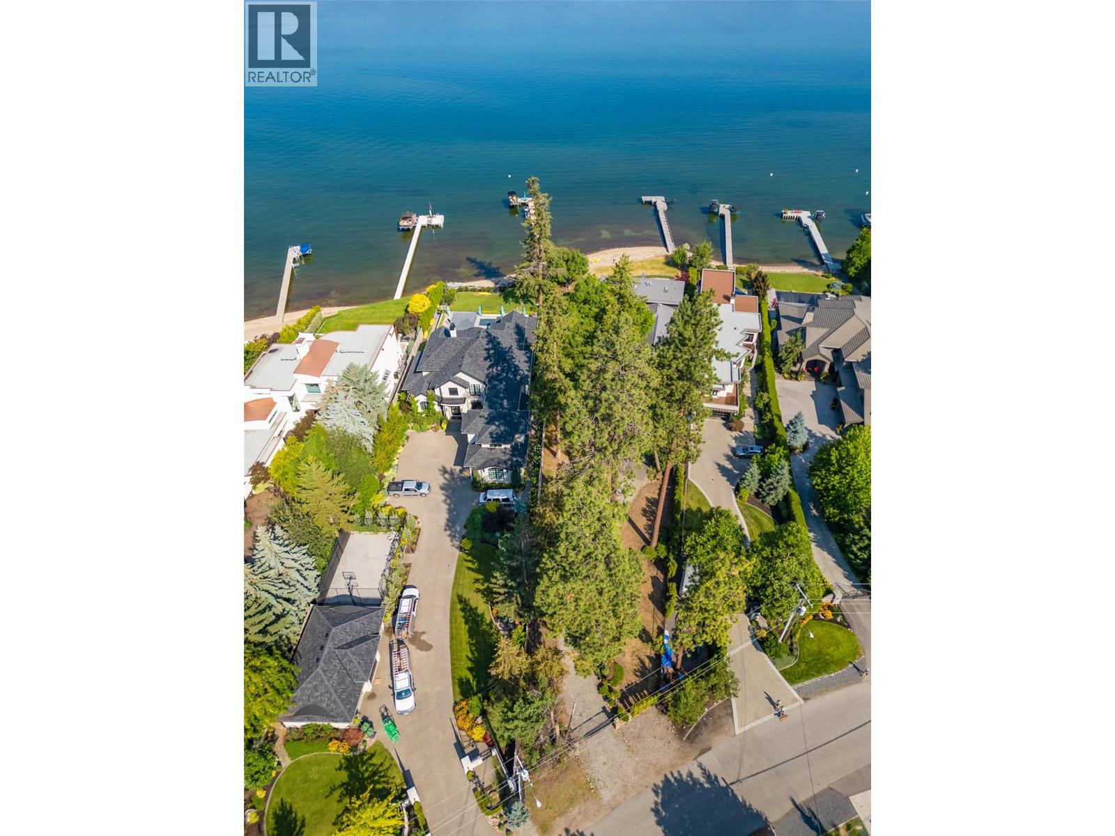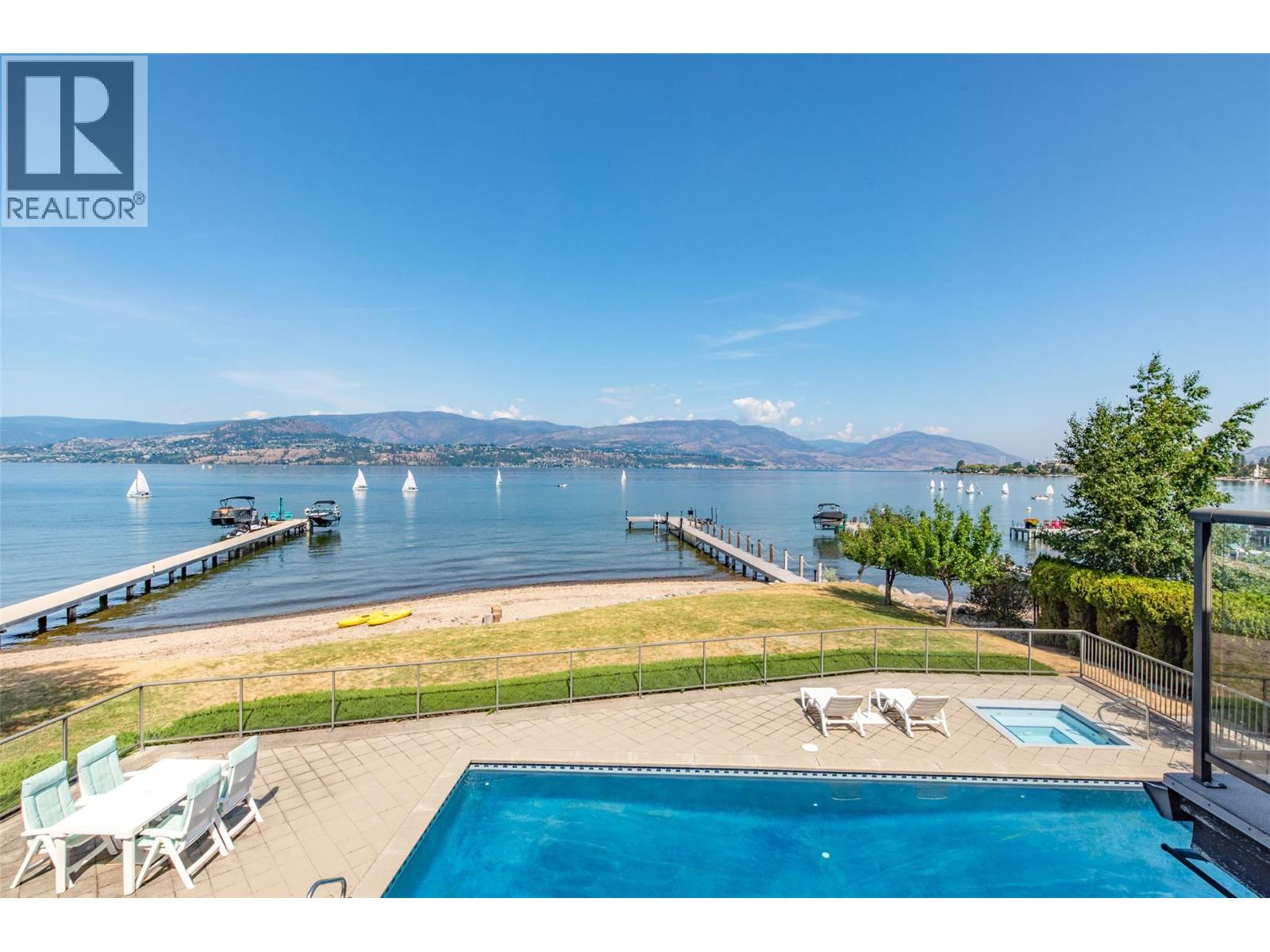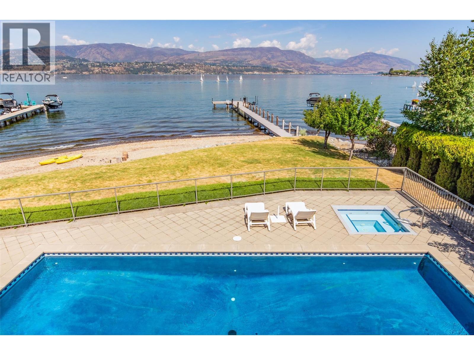 GORGEOUS .79 ACRE HOBSON ROAD LAKESHORE OFFERING! Situated on one of the most Prestigious streets in Kelowna offering a private .79 acre setting & featuring 120 ft. of Gorgeous Sandy lakefront on an almost peninsula shaped lot stretching out into the beautiful Okanagan Lake. Enjoy an unobstructed sandy Beach and Lake setting! Gated access welcomes you in with a Meandering Driveway, Stately Old growth trees, tons of parking, and covered parking for up to 6 cars total. This Executive Old English Cottage Style styled two story home offers a 6 bedroom, 5 bathroom home, Wood shake siding and low maintenance aluminum roof. Attached 1 Bedroom coach house with separate garage for Inlaws, gardener or mortgage helper. Expansive grounds for your enjoyment. Concrete In-ground Pool and Patio enjoys the private and expansive lake views, and direct access to the wide beach. Long and Large 2019 rebuilt pile driven deep water Dock with 2 electric jet ski lifts, and boat lift with Trex boards. Spacious 1998 Built Home offers a Maple Kitchen, Oak hardwood floors, 6 bedroom home, 5 bathrooms. Primary bedroom suites up and down. Tons of wall to wall windows and glass sliding doors to bring outdoors in. Expansive King-sized primary up with Gas FP, lounge area, luxurious ensuite. Double Attached Garage plus Detached Triple Garage. Located on one of Kelowna's most Exclusive High End Lakeshore Streets offering Privacy, Peace, Park like grounds, and Prestige! (id:6770)