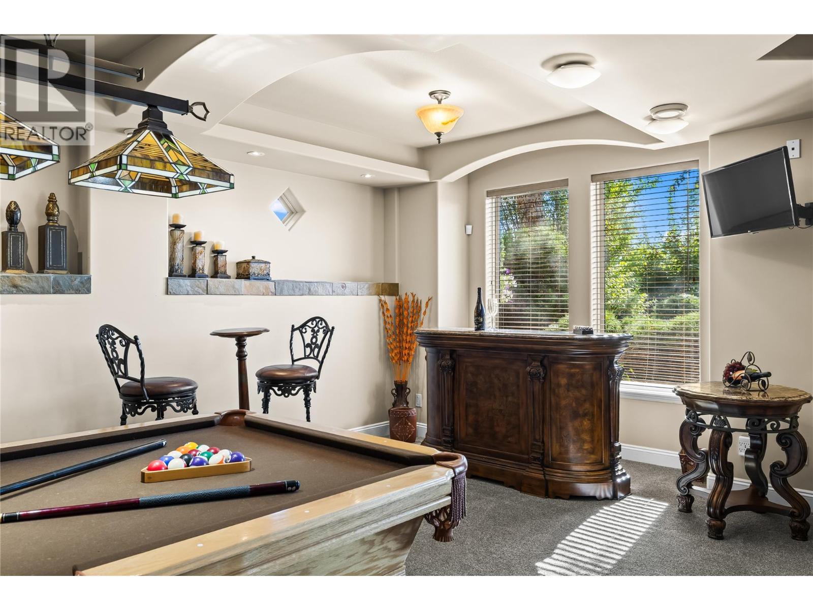 This exceptional lake view West Kelowna estate has a welcoming entrance through a grand wood front door. The stunning interior features a custom art stone wall with a built-in fireplace and archway leading to the media theatre room—perfect for movie nights. The spacious rec room with a bar, pool table, and seating is ideal for entertaining. Adjacent to the foyer, there is a large bedroom/office that offers an ideal work from home set up with its own separate entrance. The lower level includes 2 more bedrooms, full bath, and laundry room. Up the lit staircase is an open-concept main level filled with natural light. The chef’s kitchen boasts a large island with wine storage, 2 sinks, a KitchenAid fridge, gas range, and a walk-in pantry. An expansive breakfast nook overlooks the stunning lake and mountain views and a bar area that boasts mahogany cabinets, wine fridge, and a seating area. A bright, spacious sitting room with vaulted wood panelled ceilings offer views of the backyard paradise through large windows. The primary suite features a generous walk-thru closet and an ultra-luxurious ensuite—tiled shower, sunken soaker tub, and an elegant makeup area. Two more bedrooms, and 2 additional bathrooms complete this level. Out back, the landscaped yard has a stone patio, hot tub, pond with waterfall, multiple seating areas, fire table, built-in BBQ with bar fridge, and outdoor bar with sink and fridge—perfect for entertaining with panoramic lake and mountain views. (id:6770)
