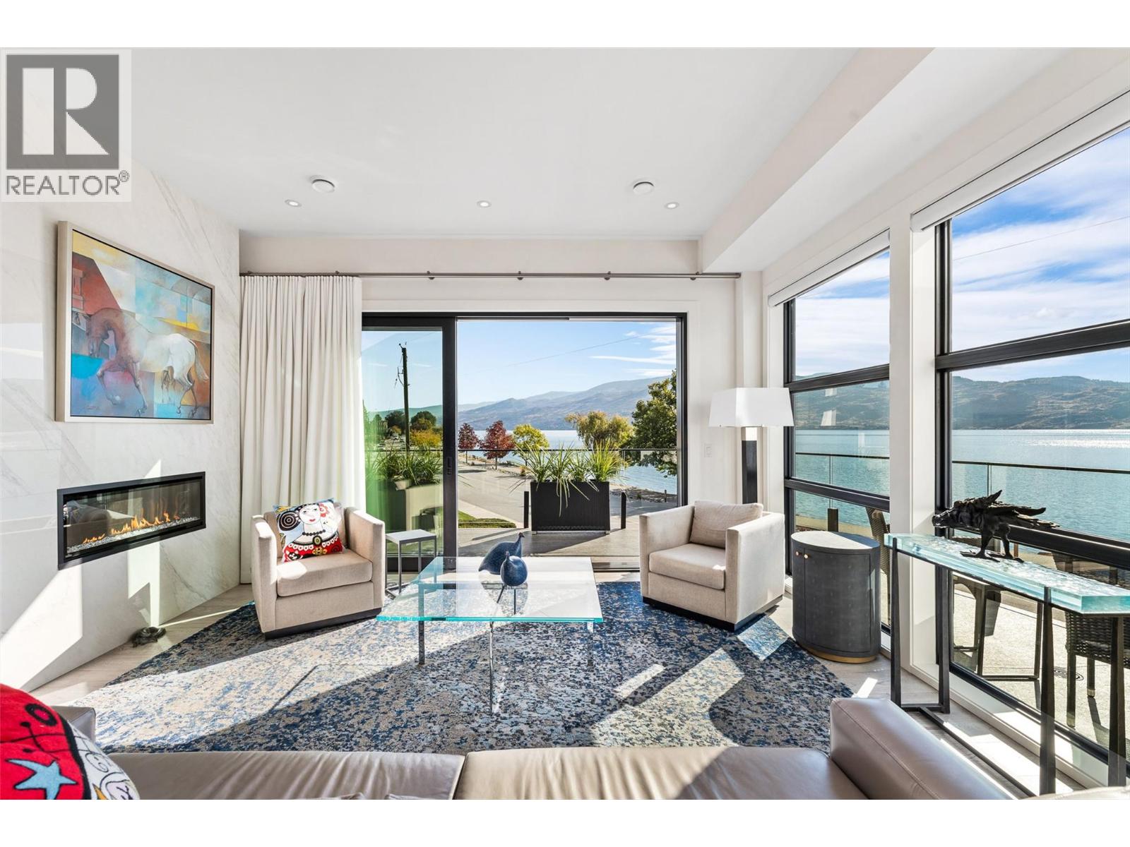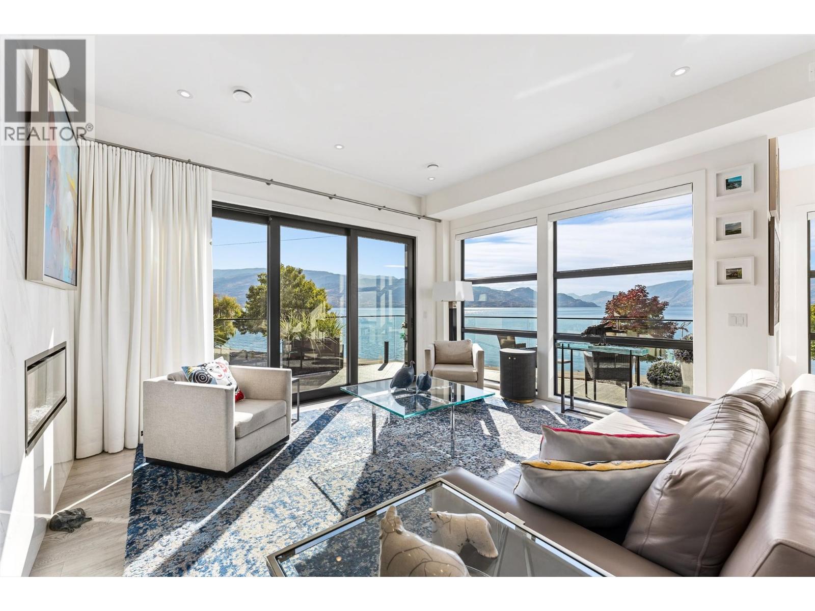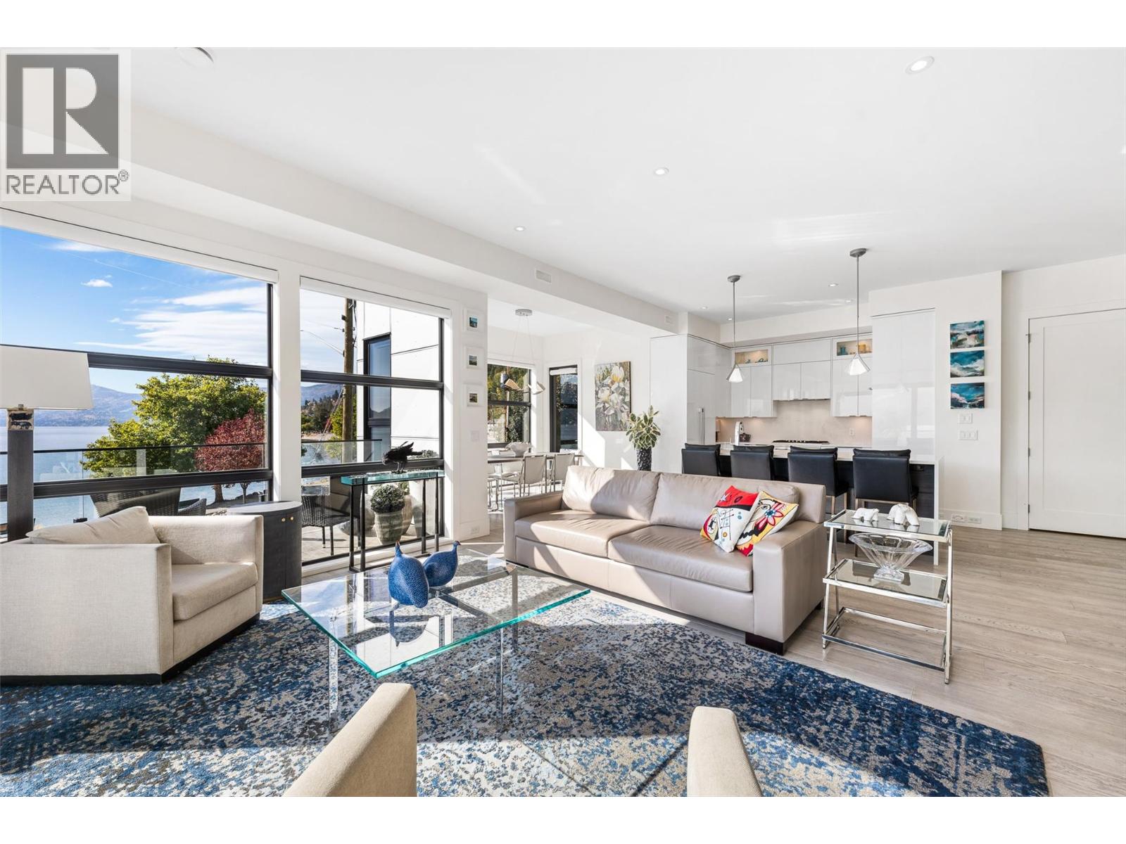 Set in the heart of Peachland’s vibrant waterfront, this architecturally striking residence by Lakepoint Homes offers refined design and a seamless connection to the Okanagan lifestyle. One of only seven exclusive homes, this end unit sits closest to the water, just steps from the beach, cafes and boutique shops along Beach Avenue. Soaring 10-ft ceilings and floor-to-ceiling Marvin windows flood the interior with natural light, while wide-plank white oak floors and a floating glass staircase add a sense of understated sophistication. The open-concept main level is ideal for entertaining, featuring a chef’s kitchen with Thermador appliances, quartz surfaces, and a statement island that flows into the dining and living areas, framed by panoramic lake and mountain views. Expansive sliding doors open to a wrap-around deck with glass railings, extending your living space outdoors. A private elevator connects all three levels, including the tranquil upper floor where the primary suite offers two walk-in closets, a spa-inspired ensuite, and access to two serene view decks. An additional bedroom with an adjacent bath, office, and laundry complete the layout. The double garage provides abundant storage, epoxy floors, and EV charging. With multiple, distinct outdoor living spaces and meticulous attention to detail throughout, this home embodies elevated lakeside living in one of Peachland’s most charming waterfront communities. (id:6770)