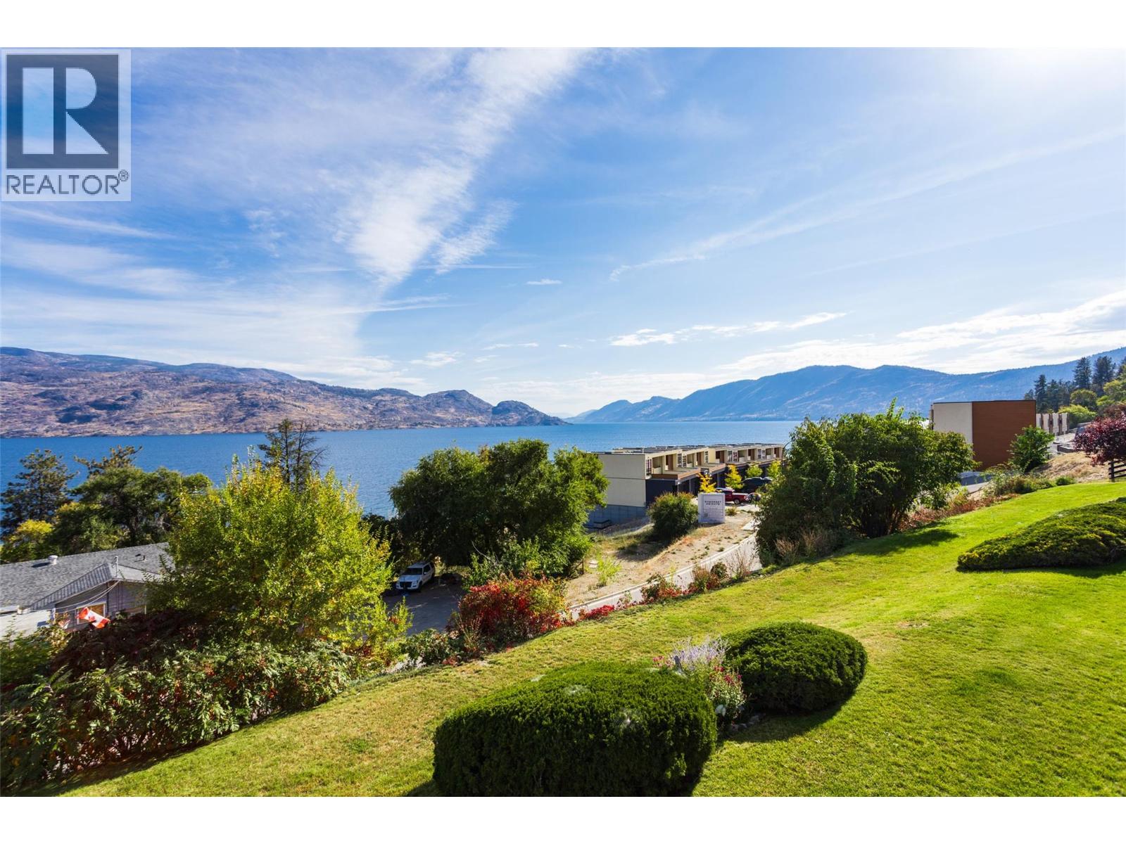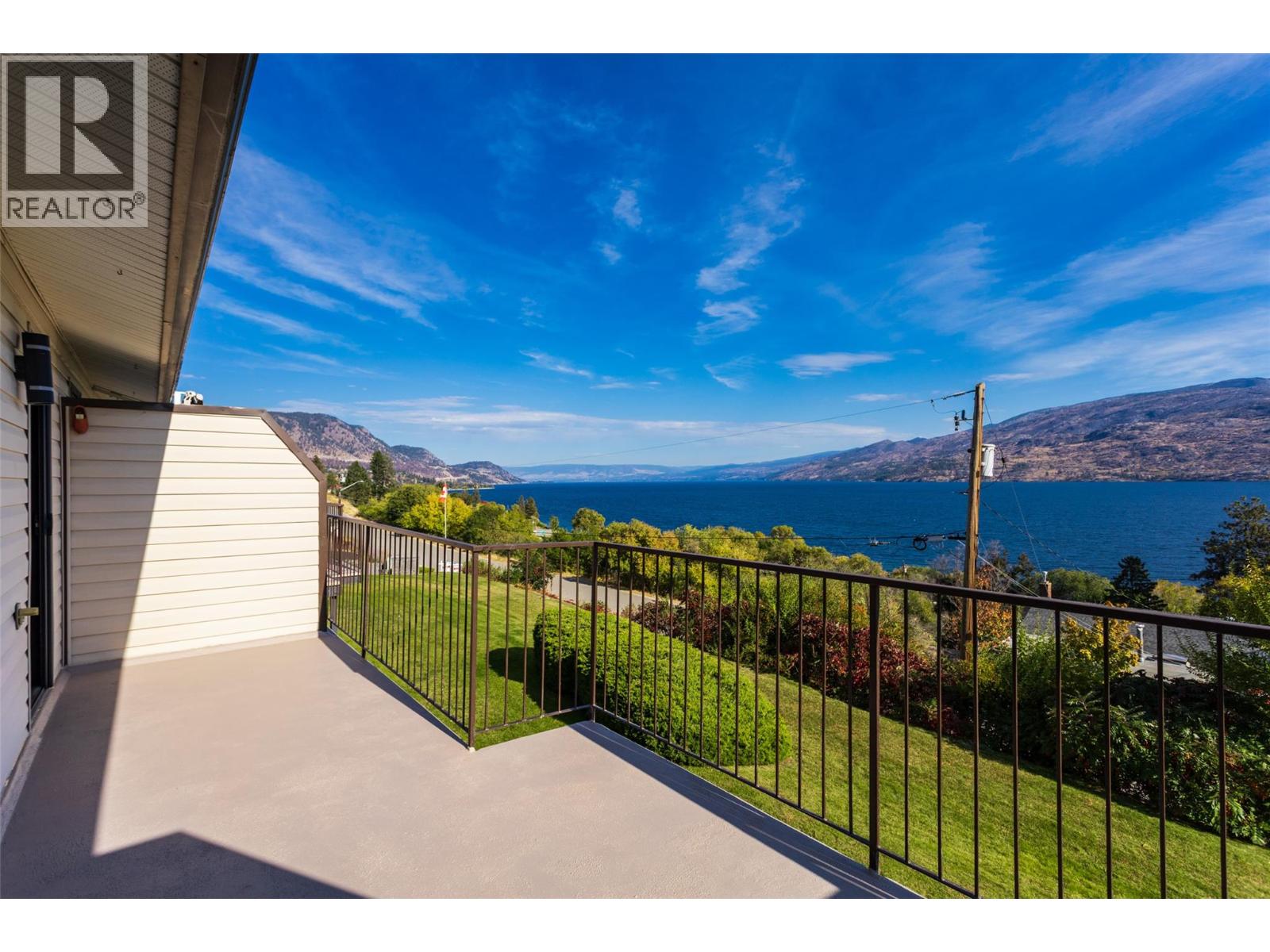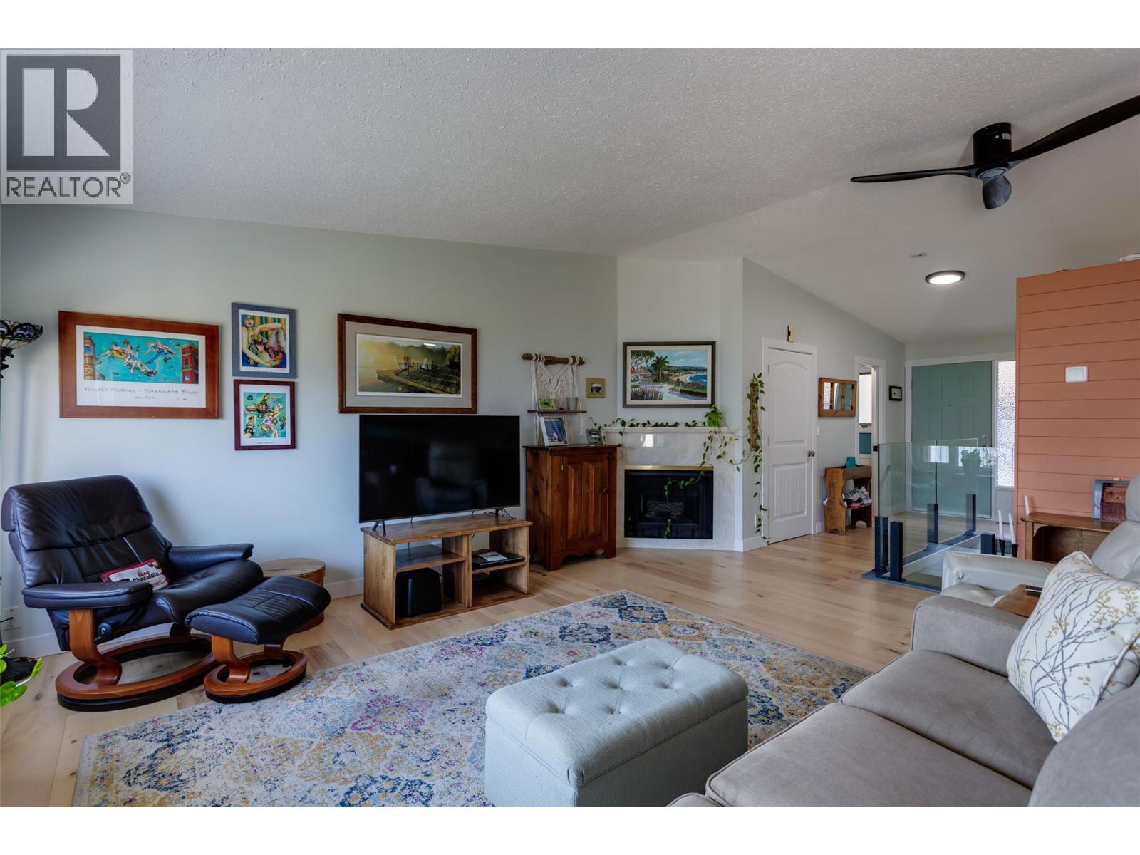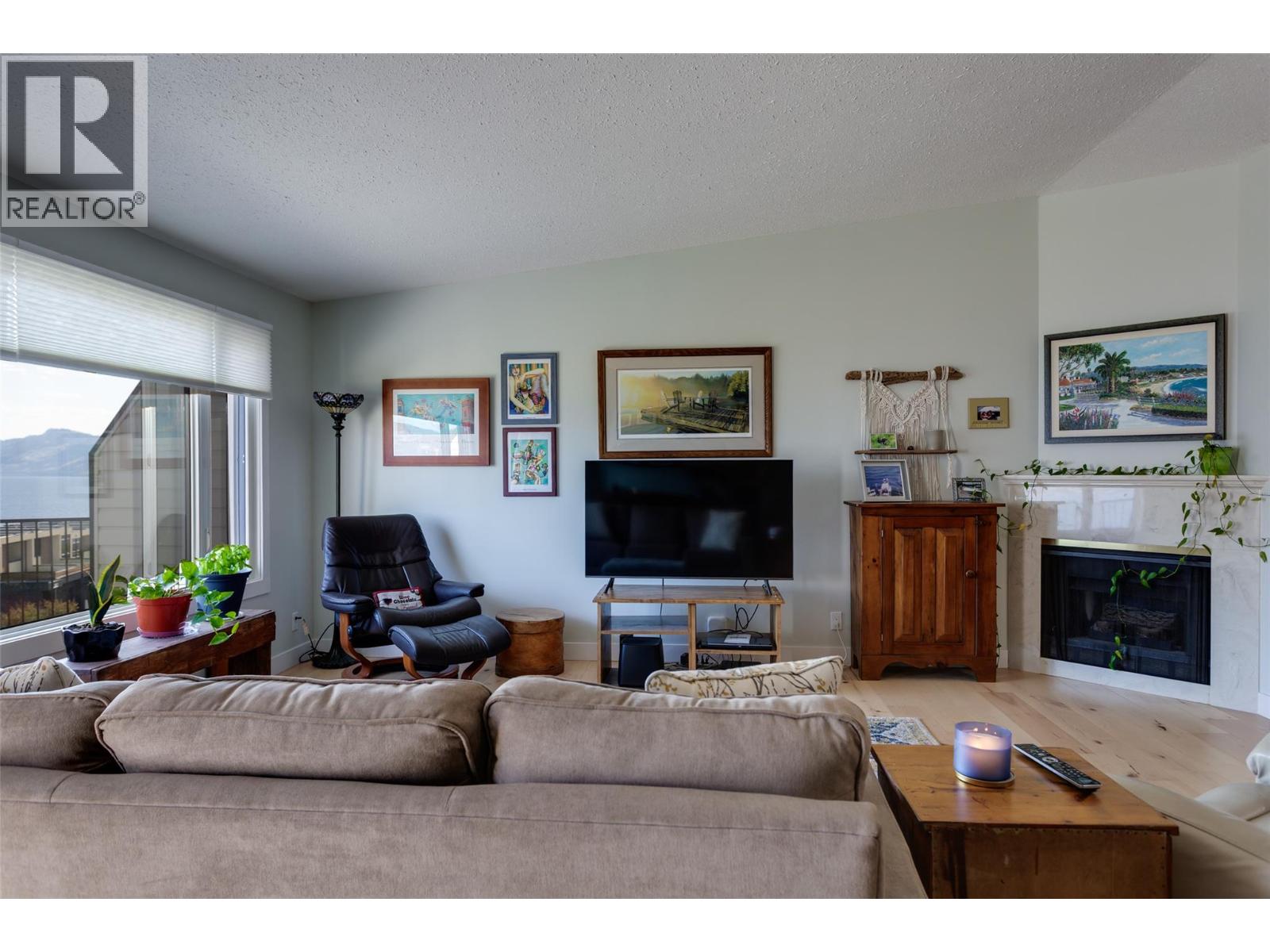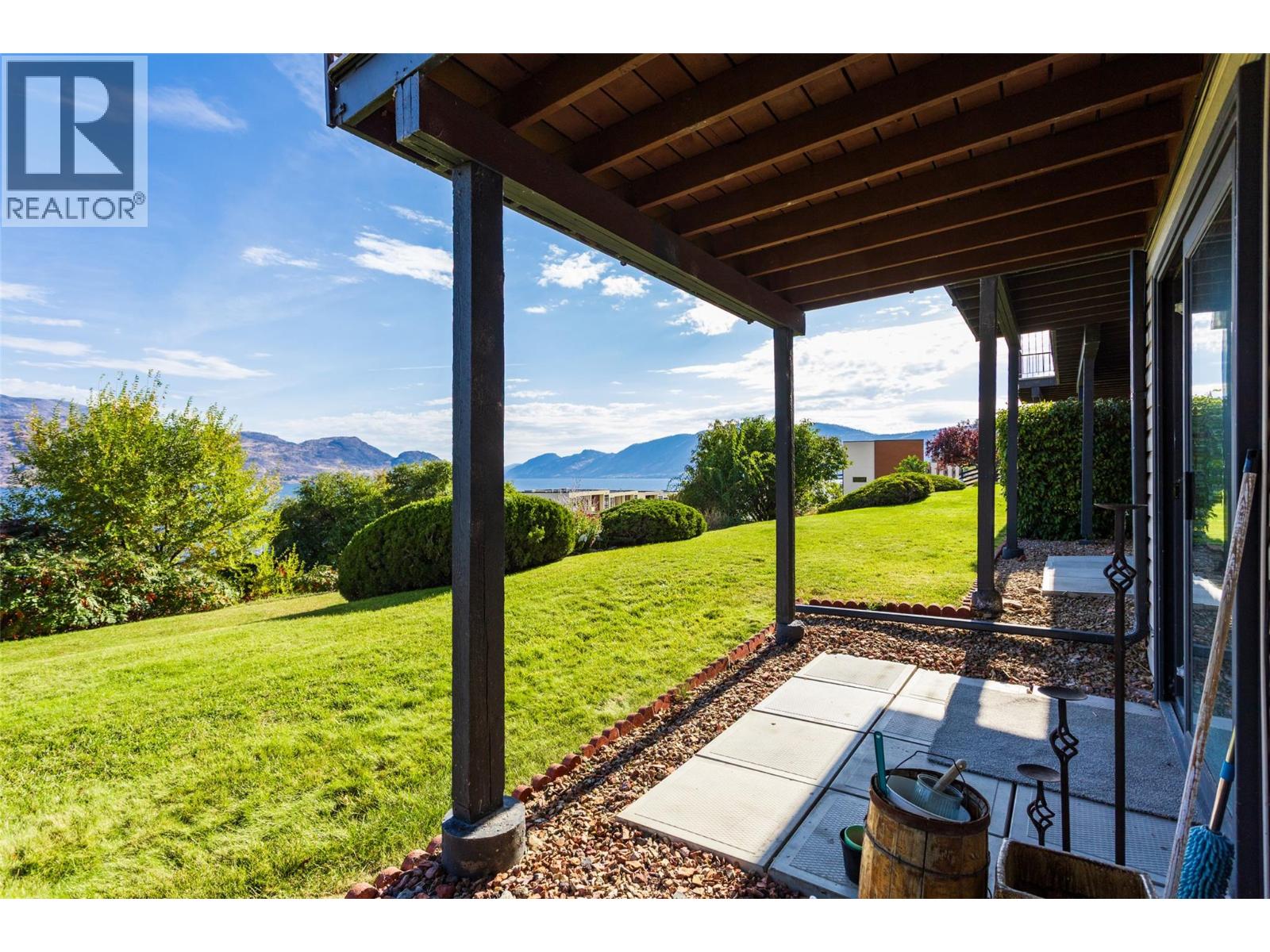 One of the best-priced Lakeview townhouses in Peachland. This walkout rancher features a 180-degree lake and mountain view from both balconies and the master bedroom. The home offers nearly 1,500 square feet of living space with 10-foot vaulted ceilings and a newly designed white kitchen, complete with a stylish backsplash and stainless steel appliances. A gas fireplace adds to the cozy ambiance. Additional updates include high-end flooring, updated bathrooms, new countertops, modern light fixtures, fresh paint, and some new windows with privacy blinds. The spacious master bedroom features a 16 x 7 walk-in closet, a 5-piece ensuite, and a decorative electric fireplace. The low strata fees of $320.00 per month include garbage and a covered carport with additional storage. Okanagan Ridge is a small, 55-plus strata development conveniently located near all amenities. Senior taxes are $1,113 and quick possession is available. This home also offers the potential to be easily renovated back to a two-bedroom layout. (id:6770)