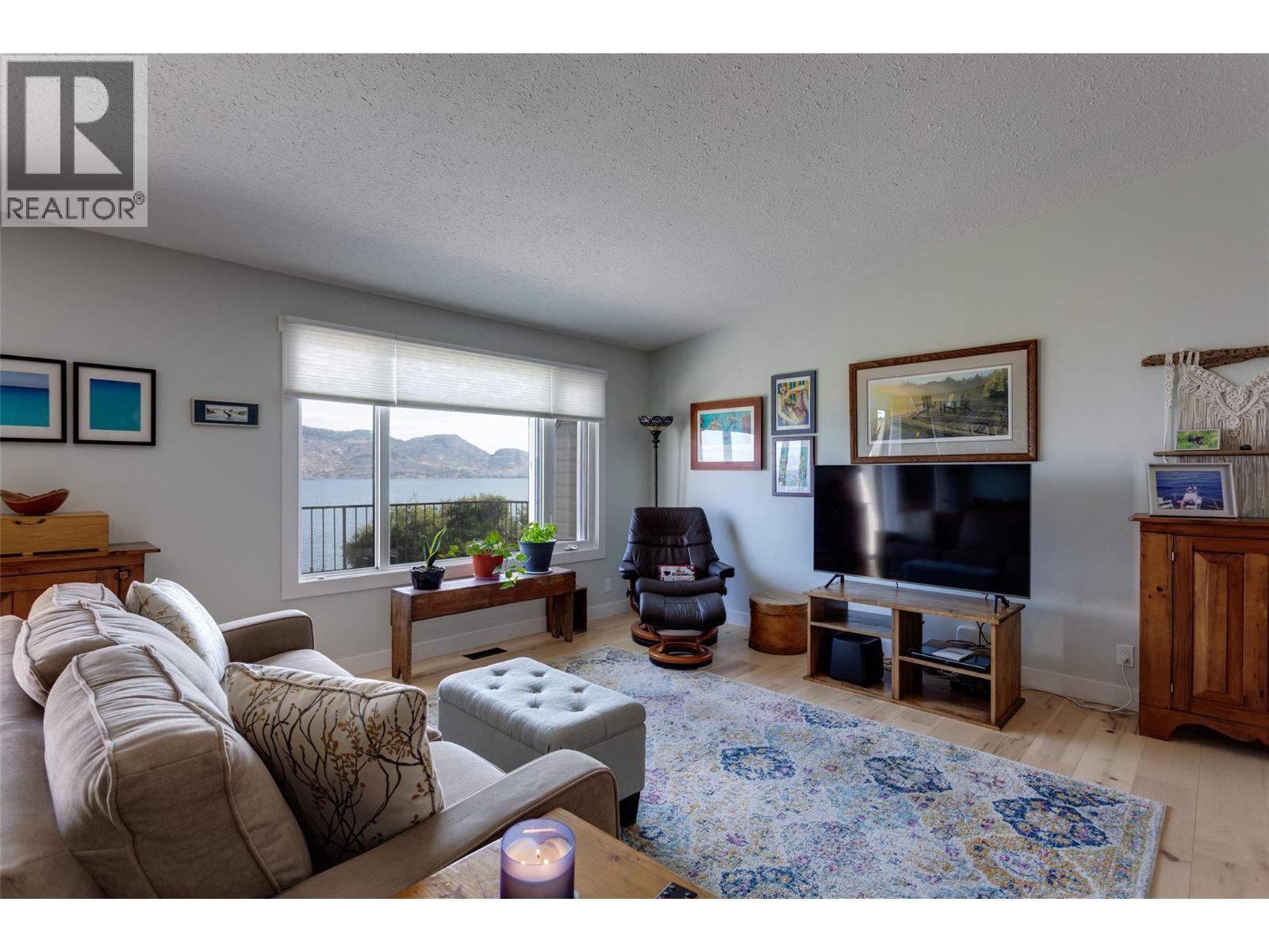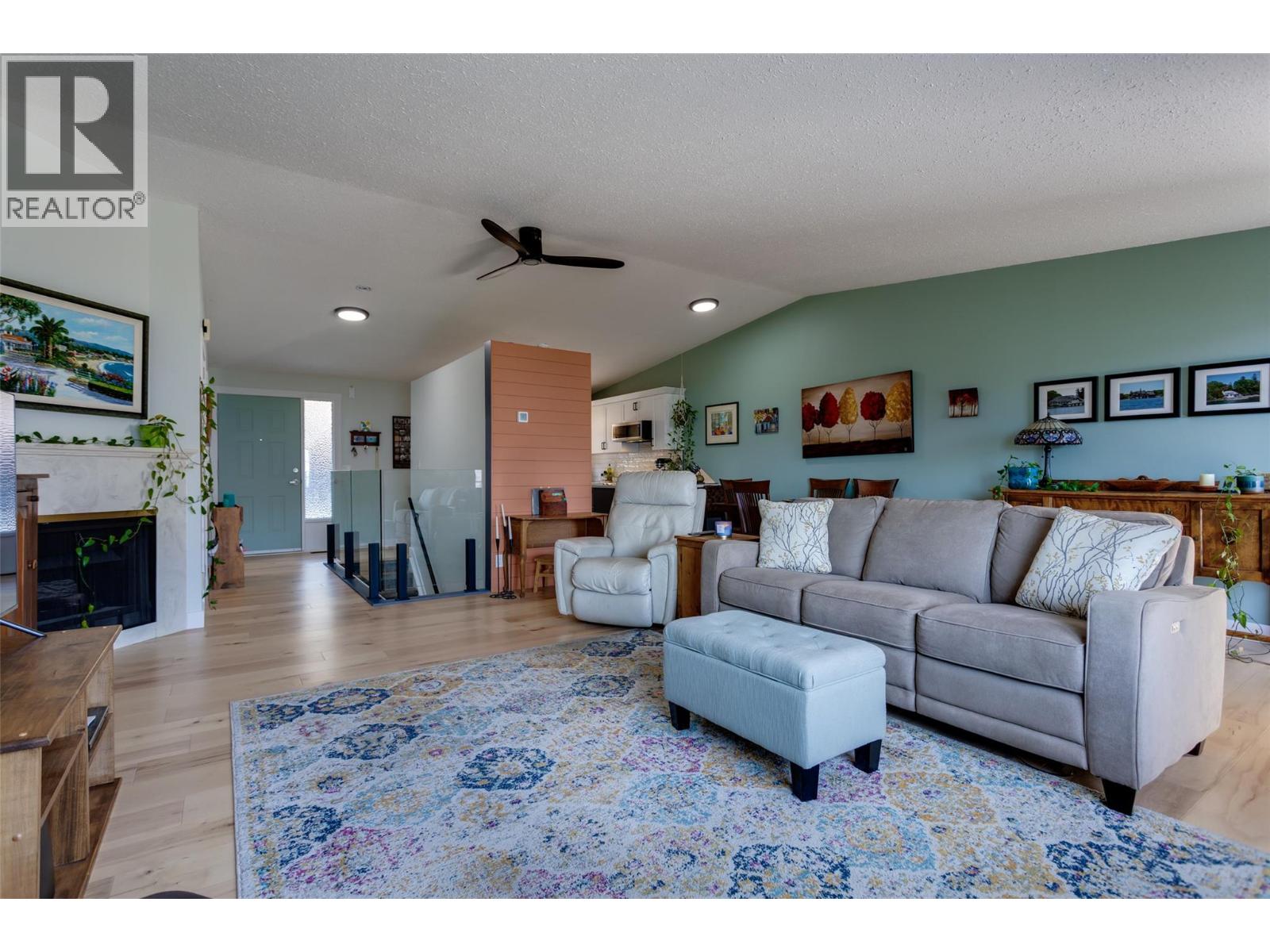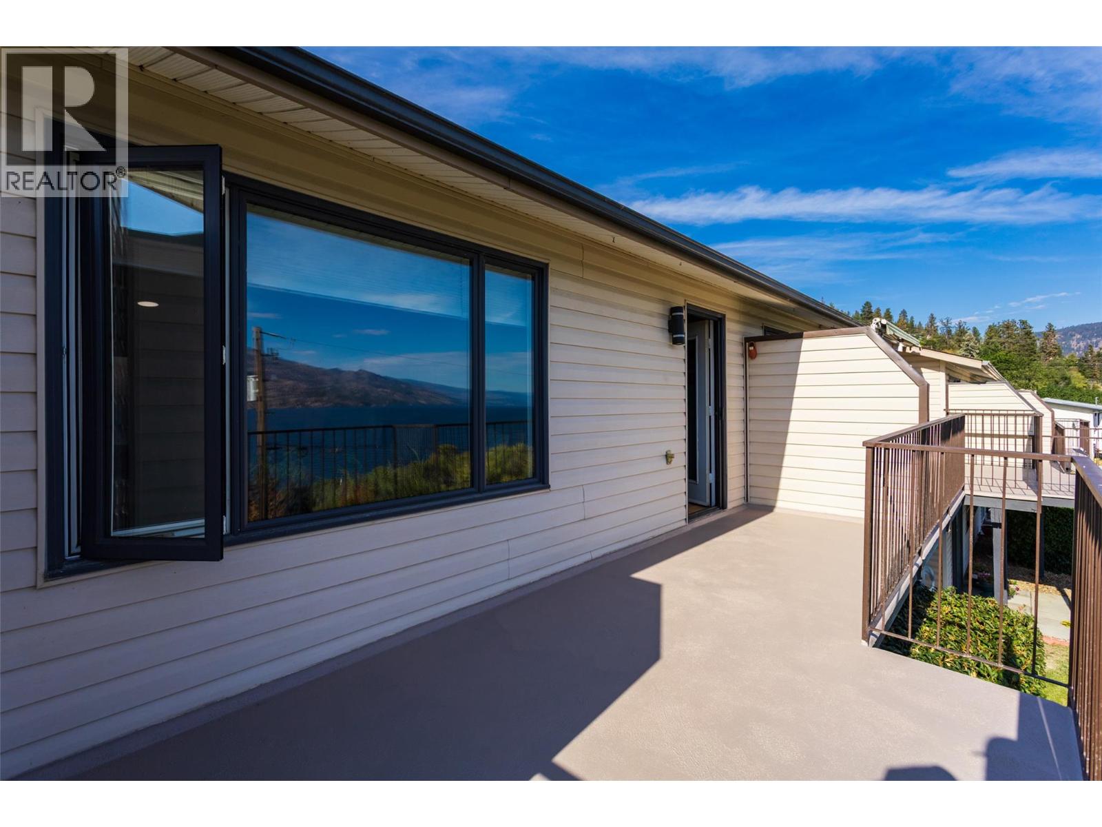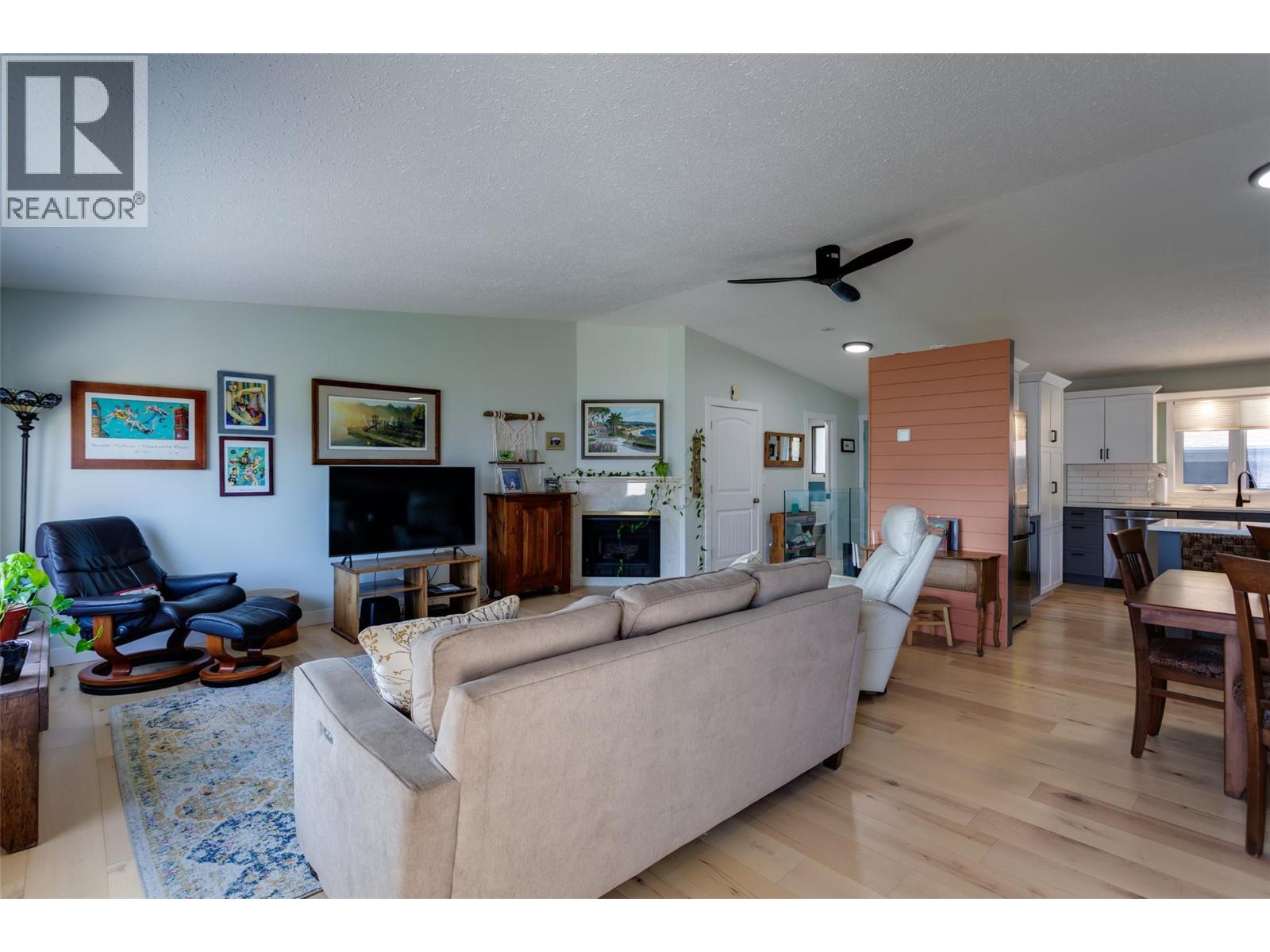 One of the best-priced Lakeview townhouses in Peachland. This walkout rancher features a 180-degree lake and mountain view from both balconies and the master bedroom. The home offers nearly 1,500 square feet of living space with 10-foot vaulted ceilings and a newly designed white kitchen, complete with a stylish backsplash and stainless steel appliances. A gas fireplace adds to the cozy ambiance. Additional updates include high-end flooring, updated bathrooms, new countertops, modern light fixtures, fresh paint, and some new windows with privacy blinds. The spacious master bedroom features a 16 x 7 walk-in closet, a 5-piece ensuite, and a decorative electric fireplace. The low strata fees of $320.00 per month include garbage and a covered carport with additional storage. Okanagan Ridge is a small, 55-plus strata development conveniently located near all amenities. Senior taxes are $1,113 and quick possession is available. This home also offers the potential to be easily renovated back to a two-bedroom layout. (id:6770)