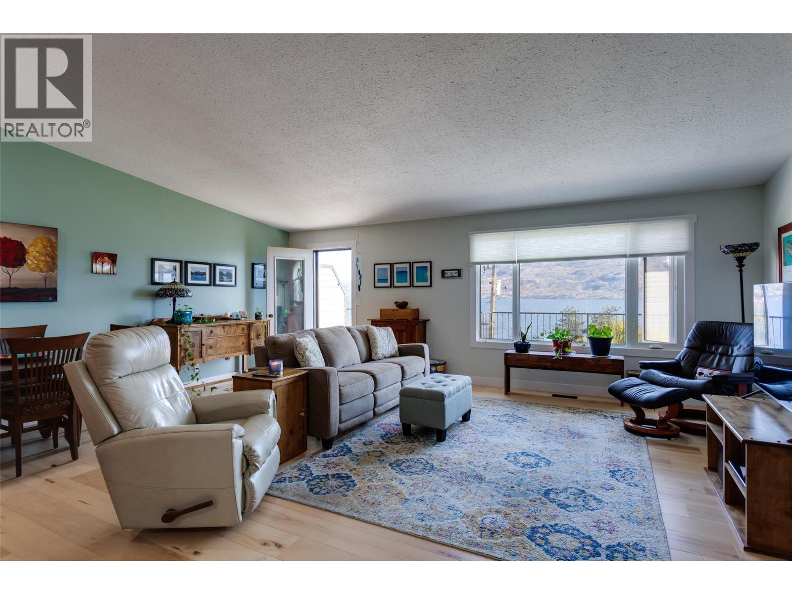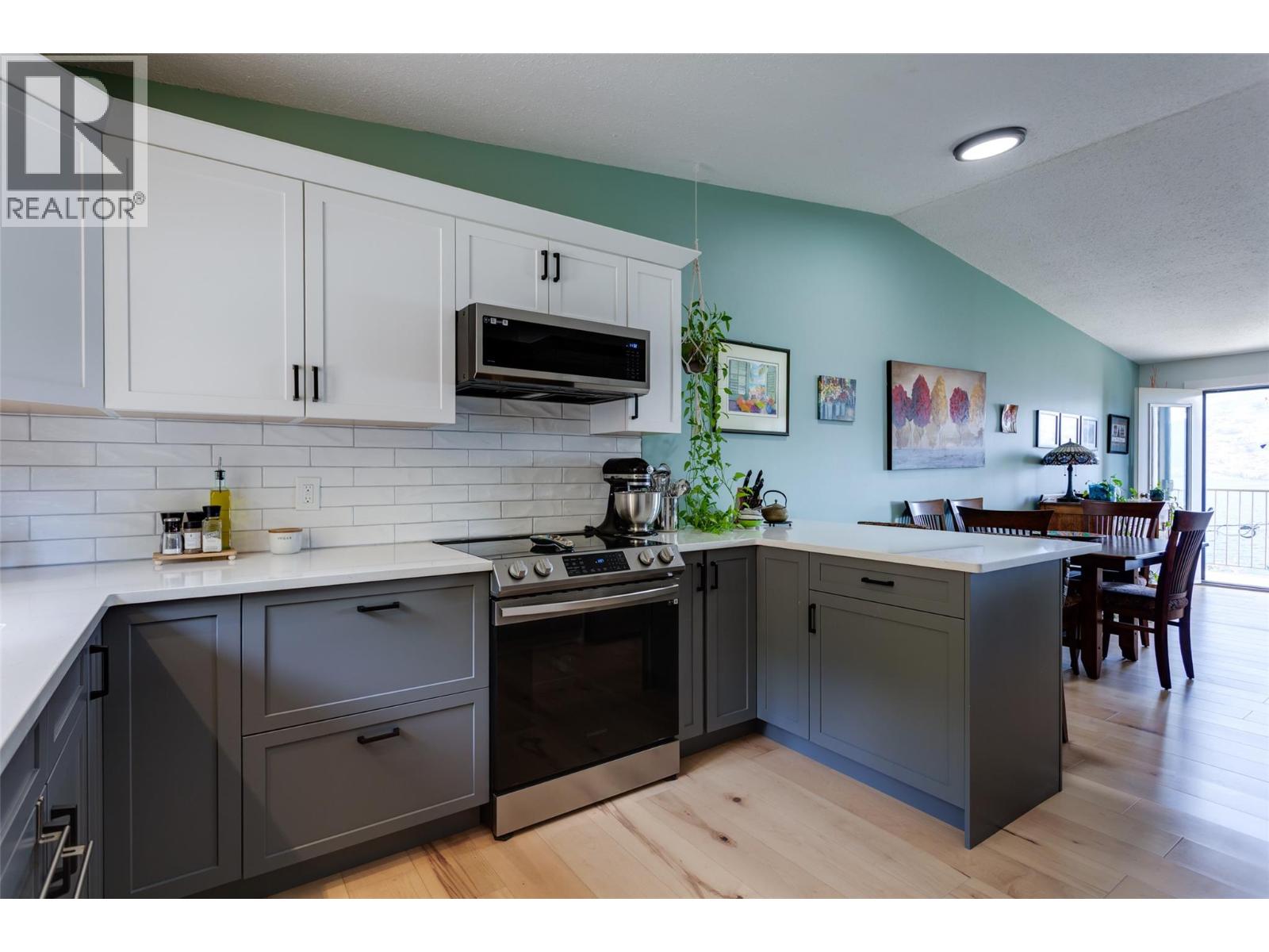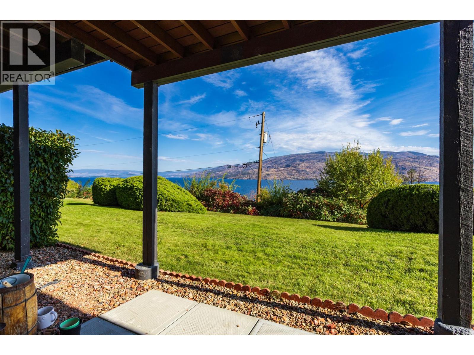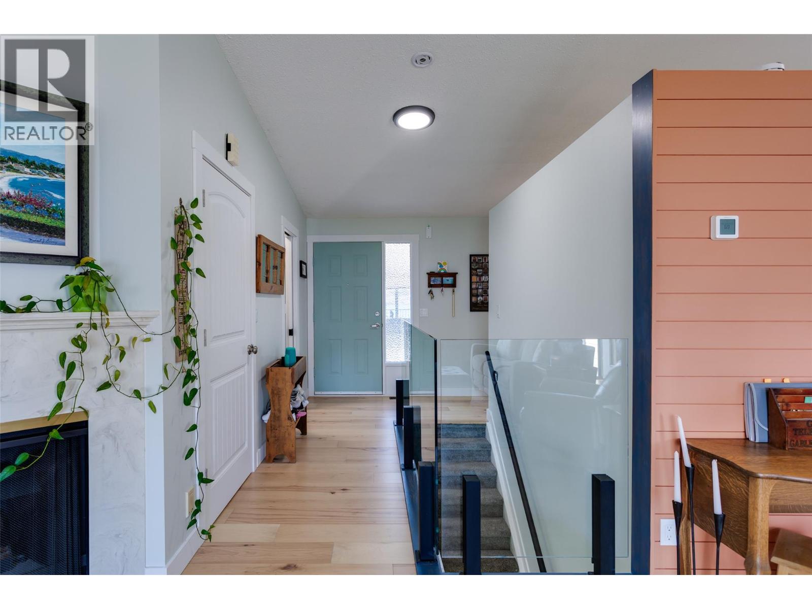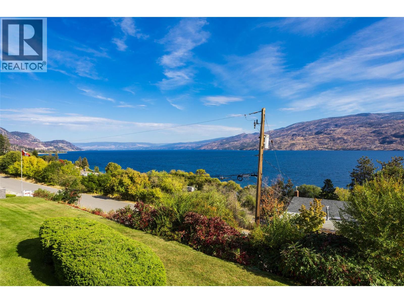 One of the best-priced Lakeview townhouses in Peachland. This walkout rancher features a 180-degree lake and mountain view from both balconies and the master bedroom. The home offers nearly 1,500 square feet of living space with 10-foot vaulted ceilings and a newly designed white kitchen, complete with a stylish backsplash and stainless steel appliances. A gas fireplace adds to the cozy ambiance. Additional updates include high-end flooring, updated bathrooms, new countertops, modern light fixtures, fresh paint, and some new windows with privacy blinds. The spacious master bedroom features a 16 x 7 walk-in closet, a 5-piece ensuite, and a decorative electric fireplace. The low strata fees of $320.00 per month include garbage and a covered carport with additional storage. Okanagan Ridge is a small, 55-plus strata development conveniently located near all amenities. Senior taxes are $1,113 and quick possession is available. This home also offers the potential to be easily renovated back to a two-bedroom layout. (id:6770)