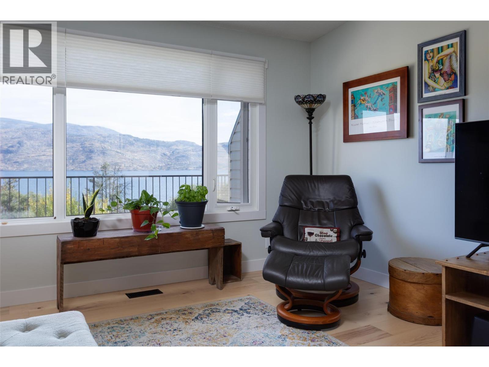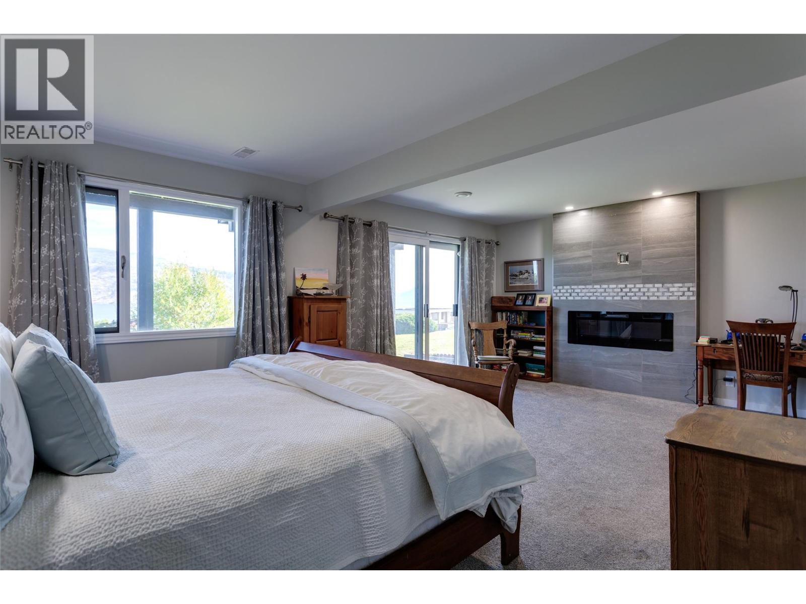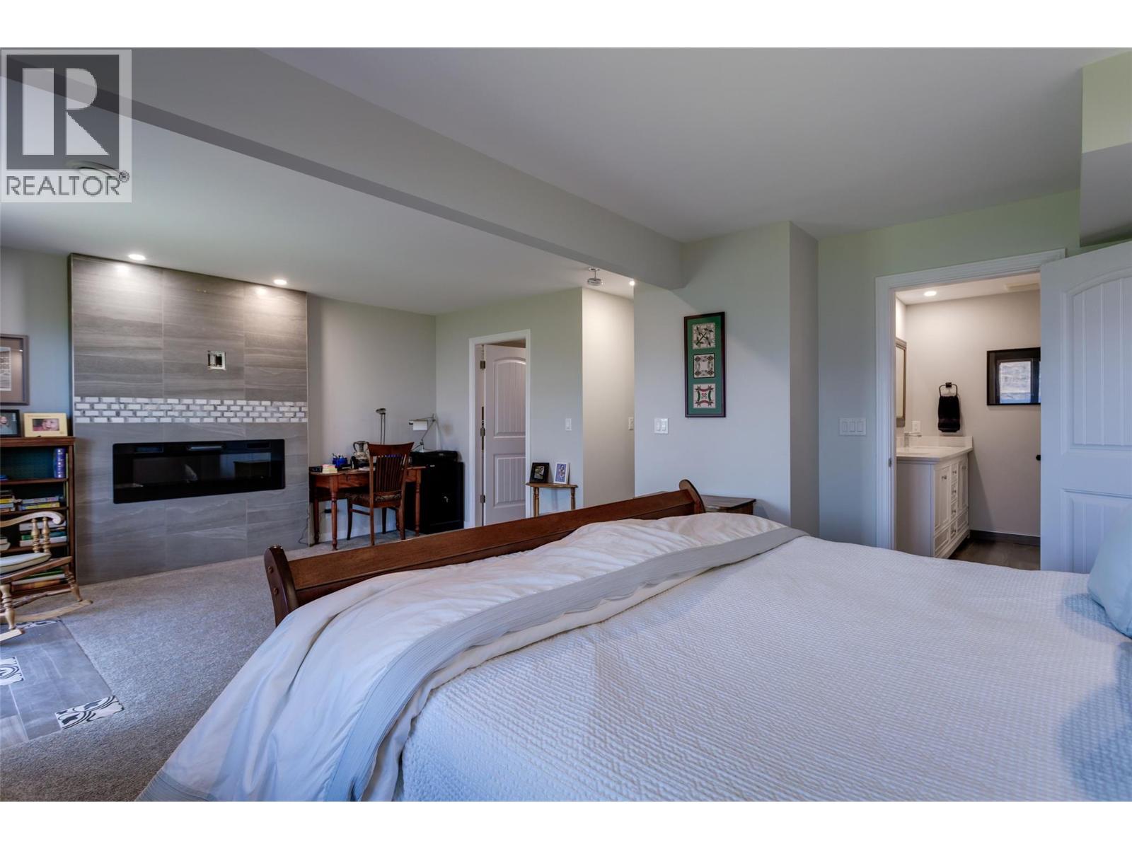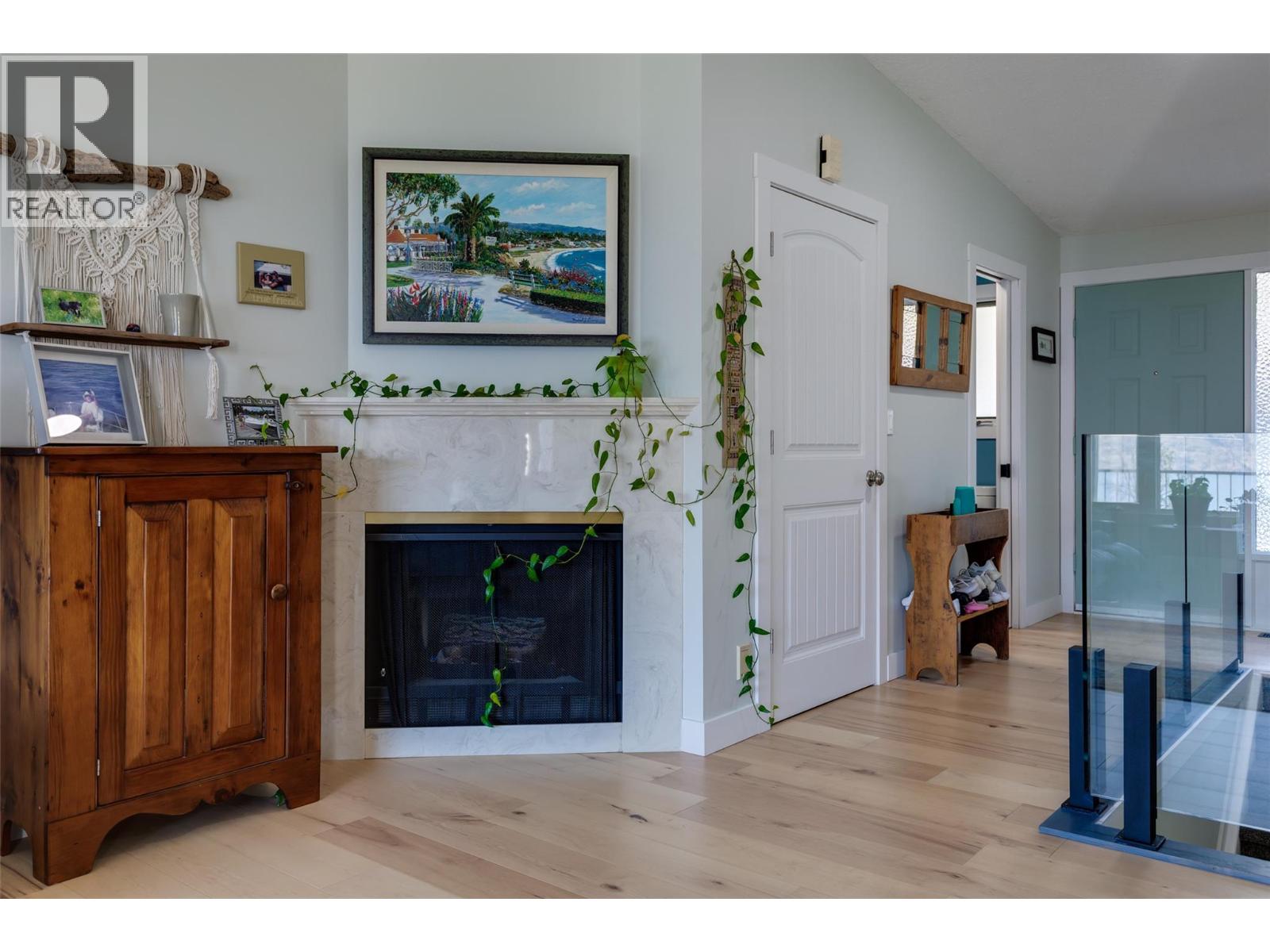 One of the best-priced Lakeview townhouses in Peachland. This walkout rancher features a 180-degree lake and mountain view from both balconies and the master bedroom. The home offers nearly 1,500 square feet of living space with 10-foot vaulted ceilings and a newly designed white kitchen, complete with a stylish backsplash and stainless steel appliances. A gas fireplace adds to the cozy ambiance. Additional updates include high-end flooring, updated bathrooms, new countertops, modern light fixtures, fresh paint, and some new windows with privacy blinds. The spacious master bedroom features a 16 x 7 walk-in closet, a 5-piece ensuite, and a decorative electric fireplace. The low strata fees of $320.00 per month include garbage and a covered carport with additional storage. Okanagan Ridge is a small, 55-plus strata development conveniently located near all amenities. Senior taxes are $1,113 and quick possession is available. This home also offers the potential to be easily renovated back to a two-bedroom layout. (id:6770)