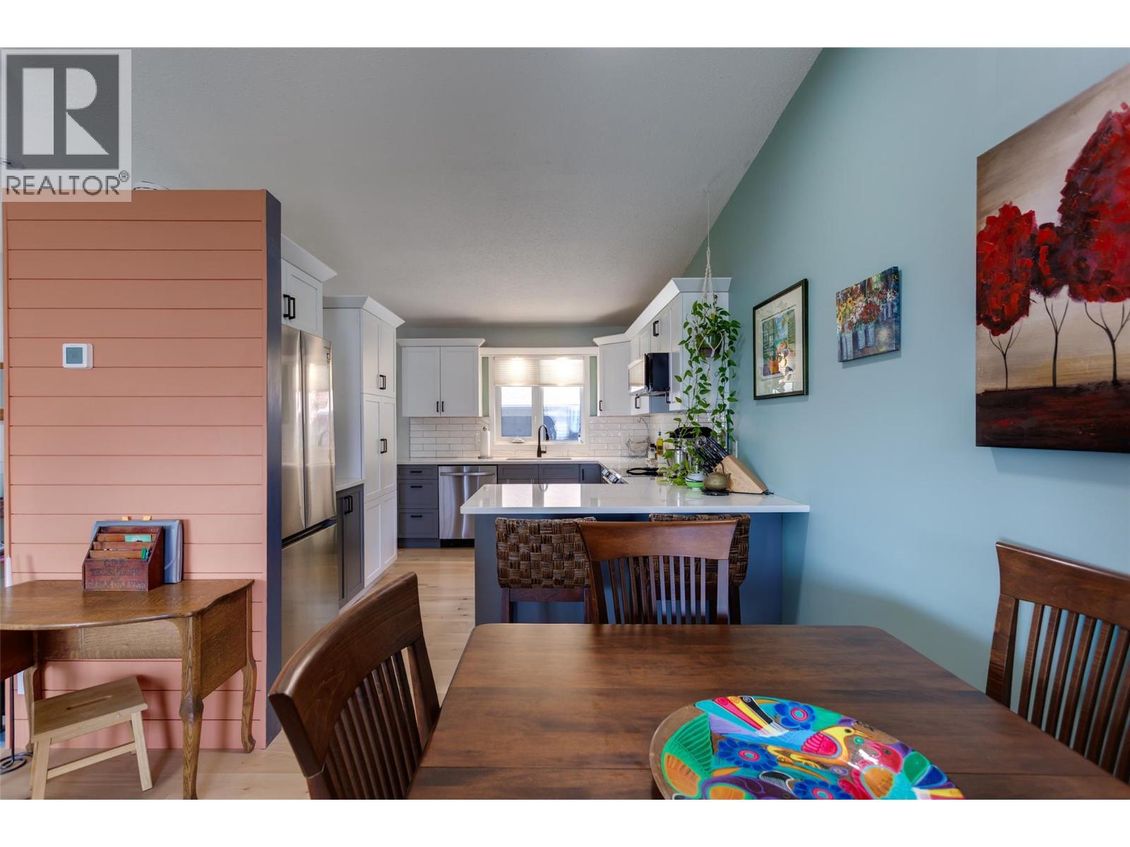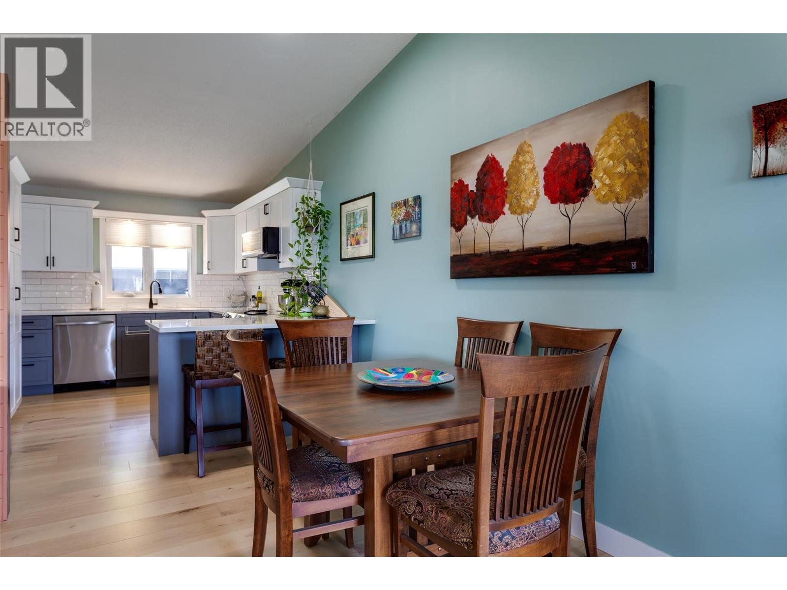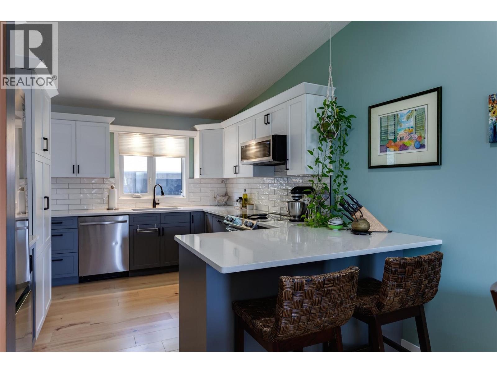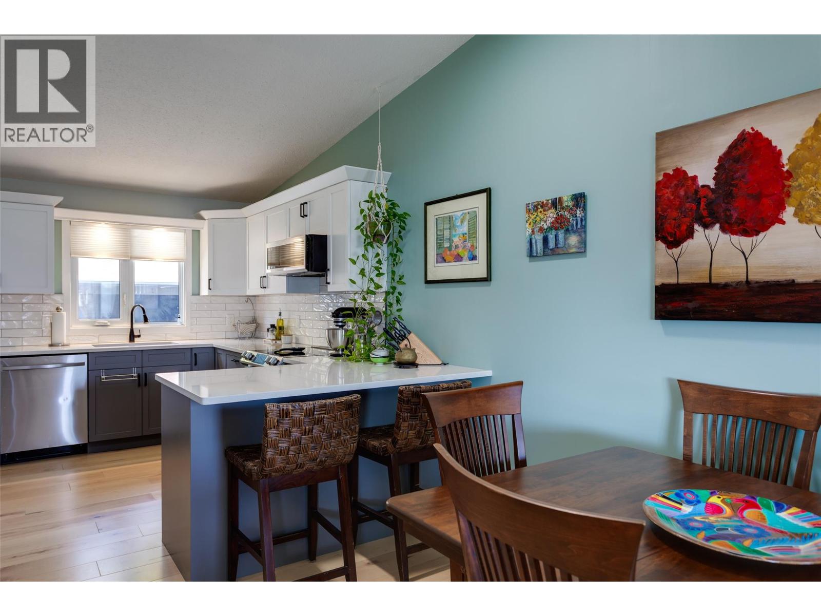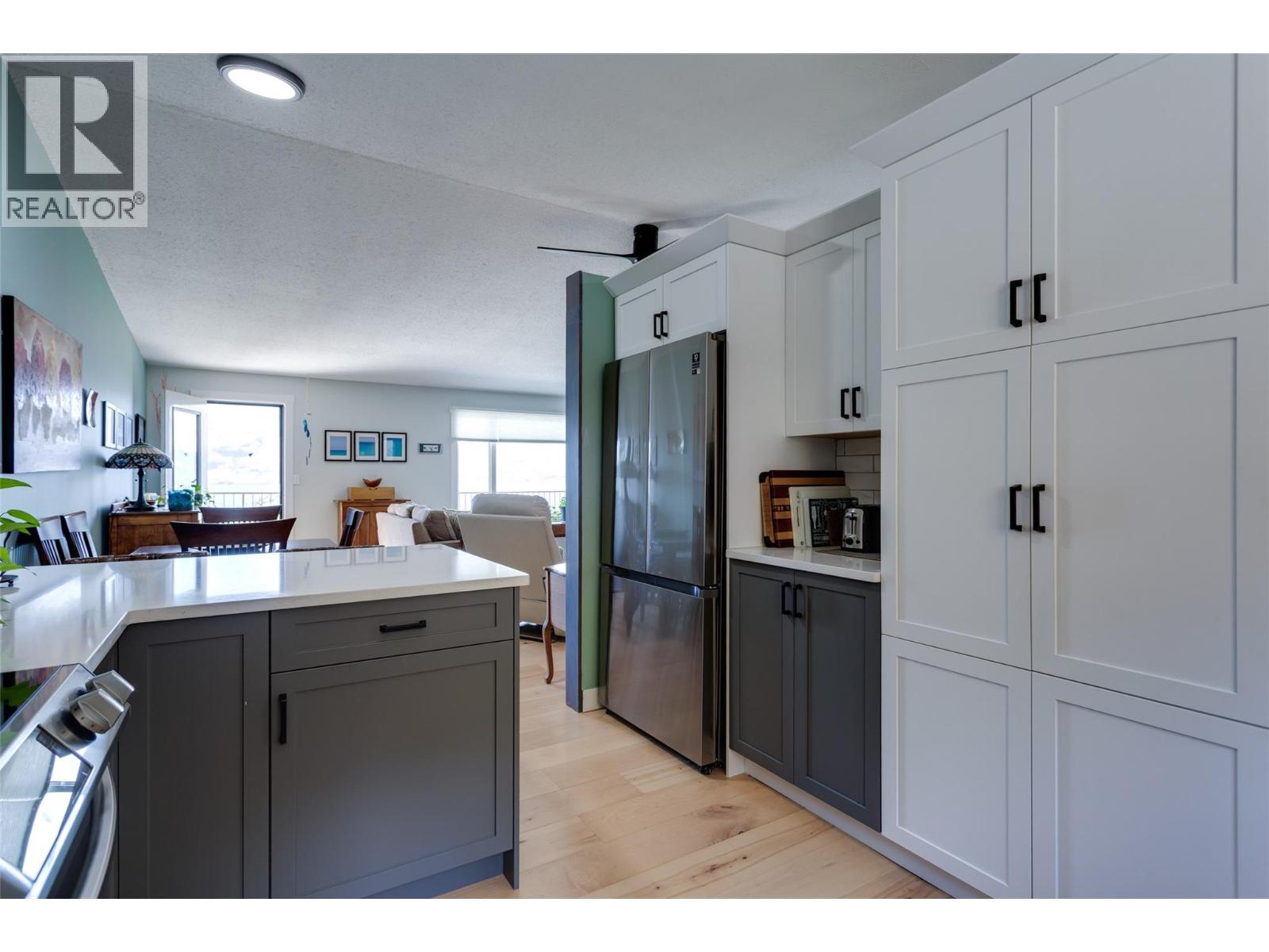 One of the best-priced Lakeview townhouses in Peachland. This walkout rancher features a 180-degree lake and mountain view from both balconies and the master bedroom. The home offers nearly 1,500 square feet of living space with 10-foot vaulted ceilings and a newly designed white kitchen, complete with a stylish backsplash and stainless steel appliances. A gas fireplace adds to the cozy ambiance. Additional updates include high-end flooring, updated bathrooms, new countertops, modern light fixtures, fresh paint, and some new windows with privacy blinds. The spacious master bedroom features a 16 x 7 walk-in closet, a 5-piece ensuite, and a decorative electric fireplace. The low strata fees of $320.00 per month include garbage and a covered carport with additional storage. Okanagan Ridge is a small, 55-plus strata development conveniently located near all amenities. Senior taxes are $1,113 and quick possession is available. This home also offers the potential to be easily renovated back to a two-bedroom layout. (id:6770)