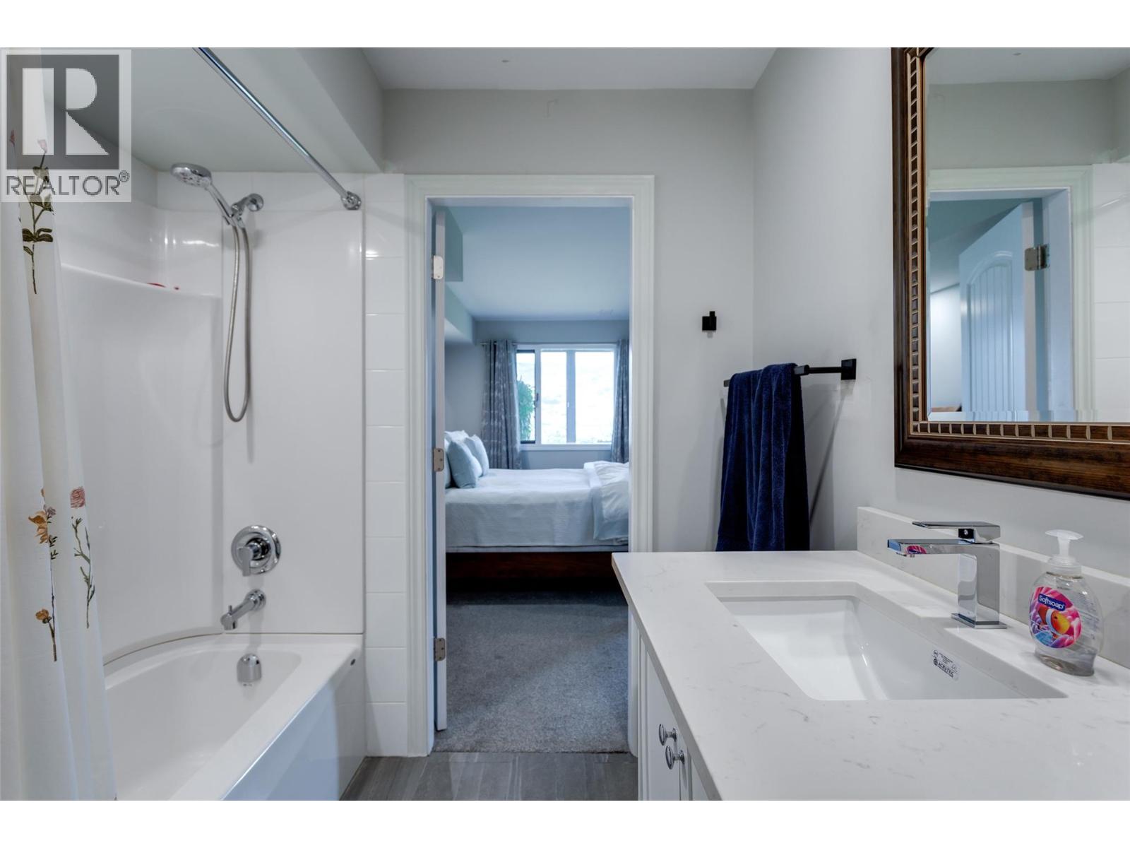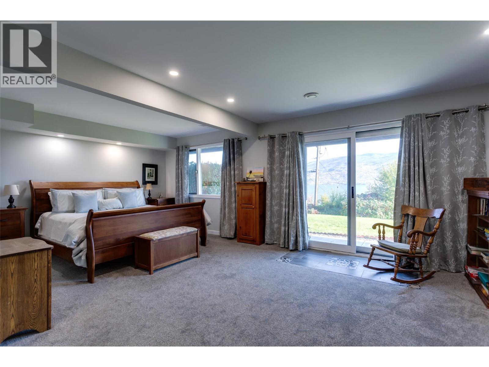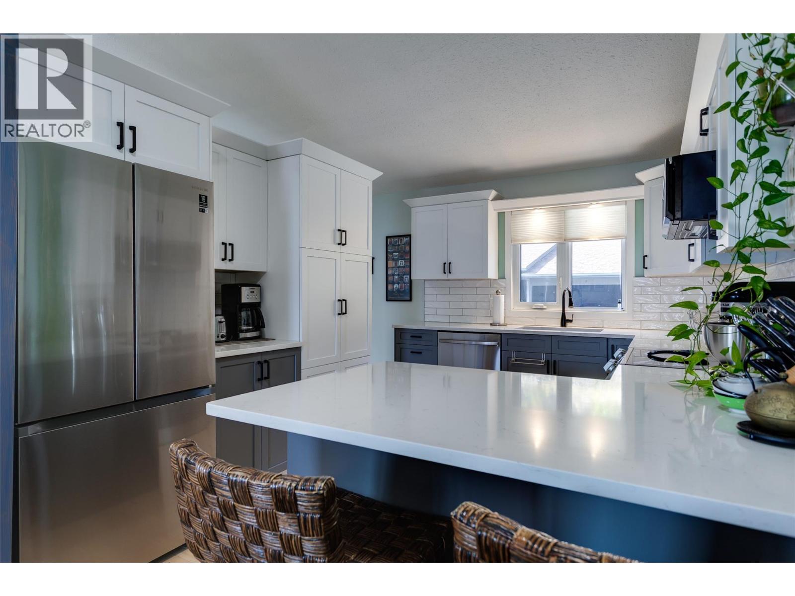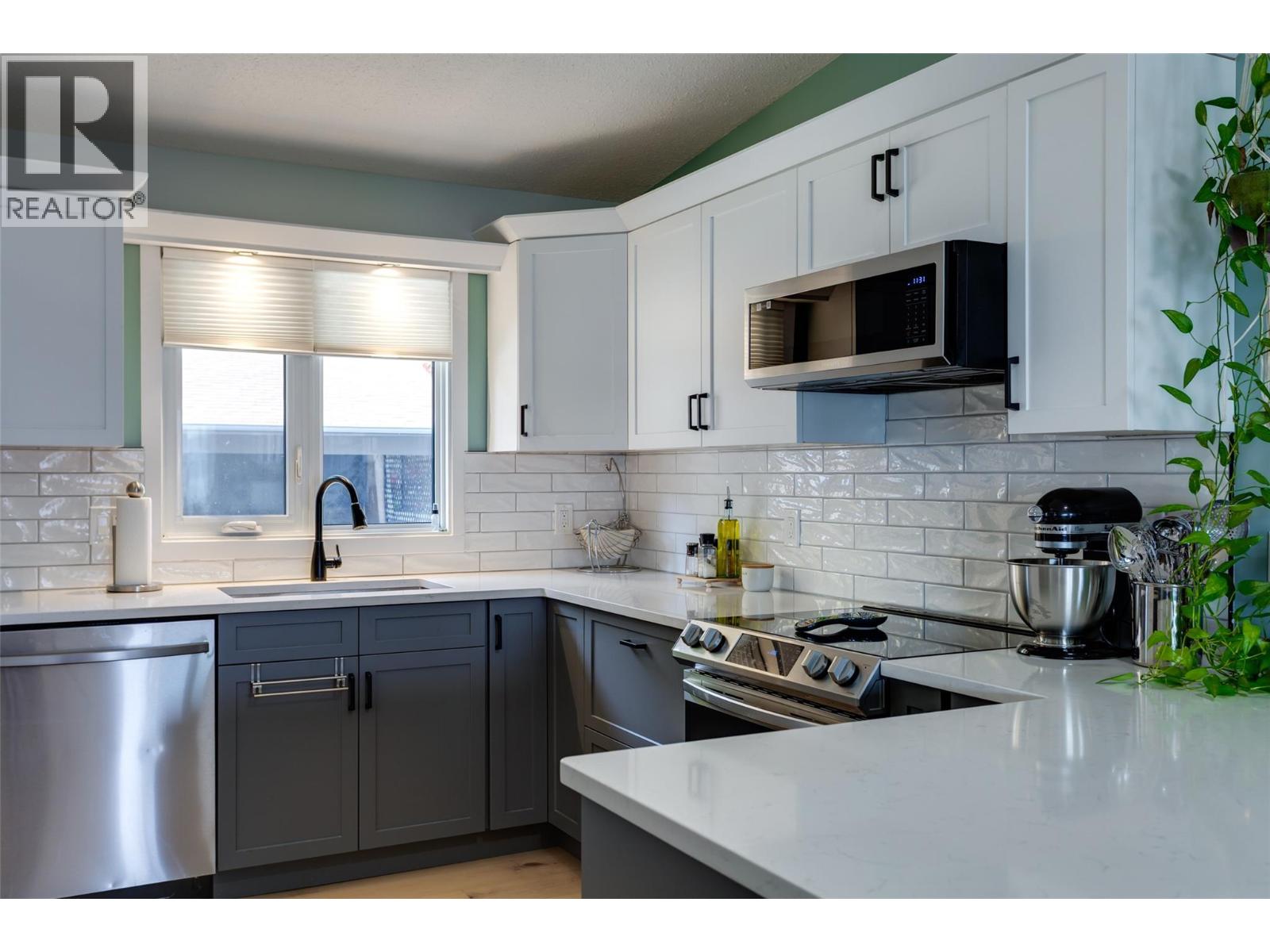 One of the best-priced Lakeview townhouses in Peachland. This walkout rancher features a 180-degree lake and mountain view from both balconies and the master bedroom. The home offers nearly 1,500 square feet of living space with 10-foot vaulted ceilings and a newly designed white kitchen, complete with a stylish backsplash and stainless steel appliances. A gas fireplace adds to the cozy ambiance. Additional updates include high-end flooring, updated bathrooms, new countertops, modern light fixtures, fresh paint, and some new windows with privacy blinds. The spacious master bedroom features a 16 x 7 walk-in closet, a 5-piece ensuite, and a decorative electric fireplace. The low strata fees of $320.00 per month include garbage and a covered carport with additional storage. Okanagan Ridge is a small, 55-plus strata development conveniently located near all amenities. Senior taxes are $1,113 and quick possession is available. This home also offers the potential to be easily renovated back to a two-bedroom layout. (id:6770)