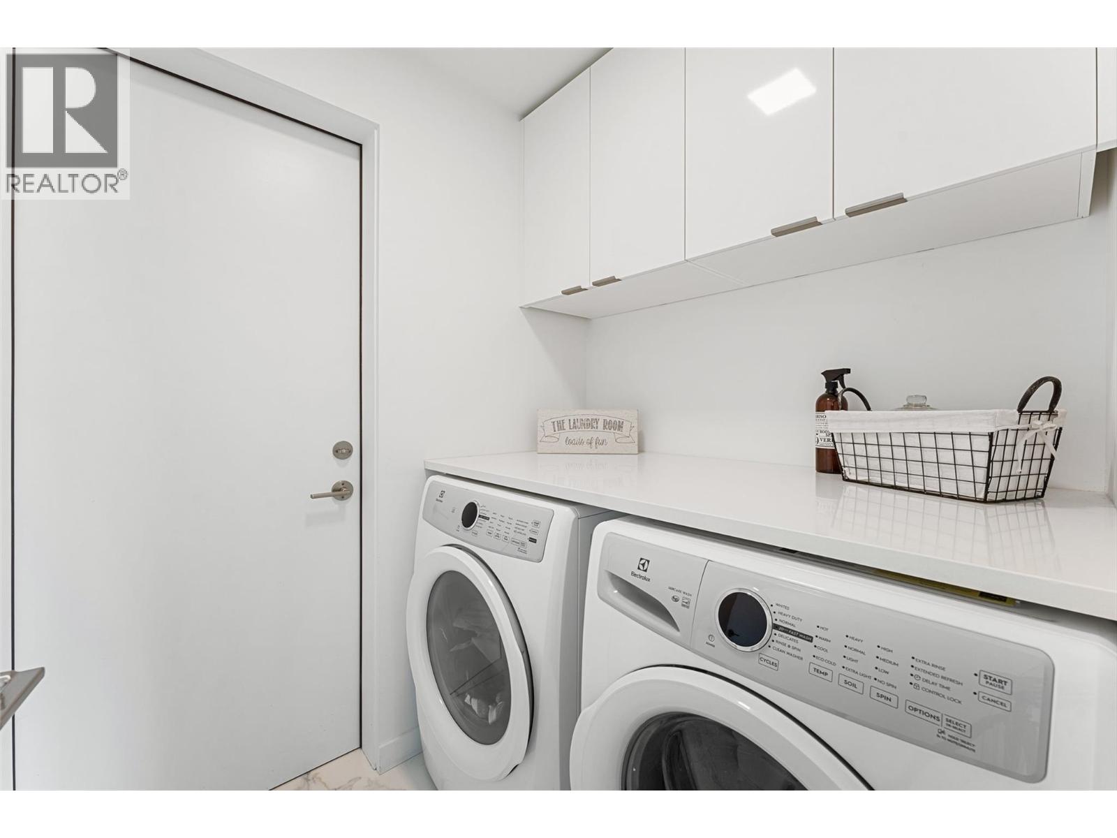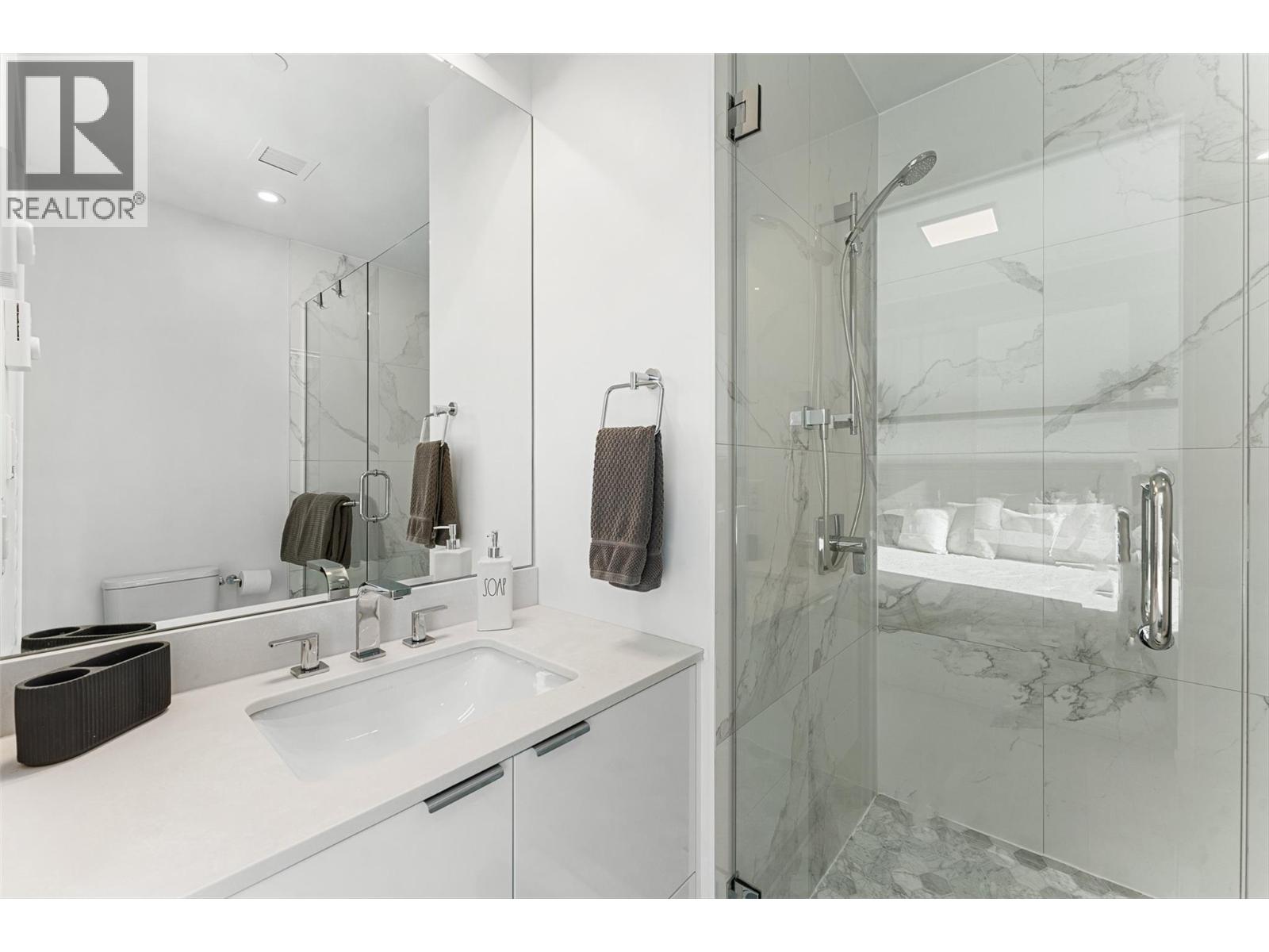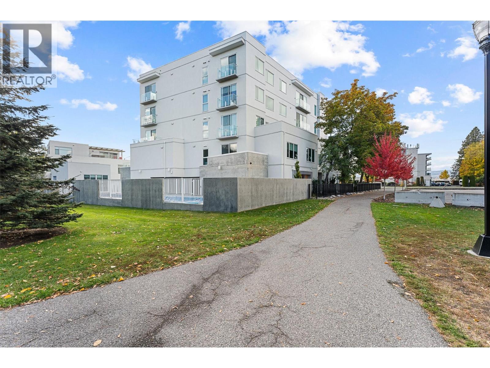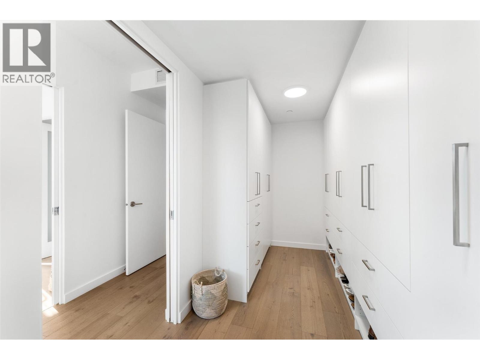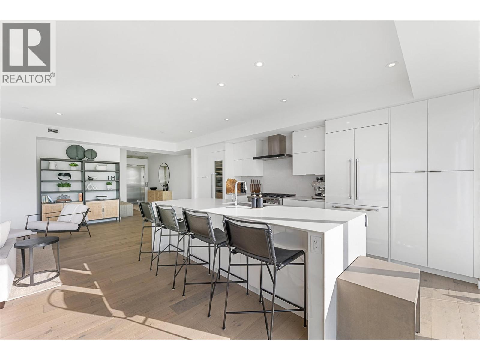 Experience elevated living in this contemporary residence with expansive, breathtaking views of Okanagan Lake and the surrounding mountains. Walls of glass frame the scenery throughout the open-concept main living area, where 10 ft. ceilings, wide-plank hardwood, and aseamless flow creating a bright and inviting space. The kitchen features sleek white soft-close cabinetry, a waterfall edge island, and premium Fisher & Paykel appliances including a six-burner gas range, paneled fridge/freezer, and wine fridge. The living and dining areas open to a covered lakeview patio with glass railings, a gas line for BBQ, and power sunshades—perfect for entertaining or quiet mornings overlooking the sparkling blue waters of Okanagan Lake. The primary retreat features a walk-in closet with custom built-ins, a Juliet balcony, and a spa-inspired ensuite with heated floors, a freestanding tub, and a fully tiled glass shower. Two additional bedrooms, each with their own ensuite, provide comfort and privacy for family or guests. Every detail has been thoughtfully designed, from the power blinds in every room to the direct elevator access and heated double garage with EV charging. Located in a boutique building backing onto a park, and just steps to the shores of Okanagan Lake, this home captures the best of Kelowna’s modern lakeside lifestyle—effortless, refined, and surrounded by nature. (id:6770)