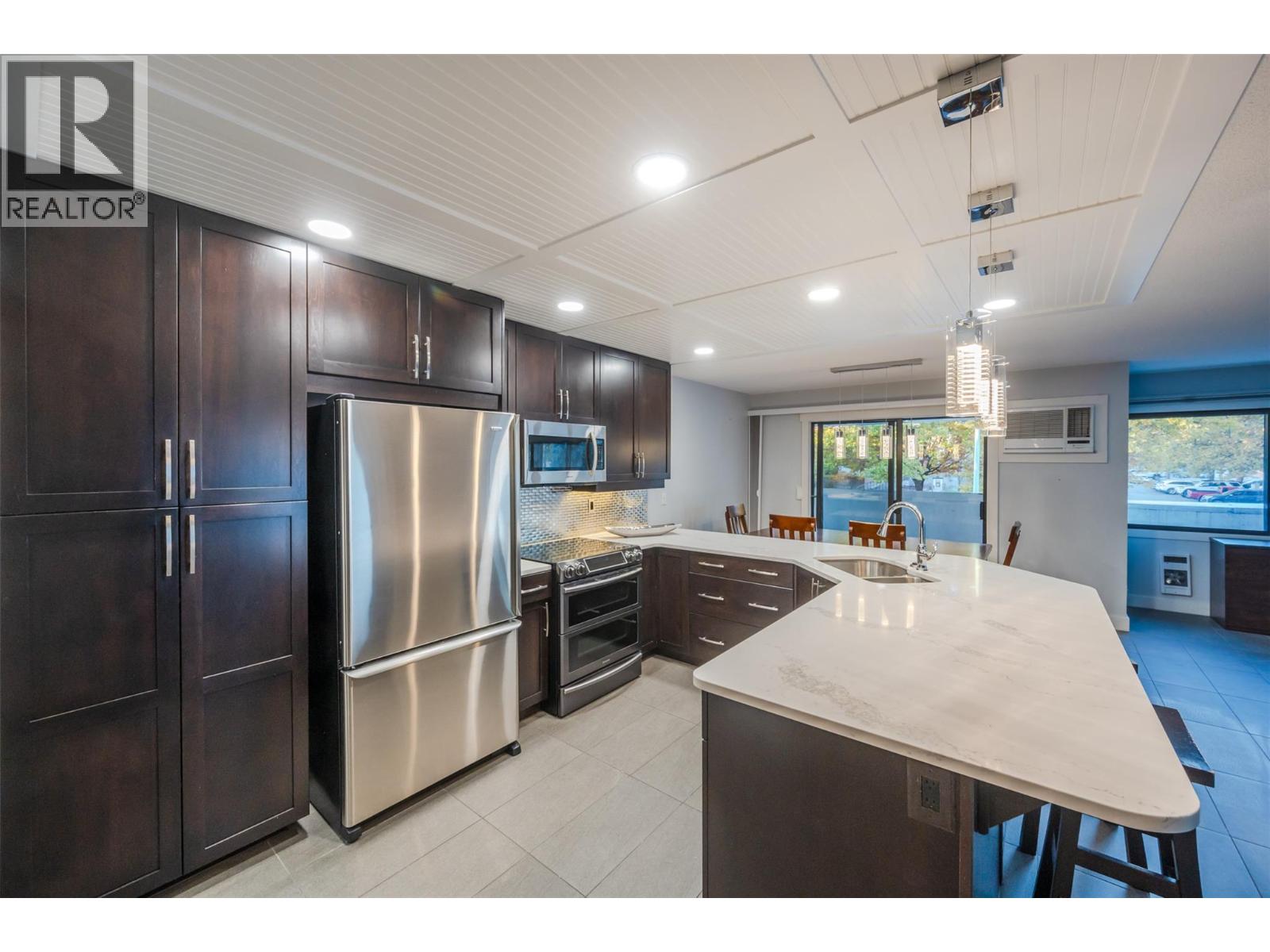 Experience downtown Kelowna living at its finest in this fully renovated 2-bedroom, 2-bath condo featuring an impressive 800 sq ft of private patio space. The open-concept layout offers a bright and stylish living area with an electric fireplace, a covered deck off the dining room, and patio access from both the living room and primary suite. The primary bedroom boasts heated floors and a 3pc ensuite, while the spacious 4pc main bath and laundry room with extra storage add everyday convenience. Enjoy top-notch building amenities including an outdoor pool, party room, exercise room, bike storage, and storage lockers—plus two underground parking spaces. All this just steps from the shops, restaurants, and entertainment of vibrant downtown Kelowna. Contact the listing agent to view! (id:6770)