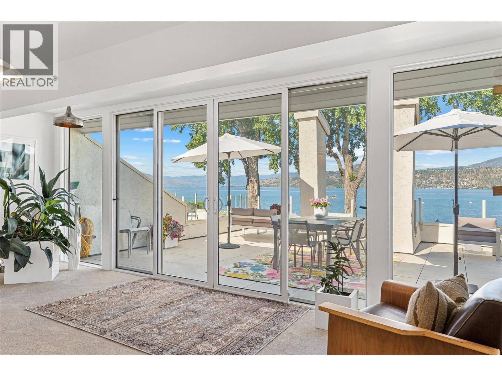 This beautifully maintained waterfront residence offers bright, spacious one-level living in one of Kelowna’s most sought-after communities. Featuring two generous bedrooms and two bathrooms, the home includes a modern maple kitchen with an eating peninsula and adjacent dining area, perfect for entertaining. The living room, complete with a cozy gas fireplace, opens into a sun-drenched flex space through new floor-to-ceiling glass doors, leading to a fully refurbished lakefront patio. The expansive primary bedroom features a walk-through closet and a luxurious 5-piece ensuite with a glass shower and soaking tub. Additional highlights include updated LED recessed lighting, remote-controlled foyer lighting, blackout blinds in the front bedroom, new ceilings in the primary suite, refreshed paint and hardware, a split-unit heater and A/C in the living room, a newer LG slide-in range, and a large in-suite storage closet. The newly renovated laundry room adds to the home’s convenience. Building enhancements include a rubberized entry staircase and landings, fresh exterior paint, and updated front landscaping. Residents enjoy access to a concrete pool and newly tiled hot tub, along with secure underground parking—stall #28 included. Centrally located and within walking distance to amenities, this move-in-ready home blends modern comfort with timeless lakeside charm. (id:6770)