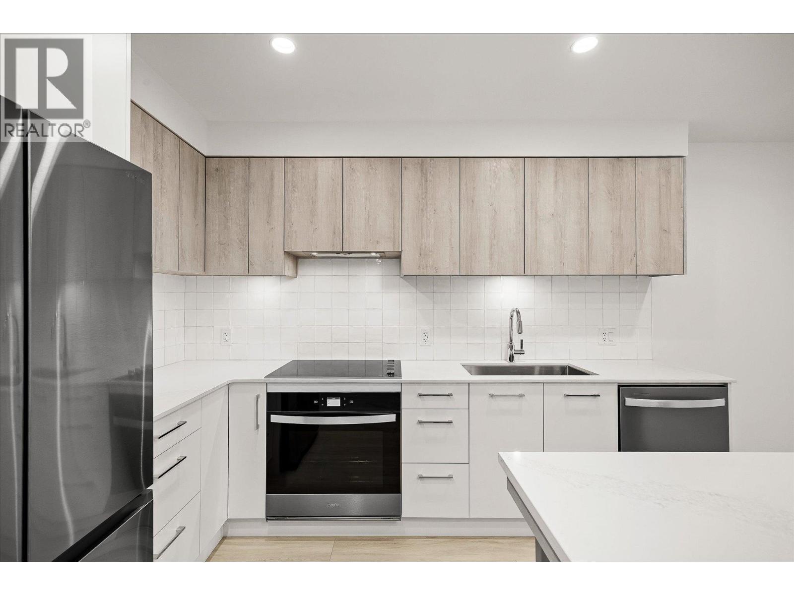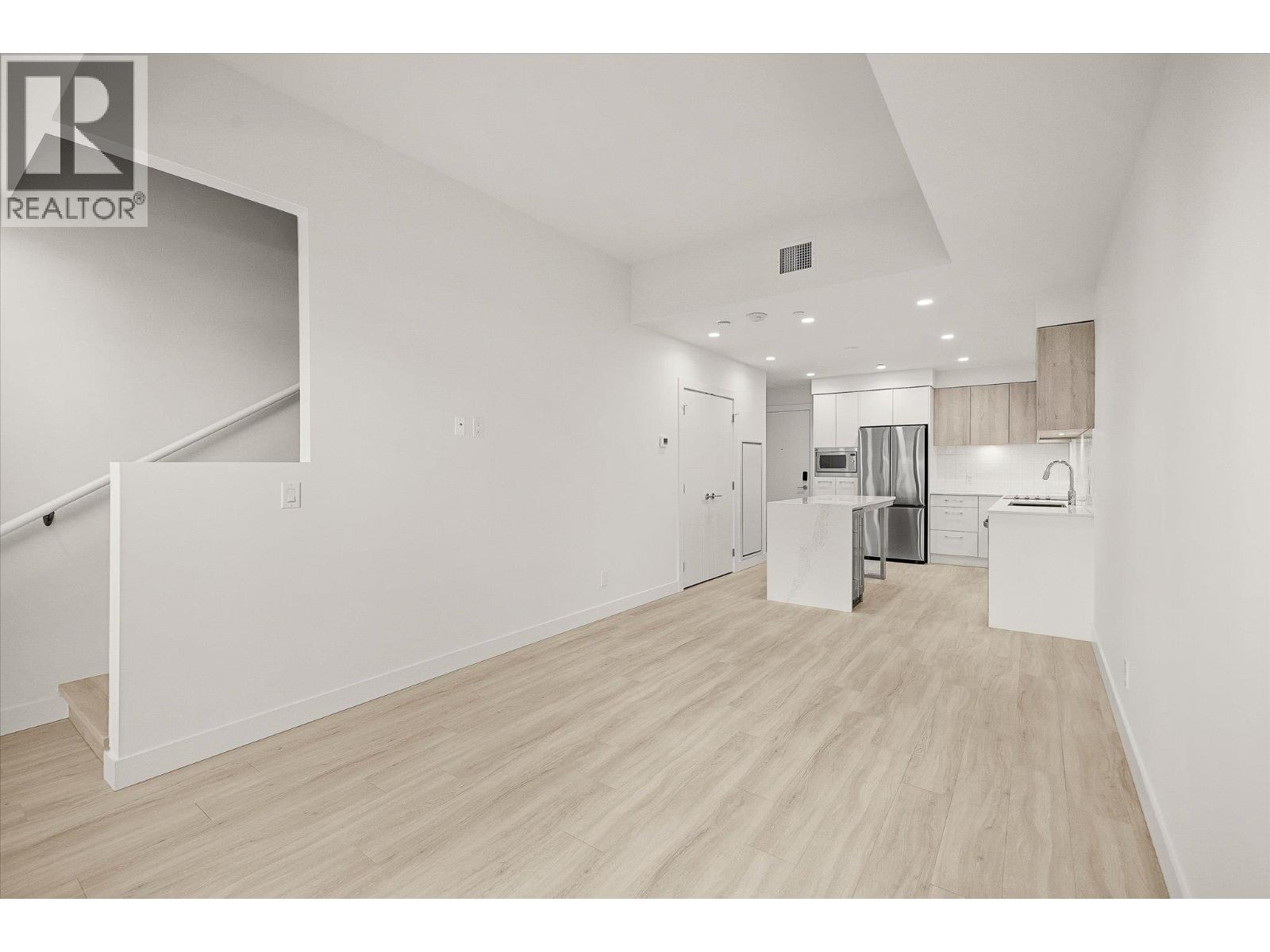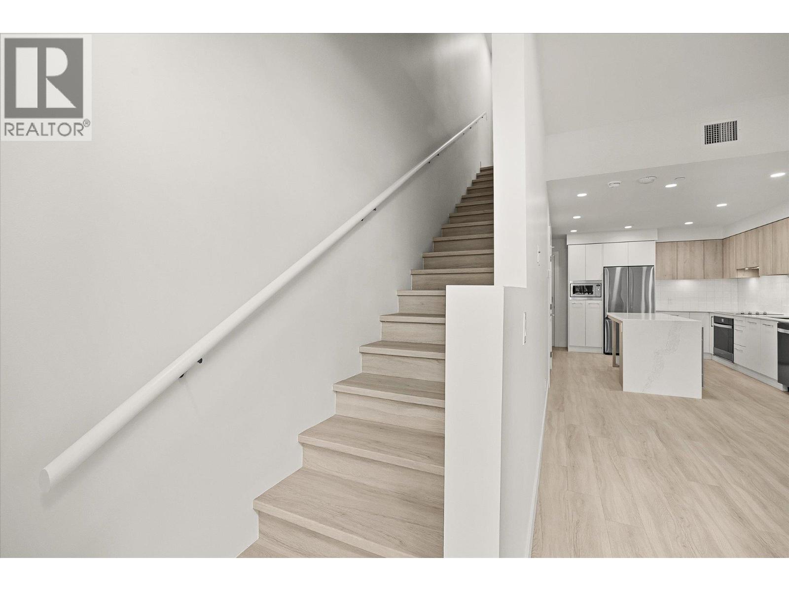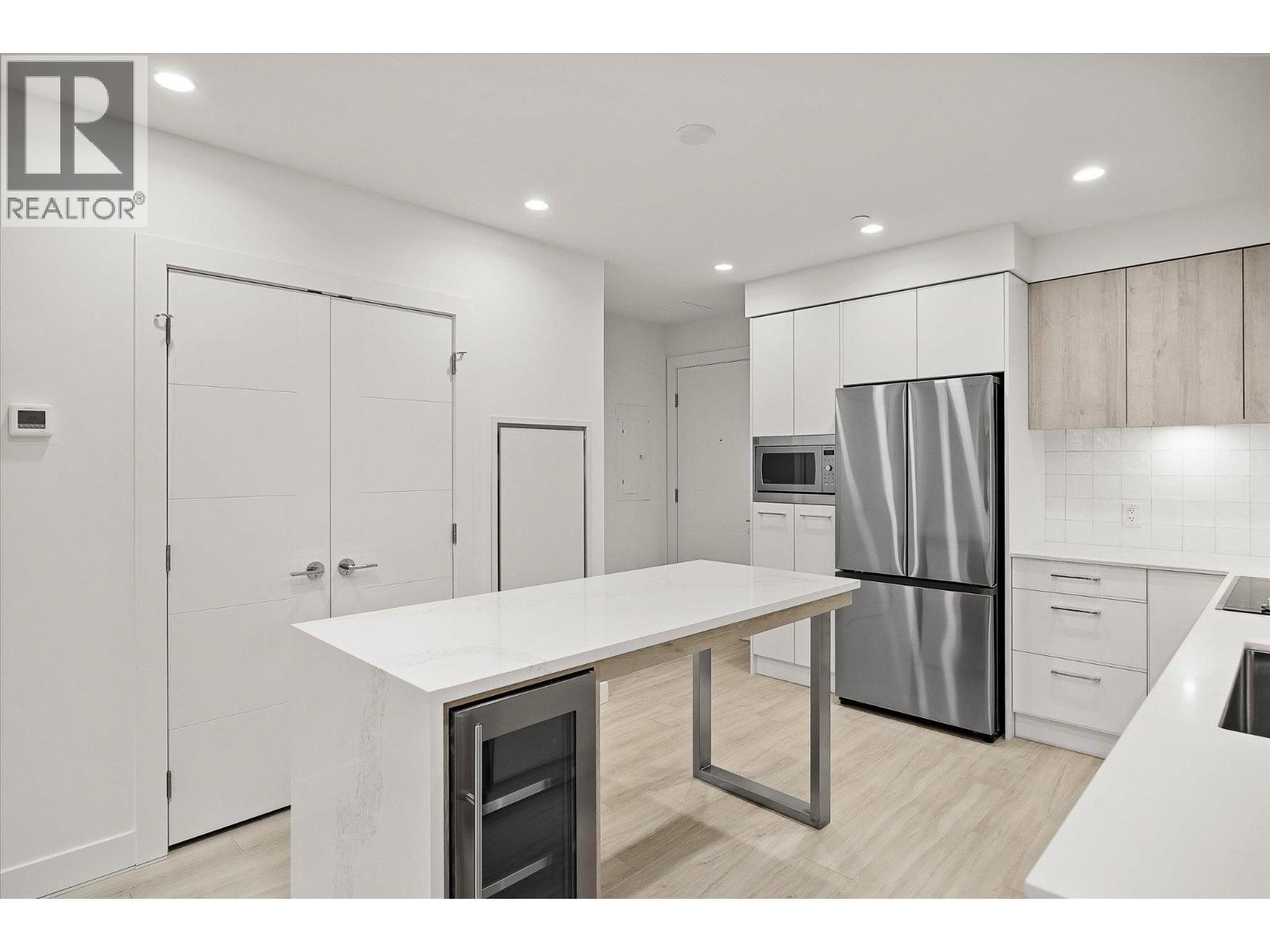 Welcome to Aqua Waterfront Village, Kelowna’s premier lakefront community in Lower Mission. This 2-storey, 2 bed, 2 bath townhome offers approx. 1,015 sqft of interior living, 155 sqft of exterior space, and includes a private, tandem 2-car garage in the building's parkade. The main floor features a bright, open-concept layout with oversized windows providing ample natural light. Luxury wide-plank vinyl flooring extends throughout the kitchen, living, dining, and bedroom areas. The kitchen showcases modern two-toned cabinetry, polished quartz countertops, dining island, integrated LED lighting, and a premium stainless steel appliance package that includes a wine fridge. Upstairs, you’ll find 2 generous bedrooms and 2 contemporary bathrooms featuring quartz vanities, porcelain tile and stylish finishes. Additional touches include blackout roller shades in the primary bedroom, custom closet organizers in both bedrooms and an energy-efficient central heating/cooling system. 1 storage locker, 1 bike locker included. Amenities include: an outdoor pool and hot tub, gas fire pits and BBQ’s, a fireside lounge and co-working area, 2-level fitness centre, pet wash and bike wash and maintenance area. Vacant and ready for quick possession. Only a 5% deposit required. Buyer to verify all details and measurements if deemed important. All offers must be written on the Developer’s CPS. (id:6770)