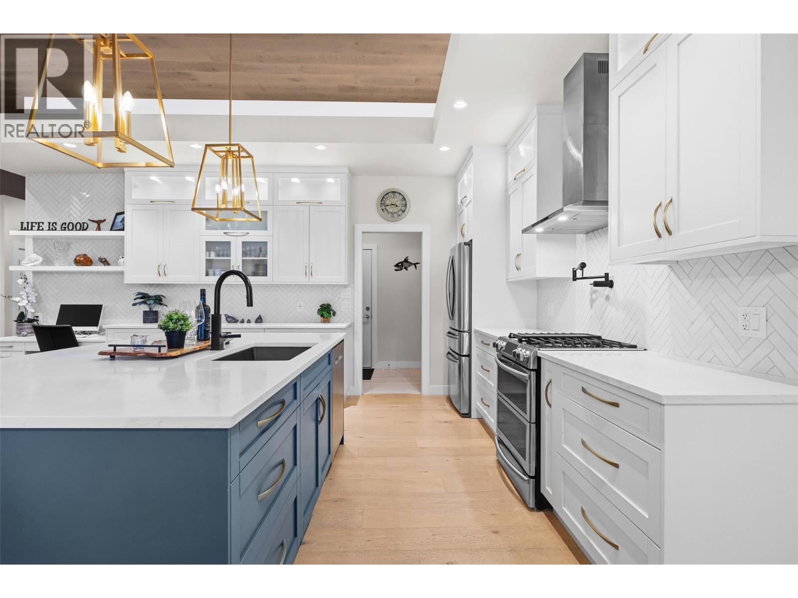 Experience luxury Okanagan living in this stunning Lakestone residence, perfectly positioned on a rare extra-wide lot with unobstructed 180-degree lake views. This 6-bed, 4-bath home showcases a bright, open-concept design with a main-level primary suite and expansive view windows equipped with power blinds. Enjoy year-round indoor–outdoor living in the beautifully landscaped, irrigated yard or on the oversized covered deck featuring motorized Phantom screens. A dream for car enthusiasts, the property offers a large flat driveway and an impressive 4-car heated garage complete with an RV bay (12.5' ceilings, 31.5' depth), water bib, dedicated power, EV charger, and durable epoxy flooring. The walkout lower level is designed for entertaining, offering a spacious family room, a proper wet bar, and a private hot tub patio overlooking the lake. Located in the desirable Benchlands community, this home sits on a quiet no-through road with generous spacing between friendly neighbouring properties. Residents enjoy quick access to YLW, shopping, scenic trails, a dog park, a bike park, and the award-winning Lakestone Club amenities, which include pools, fitness centres, tennis and pickleball courts. Several renowned wineries are just minutes away, completing the exceptional Okanagan lifestyle this property delivers. (id:6770)