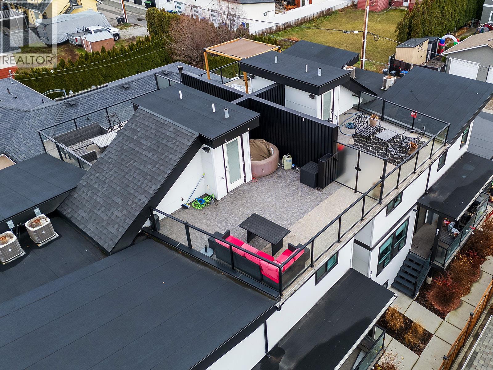 Stunning contemporary style townhome located in desirable South Kelowna - just a short walk to the beach, hospital, and South Pandosy shopping. 4-plex design with low strata fees & high-end finishings. Fantastic outdoor space featuring private roof top deck which is engineered for a hot-tub and plumbed for gas barbeque, plus there is a main floor side yard deck. 2 storey design unit with 2 beds, 2 baths and laundry on the 2nd floor. Open main floor with oak hardwood floors, built-in dining room bar with wine fridge, island kitchen with high quality stainless steel appliances including 5 burner gas range, plus half bath. Lower level consists of a large rec room which could be converted into a den plus a flex room. This level also features a full bathroom. Quality upgrades include quartz counter-tops, engineered hardwood floors, 3 zone home audio system, tank-less hot water heating frame-less glass shower, epoxy garage floor with glass/aluminum garage door. No rental or pet restrictions & low strata fees! Fantastic location, gorgeous designs and high-end finishings! (id:6770)