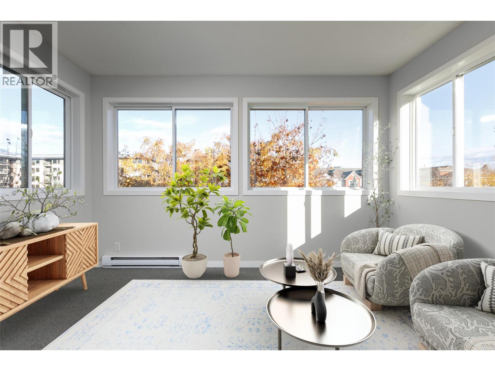 Welcome to The Murano! Location, Location, Location! Enjoy the best of central Kelowna living in this freshly painted and cleaned 2-bedroom, 2-bath corner unit with northeastern exposure and views towards Knox and Dilworth Mountains. Just steps from shops, cafes, and all urban conveniences, this bright and cheerful home offers both comfort and style. Enjoy morning coffee year-round on the enclosed, heated 10x14 patio—a wonderful all-season extension of your living space. Oversized windows with soundproof-grade glass overlook the peaceful 2nd-floor courtyard, where tall, mature trees create a canopy of foliage that softens both sound and scenery for a serene urban retreat. Inside, you’ll find 9' ceilings, timeless shaker cabinetry, and warm wood-tone engineered flooring—a sharp, low-maintenance design that feels instantly welcoming. The split-bedroom layout provides ideal privacy, with principal living spaces in the center. The Murano offers secure entry, two elevators (no long waits!), heated underground parking, and a storage locker. Green living at its best—geothermal heating and cooling are included in the strata fees! No age restrictions and long-term rentals allowed. A fantastic home or investment opportunity in the heart of Kelowna! (id:6770)