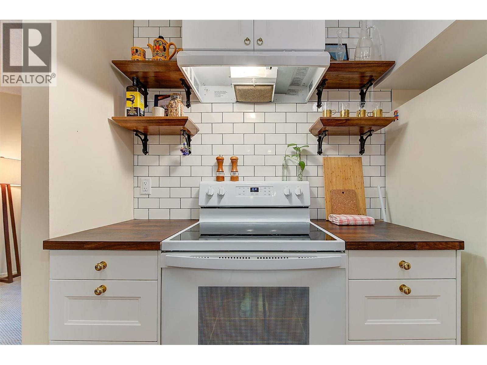 Renovated 2-Bedroom Condo on Prestigious Bernard Avenue. Discover modern living in this beautifully updated 1216 sq ft condo at 205-983 Bernard Ave. This bright, well-appointed unit combines tasteful upgrades with thoughtful design throughout. The completely renovated kitchen is a showstopper featuring crisp white shaker cabinets, rich butcher block countertops, subway tile backsplash, farmhouse sink, and brass fixtures. New Appliances were also installed during the renovation. The adjacent living room centers around a striking brick fireplace and flows seamlessly to your private covered balcony. Two generous bedrooms including a primary suite with balcony access and 4-piece ensuite. The main bathroom features a soaking tub with decorative tile surround. Multiple outdoor spaces include a covered balcony perfect for dining and entertaining, complete with overhead lighting and mature birch tree views. In-suite laundry room, abundant storage throughout, new terra cotta tile flooring in kitchen, hallways and bathrooms, with recently steam cleaned carpet in the bedrooms. Prime Bernard Avenue address puts you in the heart of Kelowna with easy access to downtown amenities, shopping, and services. This move-in ready unit offers the perfect blend of urban convenience and comfortable living. 2 dogs (20 inch height restriction at the shoulder) and 2 cats allowed. 1 Large Storage Locker included. Call 250-575-4138 for more information or to book a private tour. (id:6770)