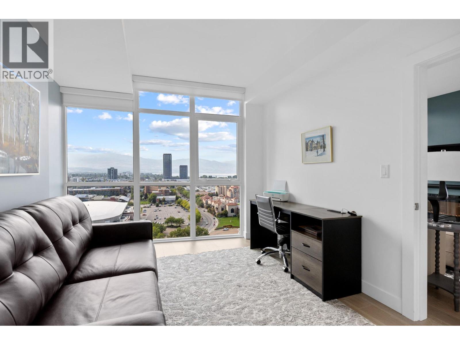 Experience elevated luxury living in the heart of downtown Kelowna. Soaring above the city on the 17th floor, this stunning 2 bed/2.5 bathroom home showcases west-facing views of Lake Okanagan, the city skyline, and evening sunsets-captured through dramatic floor-to-ceiling windows. Open the double doors to your wrap-around entertainer's balcony. The gourmet kitchen impresses with a waterfall island, stainless steel appliances including a gas stove, two-toned cabinetry, and an upgraded pantry with built-in storage. The primary retreat offers balcony access, custom walk-in closet storage, and a spa-inspired ensuite. A bathtub lover's dream-indulge the stand-alone soaker tub while taking in the breathtaking views, or refresh in the waterfall shower. Dual vanities with designer sinks complete the spa-like feel. The second bedroom also features a 4-piece ensuite, walk-through closet, and additional upgraded storage. Additional highlights include a cozy electric fireplace, in-suite laundry, 2 parking stalls and 1 storage locker. Residents enjoy resort-style amenities: fitness centre, social and BBQ areas, and a year-round plunge pool-heated in winter, cooled in summer. All this in a prime downtown location, just steps to the beach, boutique shops, award-winning restaurants, breweries, concerts, and Kelowna's vibrant cultural scene. 2 pets welcome with restrictions. (id:6770)