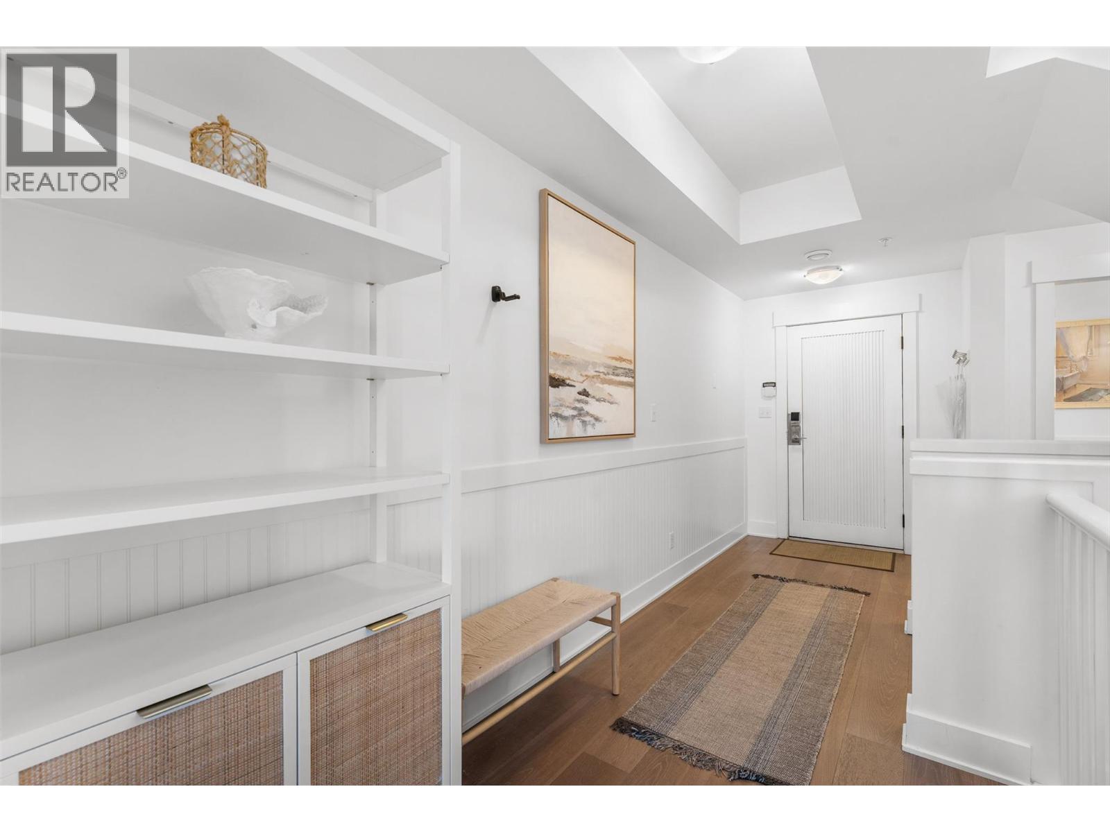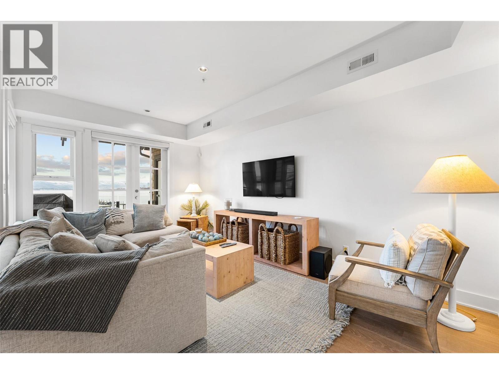Experience true waterfront living at Mission Shores in this light-filled 3-bedroom, 4-bath townhome set along one of Kelowna’s most sought-after stretches of Lake Okanagan. Blending a refined beach-house feel with front-row views, this spacious residence offers bright, open-concept living and seamless indoor–outdoor flow. The main level features wide-plank hardwood floors, high ceilings, and a kitchen with a large quartz peninsula island, shaker cabinetry, and premium appliances. The dining and living areas open through French doors to a generous lakeview deck with gas BBQ hookup perfect for sunset gatherings. A private main-floor bedroom with ensuite is ideal for guests. Upstairs, the lakeview primary retreat impresses with vaulted ceilings, walk-in closet, 5-piece ensuite, and access to a private deck overlooking the shoreline. A second upper-level bedroom offers vaulted ceilings, walk-in closet, and its own 3-piece ensuite. A bright landing with a large skylight fills the home with natural light. Additional features include two parking spots, two private entrances, one directly from the garage, ample storage, gated courtyard entry, and in-unit laundry. A dedicated 8,000 lb. boat slip (#26) completes this exceptional offering. Residents of Mission Shores enjoy a lakeside pool and hot tub, fitness centre, meeting room, and beautifully landscaped paths just steps to the beach, restaurants, and all Lower Mission amenities. (id:6770)