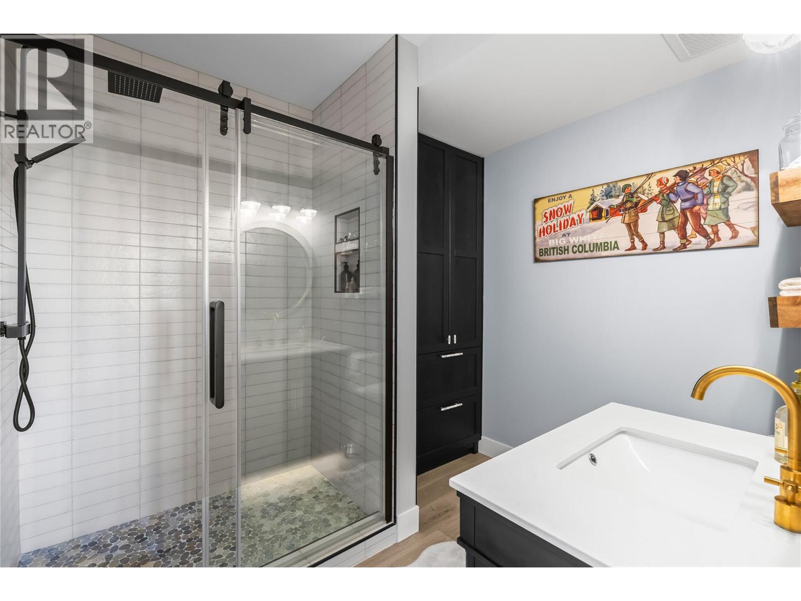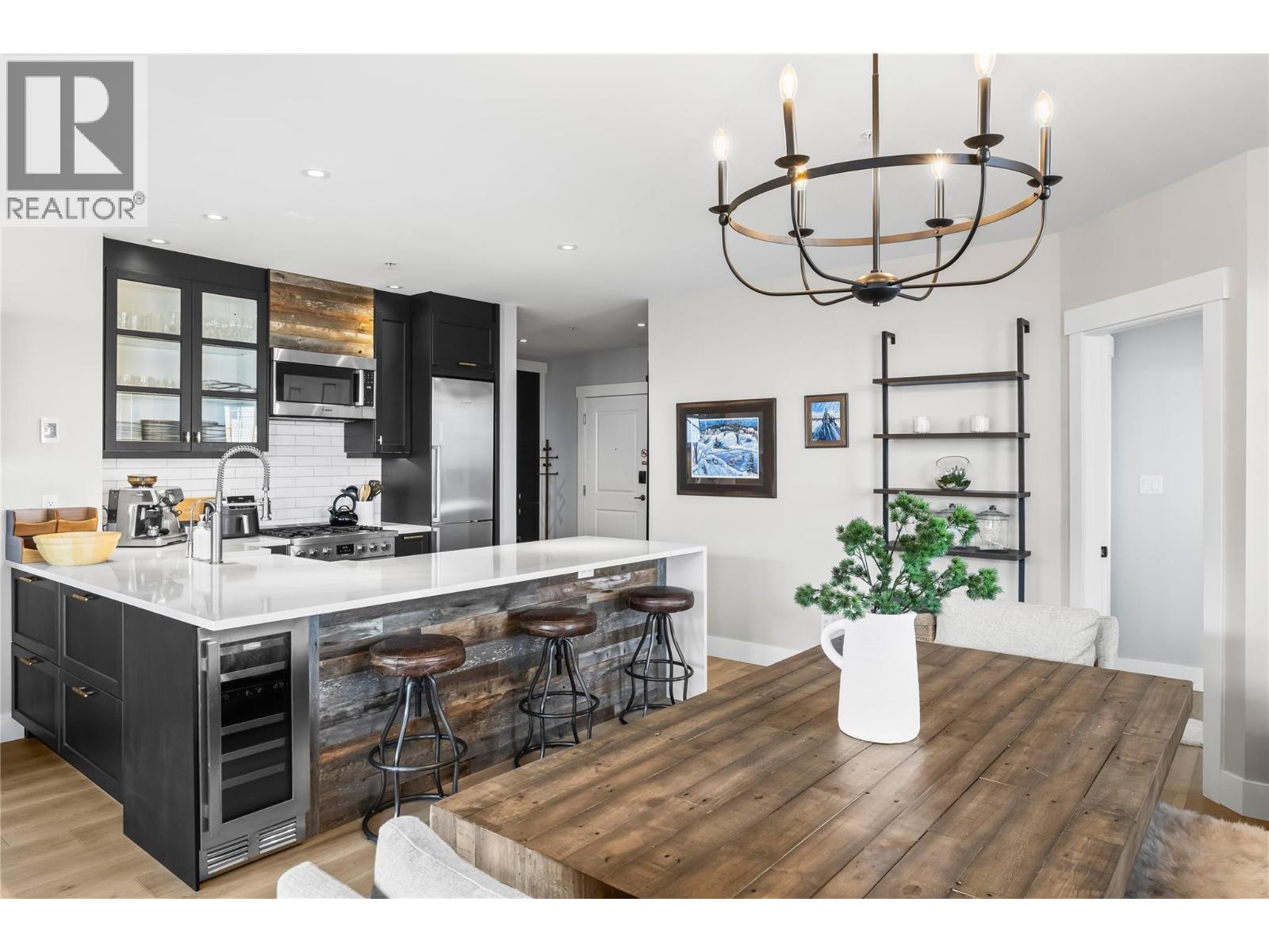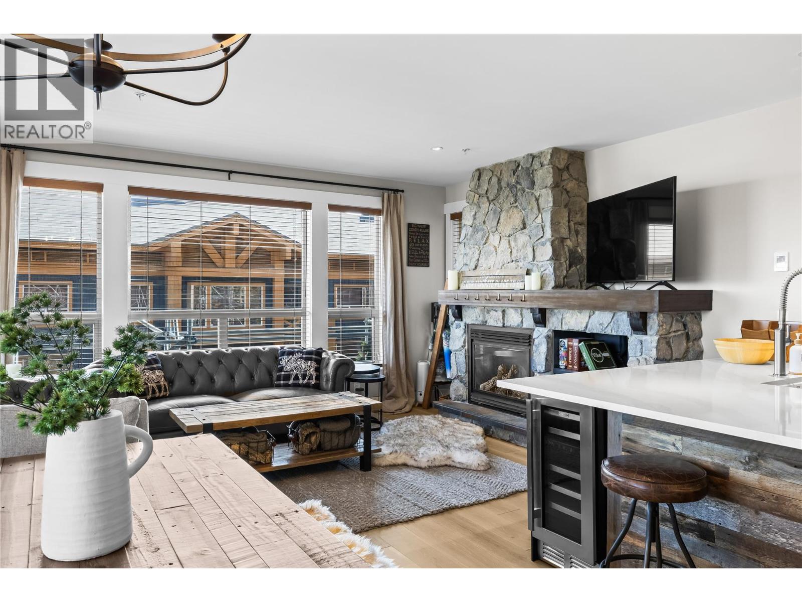 Experience the best of Big White in this luxury mountain retreat at Stonegate Resort. This gorgeously decorated, fully renovated two-bedroom, two-bathroom residence offers the perfect blend of mountain elegance, comfort, and family fun. With prime ski-in, ski-out access off Hummingbird, you’re steps from the Village and seamlessly connected to the slopes. Every detail has been meticulously upgraded—from Raintree waterproof hardwood flooring with in-floor heating to custom lighting, designer trim, and smart home features that enhance convenience and efficiency. The chef-inspired kitchen impresses with quartz waterfall countertops, Bosch appliances, a propane cooktop, dual-zone wine fridge, and real barnwood accents that create a warm, inviting atmosphere. Spa-inspired bathrooms feature luxury showers, custom cabinetry, heated towel racks, and motion-sensor lighting for added comfort. The primary bedroom includes a barnwood feature wall and custom wardrobe, while the spacious bunk room sleeps six, making it perfect for family gatherings or rentals. After a day on the mountain, relax in your private hot tub, surrounded by high-end furnishings and Big White artwork. Enjoy the resort amenities including a heated pool, multiple hot tubs, fitness center, theater, games rooms, and kids’ play area. Whether for personal enjoyment or as a high-performing investment, this turn-key residence delivers the ultimate Big White lifestyle—elevated, effortless, and ready to enjoy. (id:6770)