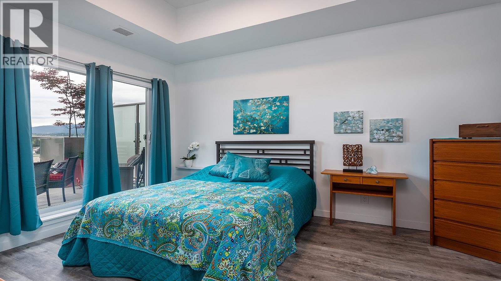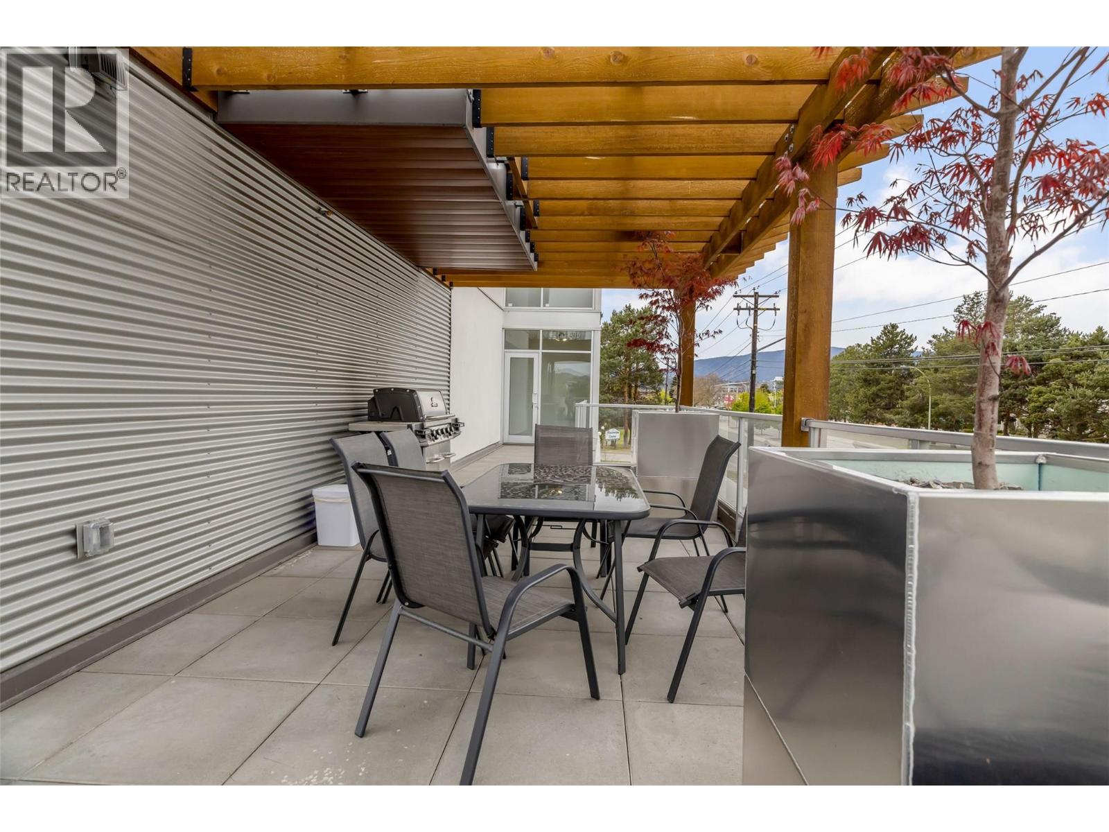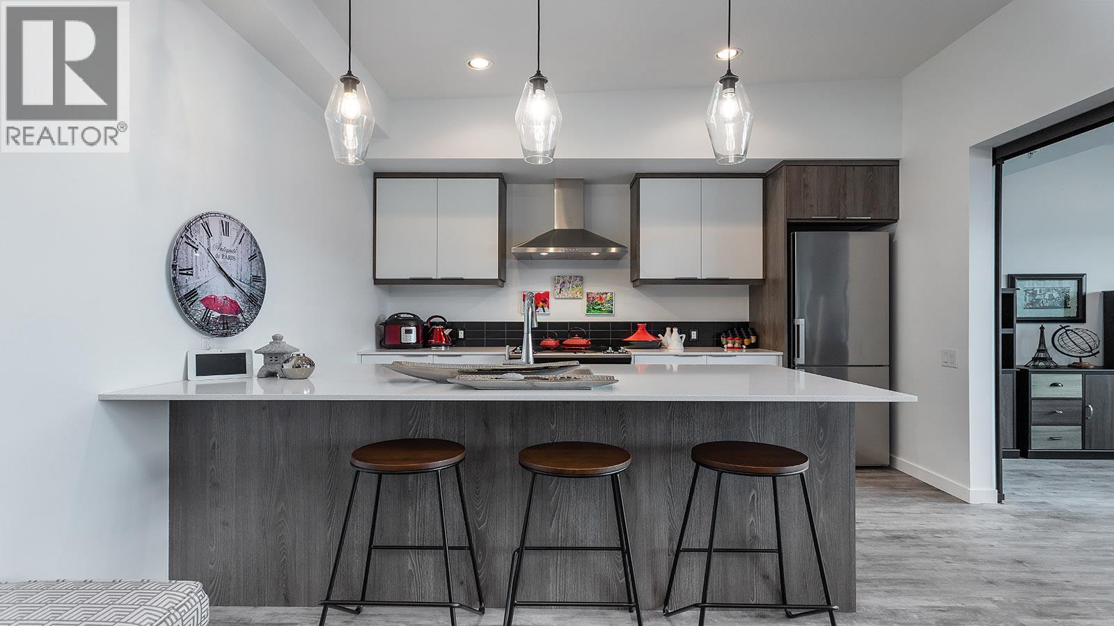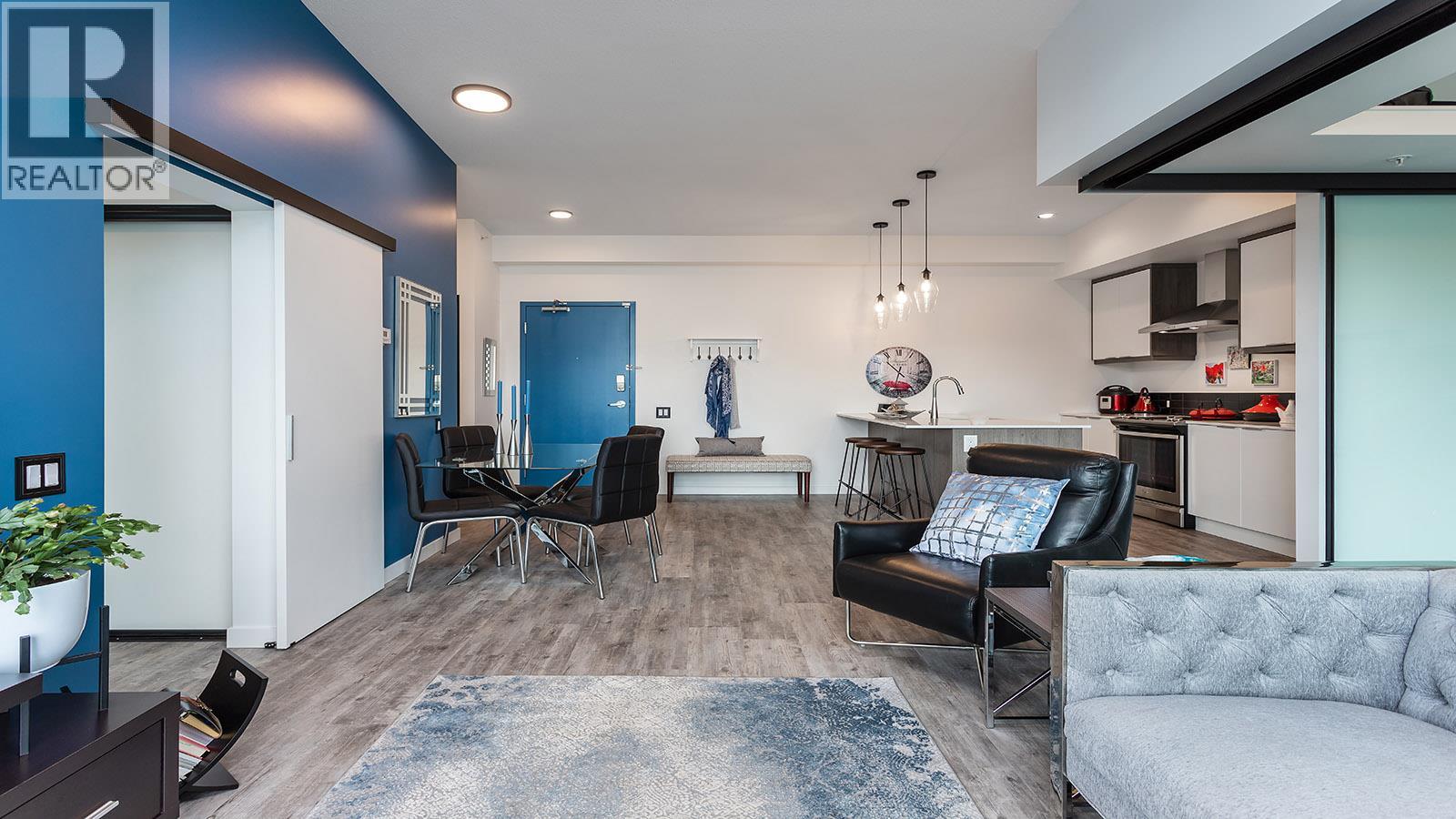 Welcome to SOLE on KLO — a bright, contemporary retreat perfectly positioned in the heart of the Lower Mission. This 1 bedroom plus den, 1 bathroom residence offers effortless modern living with a rare nearly 300 sq. ft. outdoor terrace capturing expansive east-facing mountain views and gentle morning light. Inside, an open-concept layout is enhanced by sleek finishes, including quartz countertops, stainless steel appliances, modern cabinetry, and durable vinyl plank flooring. The spacious den provides valuable flexibility, easily functioning as a second sleeping area with room for a queen Murphy bed, ideal for guests or hybrid living needs. The bedroom is paired with a well-appointed bath featuring clean, modern lines and a glass-enclosed shower. Large windows and sliding doors draw natural light throughout the home while seamlessly connecting the interior living space to the oversized terrace, perfect for outdoor dining, relaxing, and taking in the panoramic landscape. Additional features include in-suite laundry and a generously sized parking stall. Located directly across from Okanagan College and moments from the boutiques, cafes, and waterfront pathways of Pandosy Village, this residence offers exceptional walkability and a vibrant urban lifestyle. (id:6770)