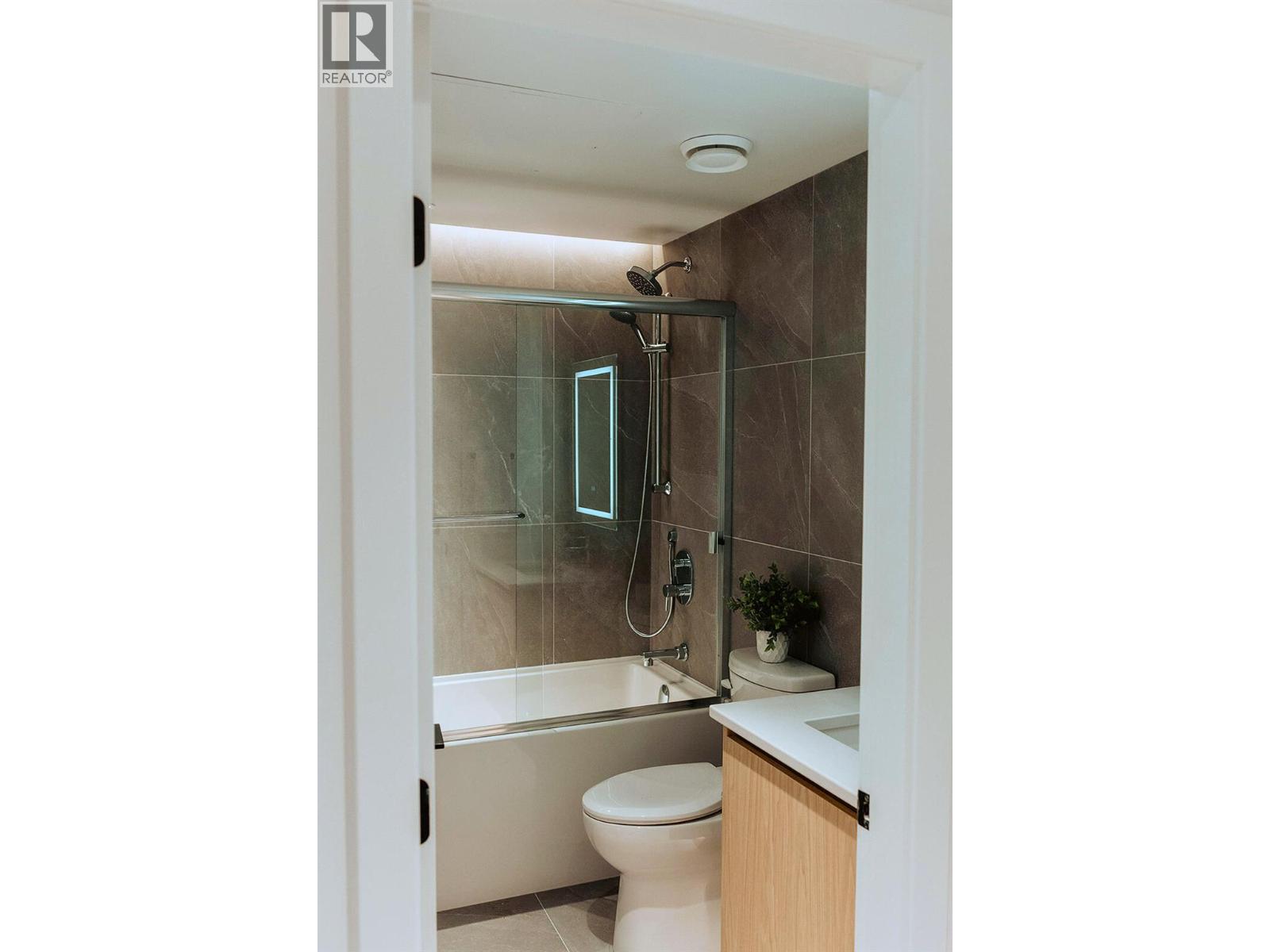 Welcome to ALMA, proudly developed by Mission Group. This bright east-facing 1-bed, 1-bath home offers over 540 sqft of interior space and 100 sqft of exterior space, this home blends thoughtful design with elevated finishes in the heart of the Lower Mission. The modern kitchen showcases flat-panel wood-grain cabinetry, a quartz waterfall dining island and stainless-steel appliances. The open-concept layout is ideal for both daily living and entertaining, highlighted by large windows that invite natural light, durable laminate flooring throughout the main living areas, and woven broadloom carpeting in the bedroom. The primary bedroom features a walk-thru closet, while the spa-inspired ensuite offers large-format tile, a rainfall shower, custom-tiled niche, and soft ambient lighting to create a relaxing, retreat-like atmosphere. Additional features include modern roller shades on every window and individually controlled heating and cooling for comfort in all seasons. Residents can enjoy amenities incl. an 8,000 sqft lakeview terrace w/firepits, BBQs, and community gardens as well as a fully equipped fitness center, dog wash, & bike maintenance station. With a walk score of 93, you’re steps from transit, KGH, shops & restaurants of vibrant Pandosy Village, and beautiful Okanagan Lake. Sqft and room sizes are approximate and may vary. Photos may be of a similar home and layout. This home is newly constructed and move-in ready. (id:6770)