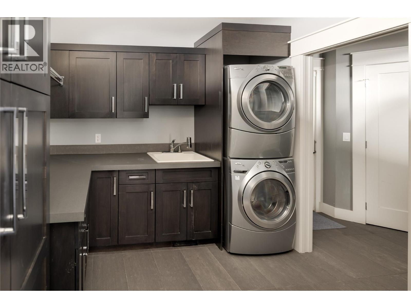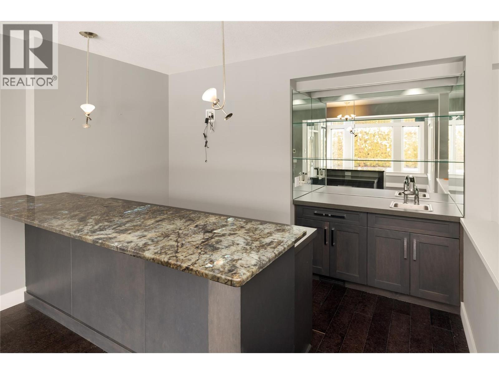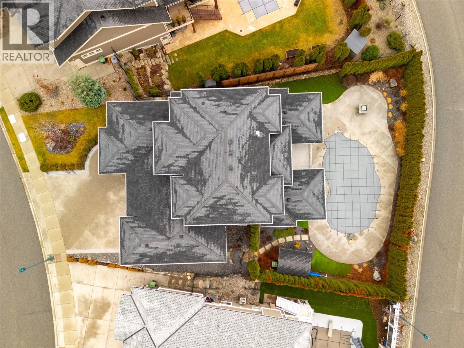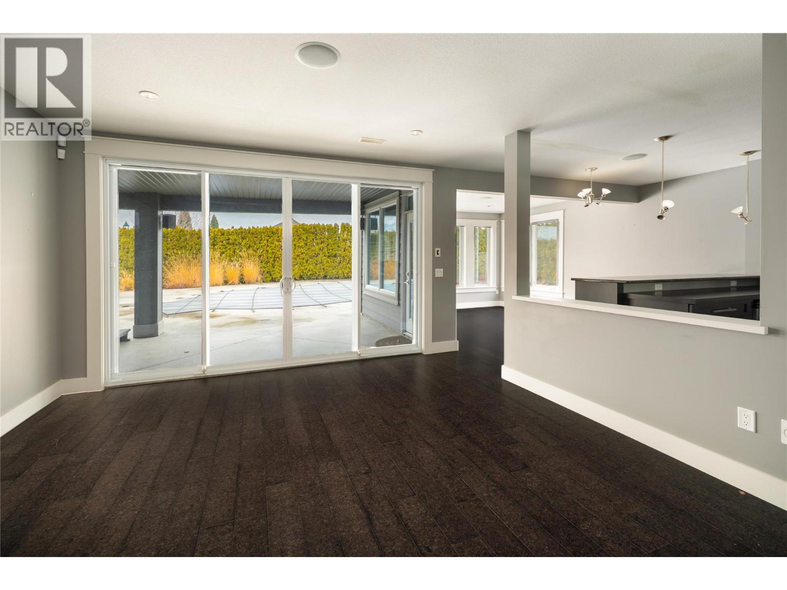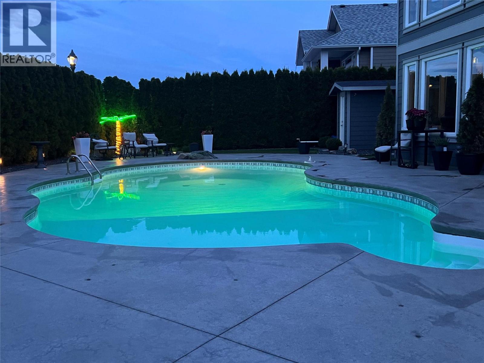 Set in one of Kettle Valley’s most established, family-friendly neighbourhoods, this modern residence offers over 4,000 sq. ft. of well-designed living space with exceptional value for growing families. Just minutes to schools, parks, and neighbourhood amenities, the location balances daily convenience with an active lifestyle. Thoughtfully planned across three levels, the home features five bedrooms, four bathrooms, and a dedicated den. Vaulted ceilings, expansive windows, and a floor-to-ceiling fireplace define the main living area, while the granite kitchen is equipped with Fisher & Paykel and Miele appliances, a gas range, convection oven, integrated coffee system, and Bosch dishwasher. The dining area opens to a covered patio with gas hookup, outdoor speakers, and open views—ideal for everyday living and entertaining. The primary suite is located on the main floor with heated ensuite flooring. Hardwood floors, built-in speakers, heated tile in the entry, and accent-lit stairs reflect the quality carried throughout. Upstairs offers two additional bedrooms, while the lower level includes two more bedrooms, a theatre room with tiered seating, wet bar, recreation space, and walk-out access to the yard. A bathroom with exterior access adds poolside convenience. Outdoors, mature hedging frames a private, resort-style setting with a swimming pool, stone water feature, hot tub, and multiple lounging areas—an ideal family home with room to grow in the heart of Kettle Valley. (id:6770)