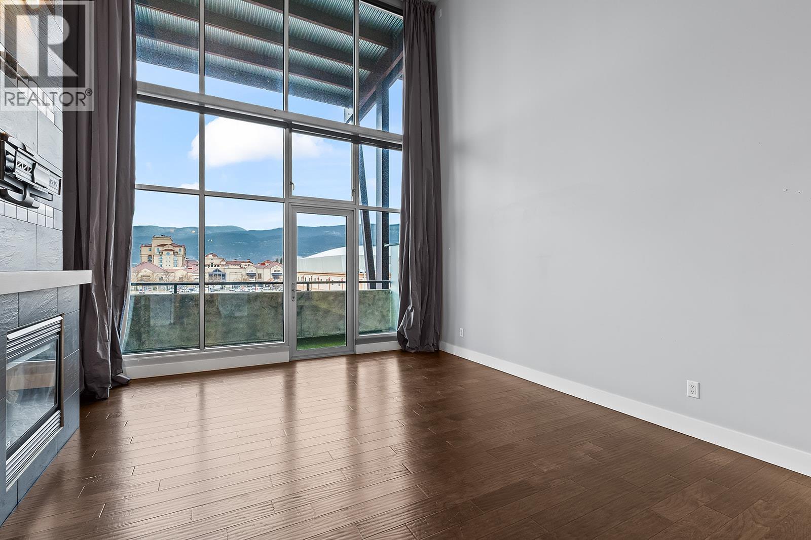 Rare opportunity in the highly sought-after Cannery Lofts, located in the heart of downtown Kelowna. This top-floor, lake-facing unit offers an exceptional blend of style, comfort, and convenience. Featuring 20-foot ceilings and a contemporary loft design, the home includes one bedroom, two bathrooms, and a spacious flex room that can serve as a second bedroom, office, or den. The open-concept living area is bright and airy, with floor-to-ceiling windows, a gas fireplace, and access to a covered patio with lake views. The kitchen is equipped with upgraded appliances, including a gas range. Additional highlights include in-suite laundry, hardwood flooring, newer carpet and window coverings, and fresh paint throughout. The secure concrete building offers one indoor parking stall, bicycle storage, a shared rooftop patio, and excellent security features. Pet permitted with approval. An exceptional downtown lifestyle steps from restaurants, cultural amenities, and the business district. (id:6770)