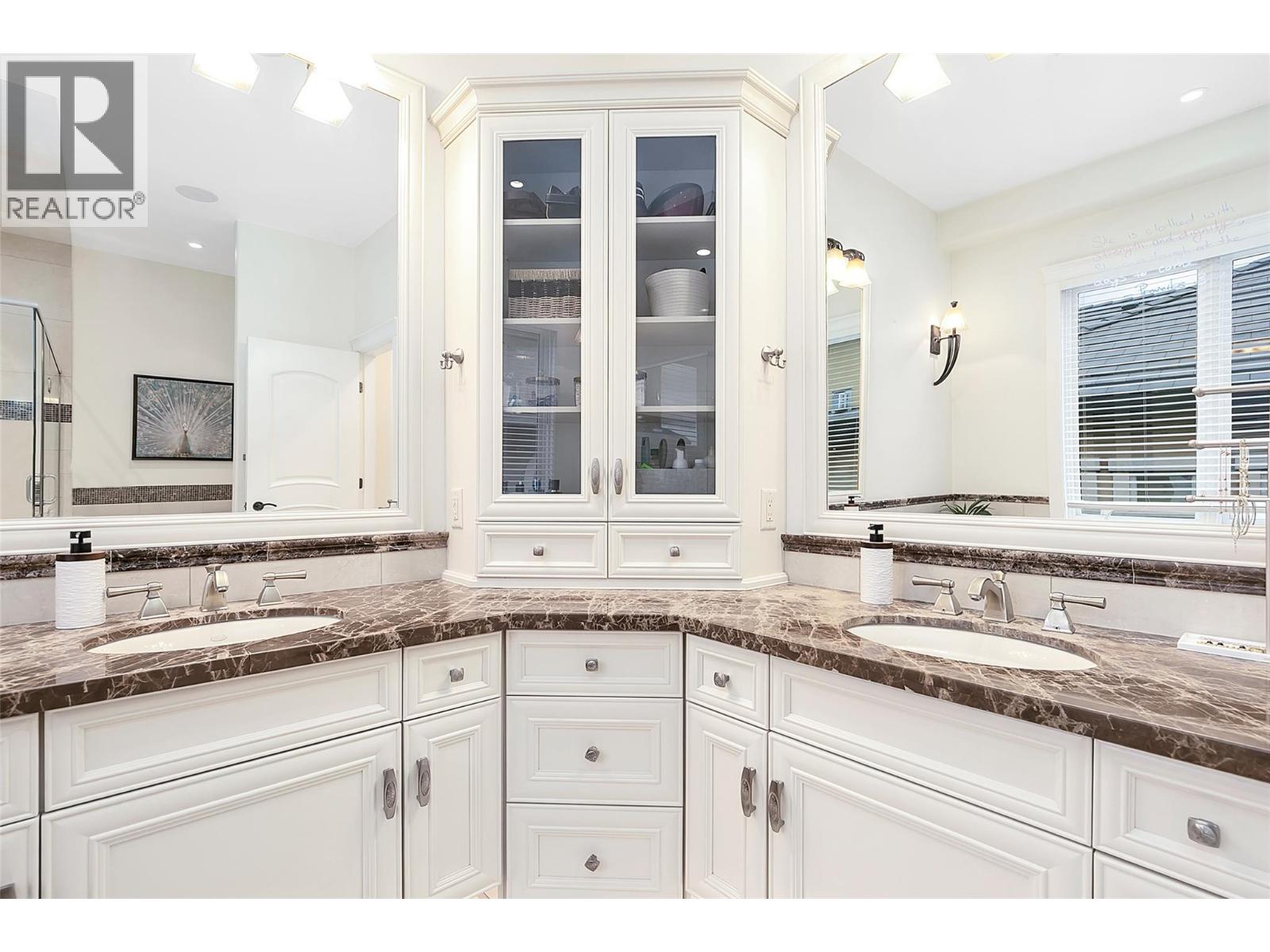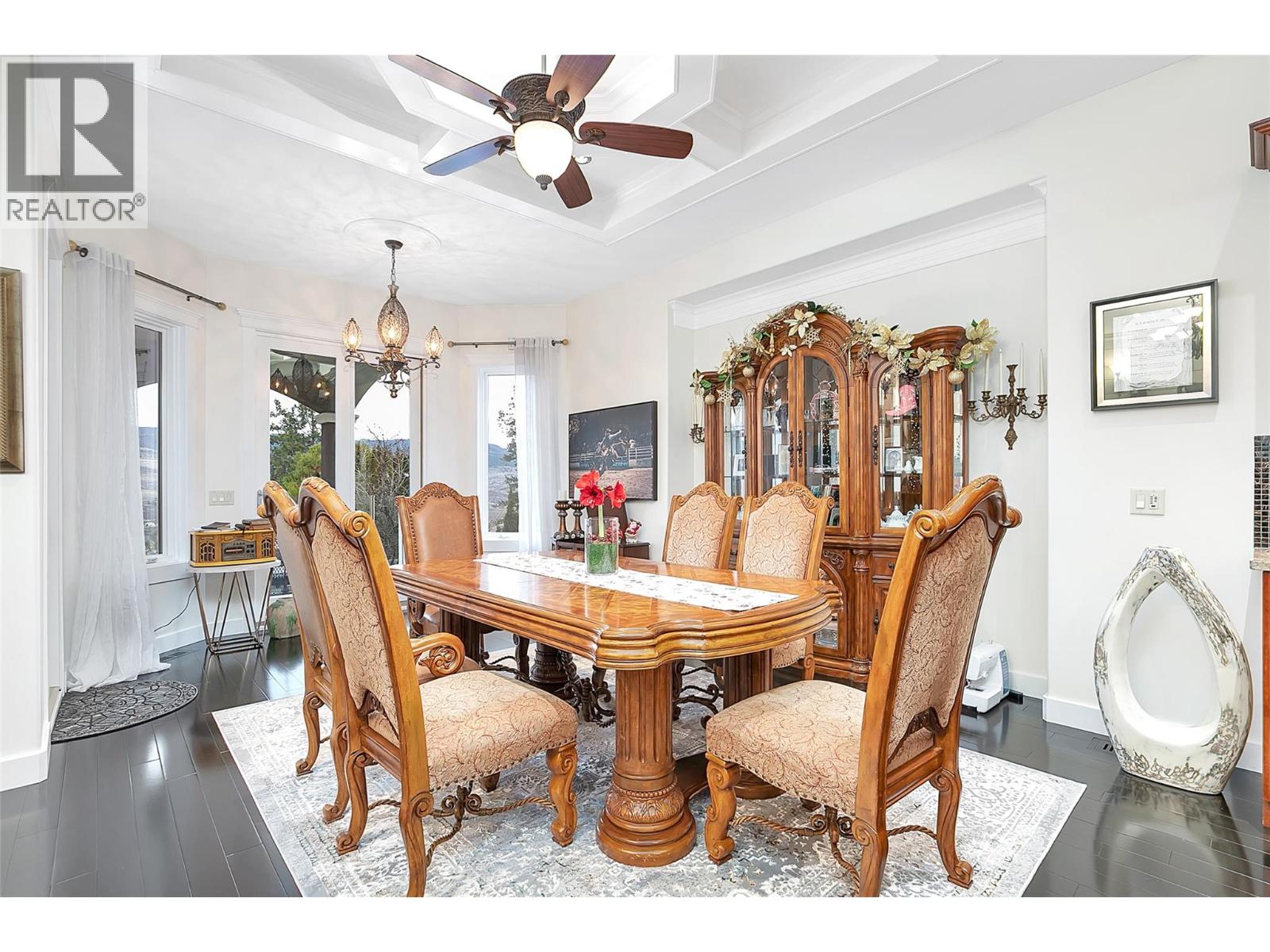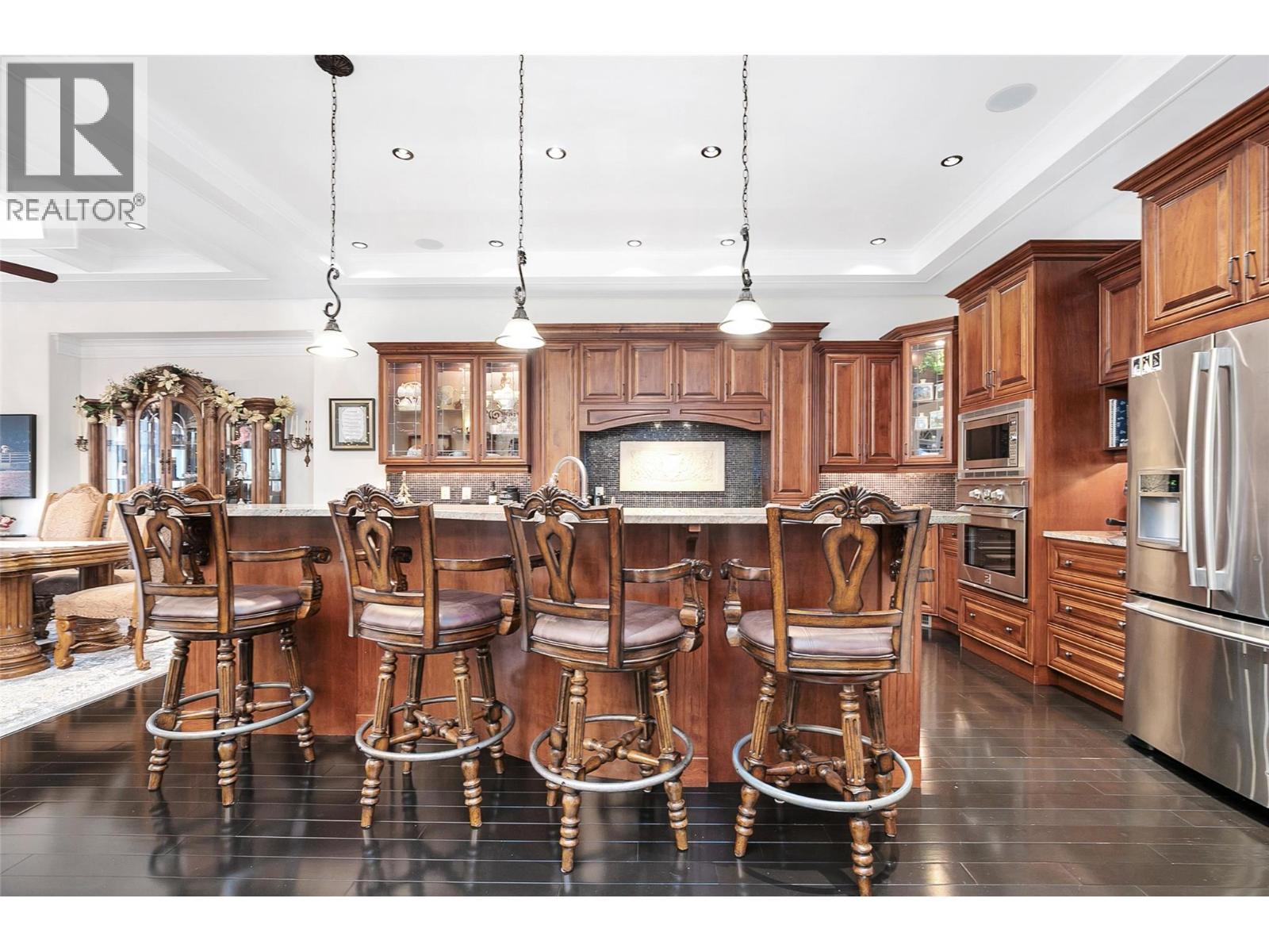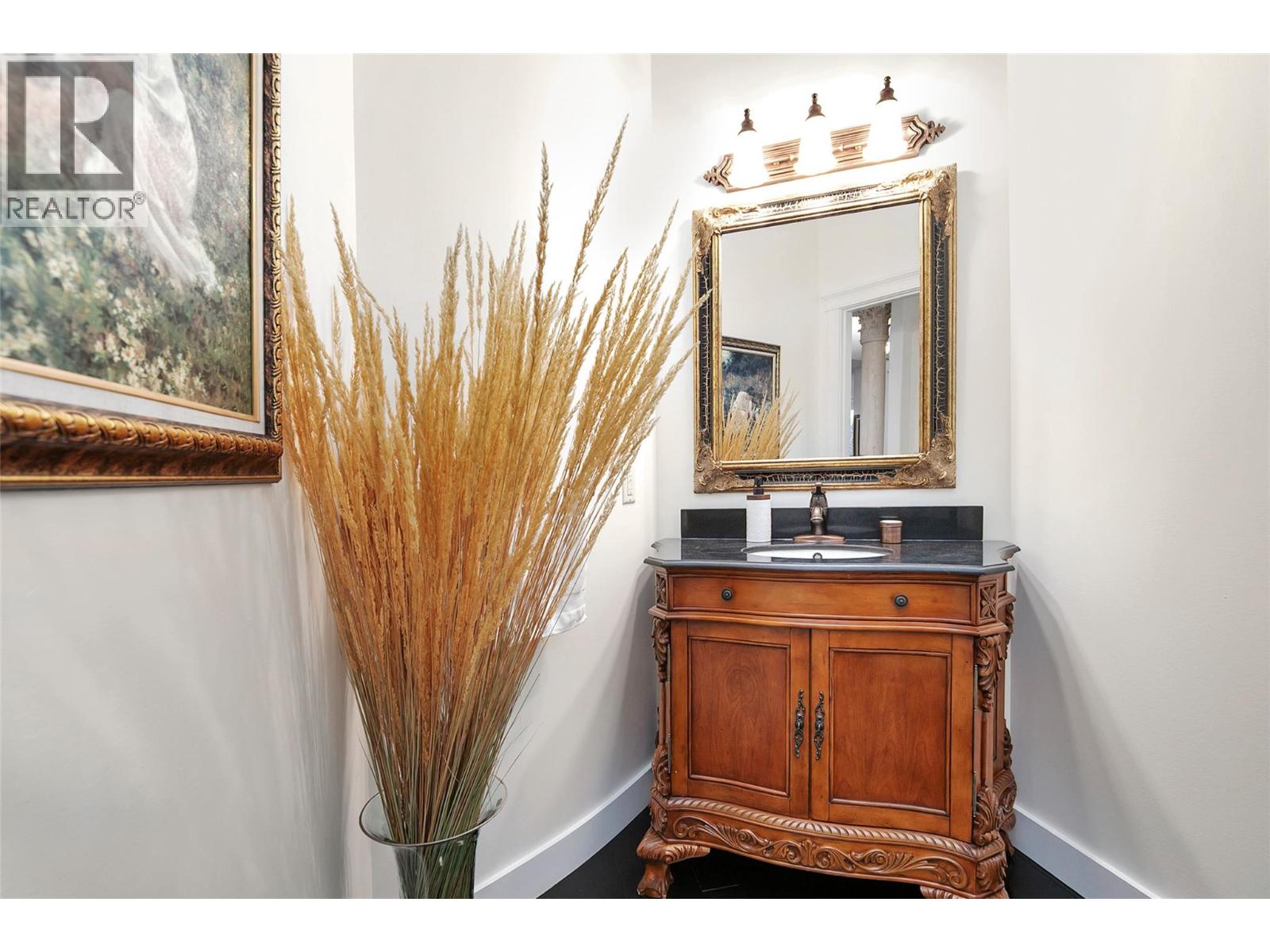 Welcome to an exceptional residence where timeless elegance meets breathtaking scenery. Enter through the grand rotunda foyer and be immediately drawn into the expansive living room, an architectural showpiece with high ceilings and walls of windows framing uninterrupted valley and mountain views. Designed for both refined entertaining and everyday luxury, the chef’s kitchen is a true centerpiece featuring an oversized island and stainless steel appliances. The adjoining dining room easily accommodates large gatherings while enjoying stunning outlooks. The primary suite is a private retreat offering walk-out access, sweeping vistas, and a spa-inspired ensuite finished in granite and tile, complete with a Jacuzzi soaker tub, bidet, and walk-in closet, creating an ideal sanctuary at day’s end. A dedicated office and a second bedroom or guest suite with a multi-jetted shower complete the upper level. A curved custom staircase leads to the finished walk-out lower level, offering a spacious recreation room, entertainment kitchen and bar, theatre room, gym space, two additional bedrooms, and a full bathroom. Outdoors, covered patios and a fountain-accented backyard provide the perfect setting for entertaining or quiet relaxation. Ideally located near golf courses like The Okanagan Golf Club, parks and trails, and everyday amenities, with convenient access to YLW, this home offers luxury, scale, and unforgettable views in a highly sought-after setting. Make it yours today! (id:6770)