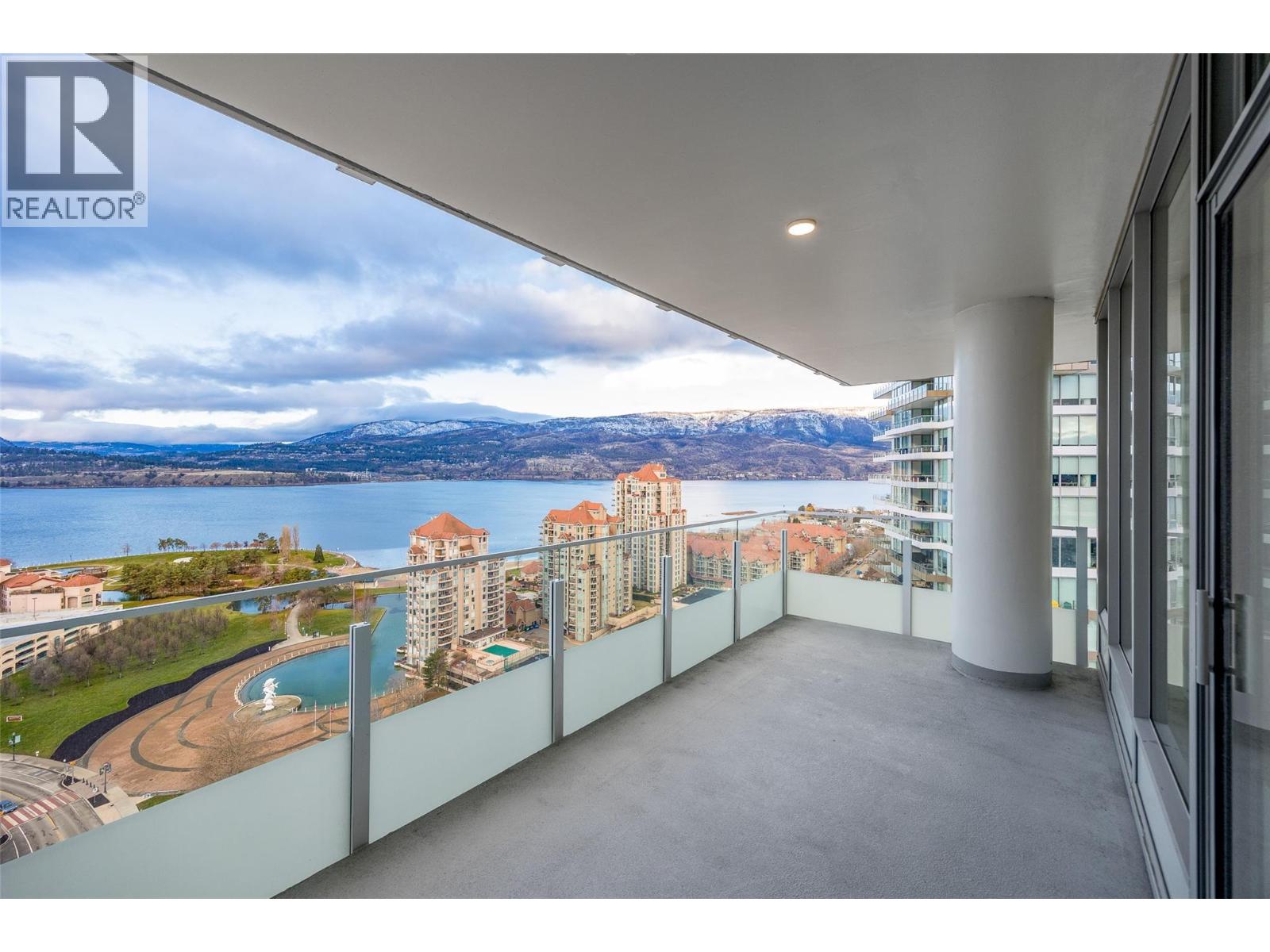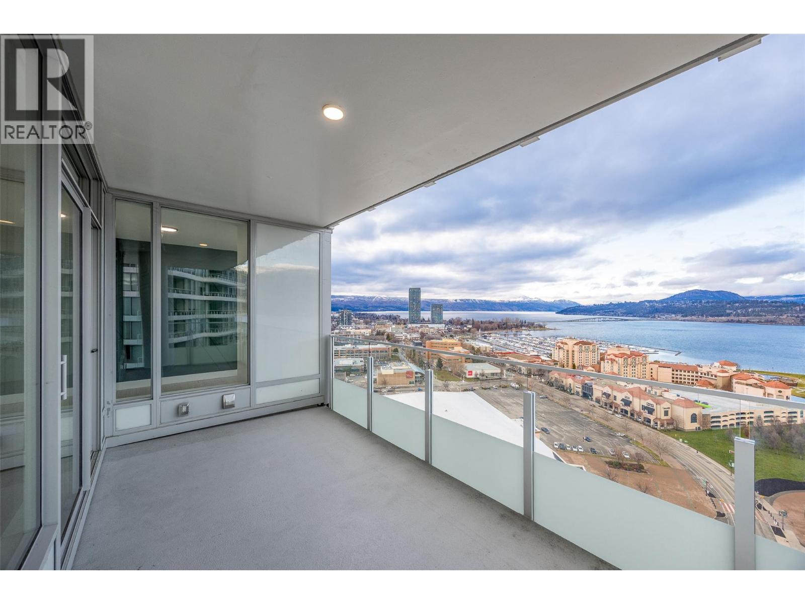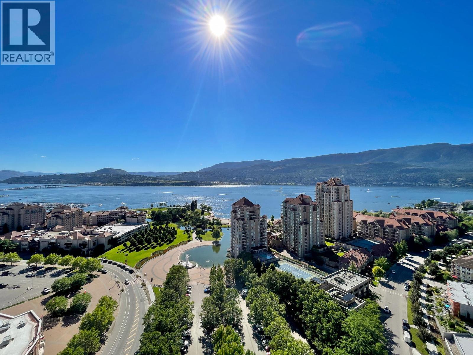 PANORAMIC LAKE VIEWS. Perched high above the city, unit 2205 at One Water Street delivers a true condo-in-the-sky experience with a sweeping west-facing vistas, capturing lake, city mountain & sunset views from every angle! This 2 bed, 2 bath corner unit features an open floor plan where the kitchen, dining and living spaces flow seamlessly to a massive covered sundeck overlooking Kelowna’s waterfront park & Okanagan Lake. The best spot in town to watch boats pass and a front row seat to take in the fireworks! The kitchen blends warm beach tones inspired by Knox Mountain with stainless steel appliances, gas range, island seating, upgraded lighting & near floor to ceiling windows. Custom upgrades include Westwood cabinetry in the primary bedroom and a built-in laundry closet with stacked washer & dryer. The primary bedroom offers a walk-in closet & 3-pc ensuite, while the 2nd bedroom captures jaw-dropping lake views. Ideal as a guest room, office, or flex space! This condo also has a second 4-pc bath with rain shower. Enjoy resort-style amenities: 2 pools, hot tub, fitness centre, yoga studio, steam room, pickleball court, BBQ stations, fire pits, security, guest suites, car wash bay, dog park & more! Includes 1 parking stall near the elevator + 1 storage locker. Convenience meets luxury - live steps to the beaches, restaurants, breweries, coffee shops, Prospera Place, the Cultural District, yacht club + city transit! Move in this spring! A fast possession is possible! (id:6770)