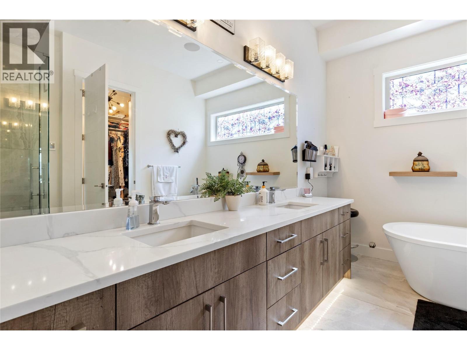 You are going to love the view from this beautifully designed walkout rancher in the sought-after Kirschner Mountain area. Offering 6 bedrooms and 5 bathrooms over 4,200 square feet, this home blends modern luxury with stunning lake and city views. Enjoy the breathtaking scenery the moment you walk inside. The main level features 3 bedrooms, 2 full bathrooms, and a half bath with in-floor heating. Highlights include high ceilings, a gas fireplace, hardwood floors, and an open-concept kitchen with stainless steel KitchenAid appliances. A large sundeck extends the living space outdoors, making it perfect for entertaining. The lower level includes 2 additional bedrooms, a full bathroom, a spacious rec room with a wet bar, and a fantastic soundproofed media room—ideal for sports and movie enthusiasts. There’s also a legal 1-bedroom suite with a private entrance and separate utilities, perfect for rental income or extended family. Additional features include central air conditioning, forced air and baseboard heating (electric and natural gas), a built-in vacuum, and a complete security system with surveillance cameras. The 0.24-acre lot offers a private yard with underground sprinklers and space for a pool. An attached double garage provides ample parking and storage. This is a high-quality home in a quiet, family-friendly neighborhood—ideal for comfortable living and entertaining. (id:6770)